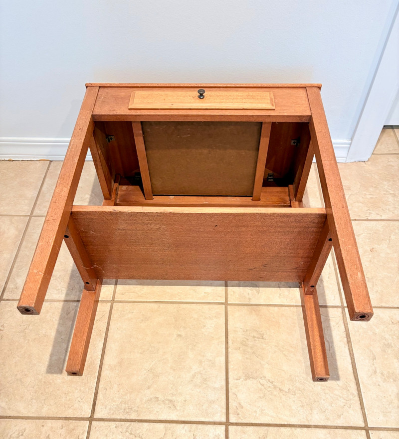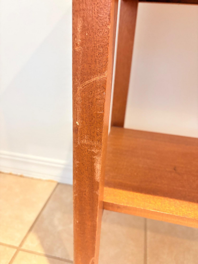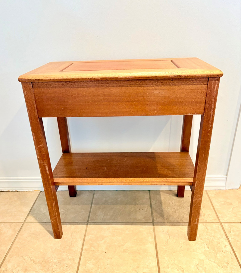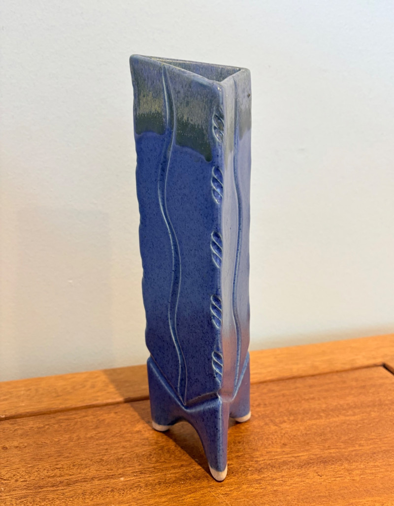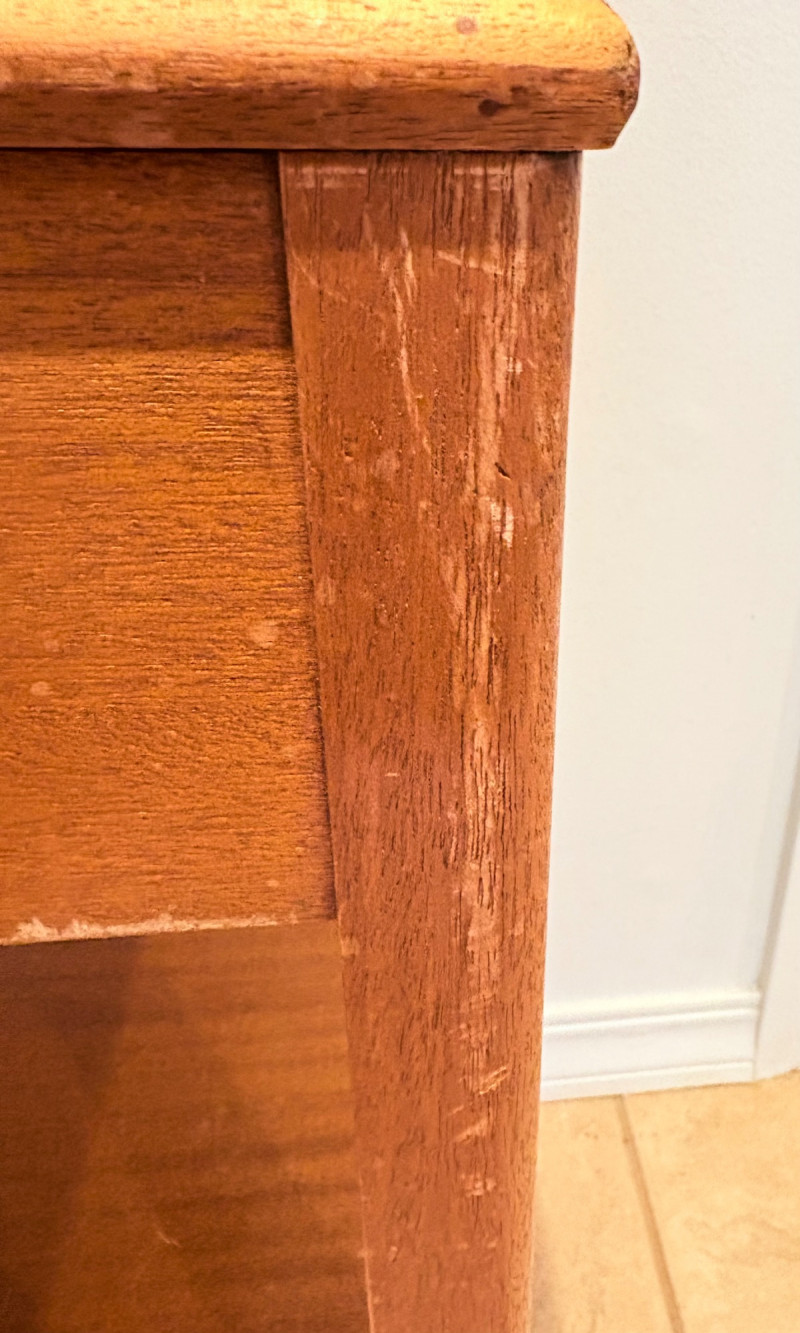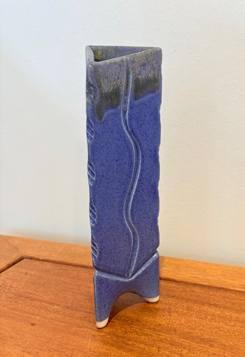 Pairing of lovely artisan-made works of art. Artisan-made wooden side table has beautiful grain and is in very good condition. Mitered top surface with routed center. Pull-out drawer in front and a shelf below. Routed edge on the top and drawer, but straight edges on the legs and shelf. No maker mark, but this is obviously handmade and the drawer has a brown felt liner. Please note that someone has pulled the drawer out vigorously at some point and it is slightly cracked along the back edge. Does not inhibit use or visual appeal - see third to last photo. Measures 27" H x 24.5" W x 13.5" D. Scratches shown in second and last photo are on the backside - not visible unless you have the table in the middle of a room. Purple ceramic vase has abstract incisions and a drip glaze rim. Stands 10.5" H x just over 3" W x 3" D. No flaws noted - maker initials are on the bottom.