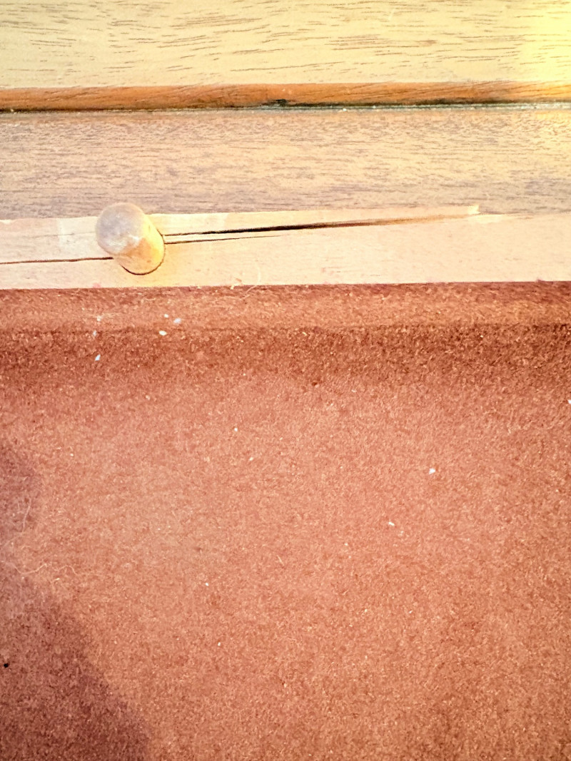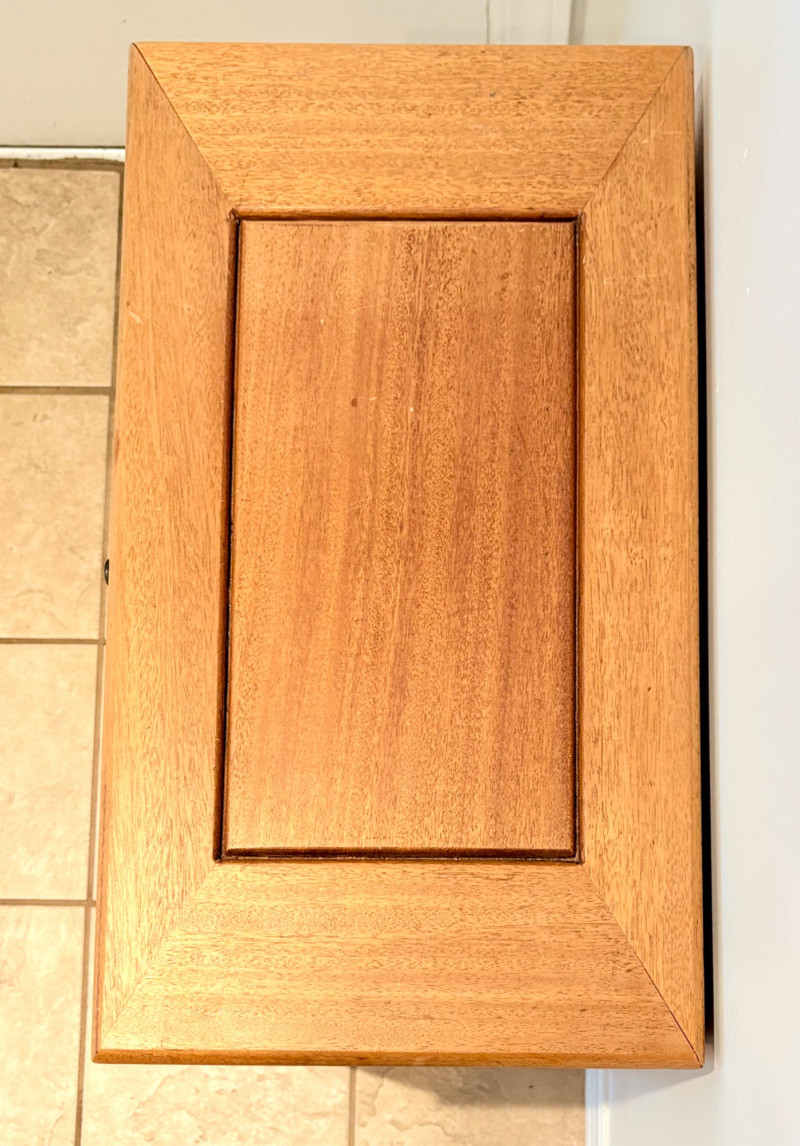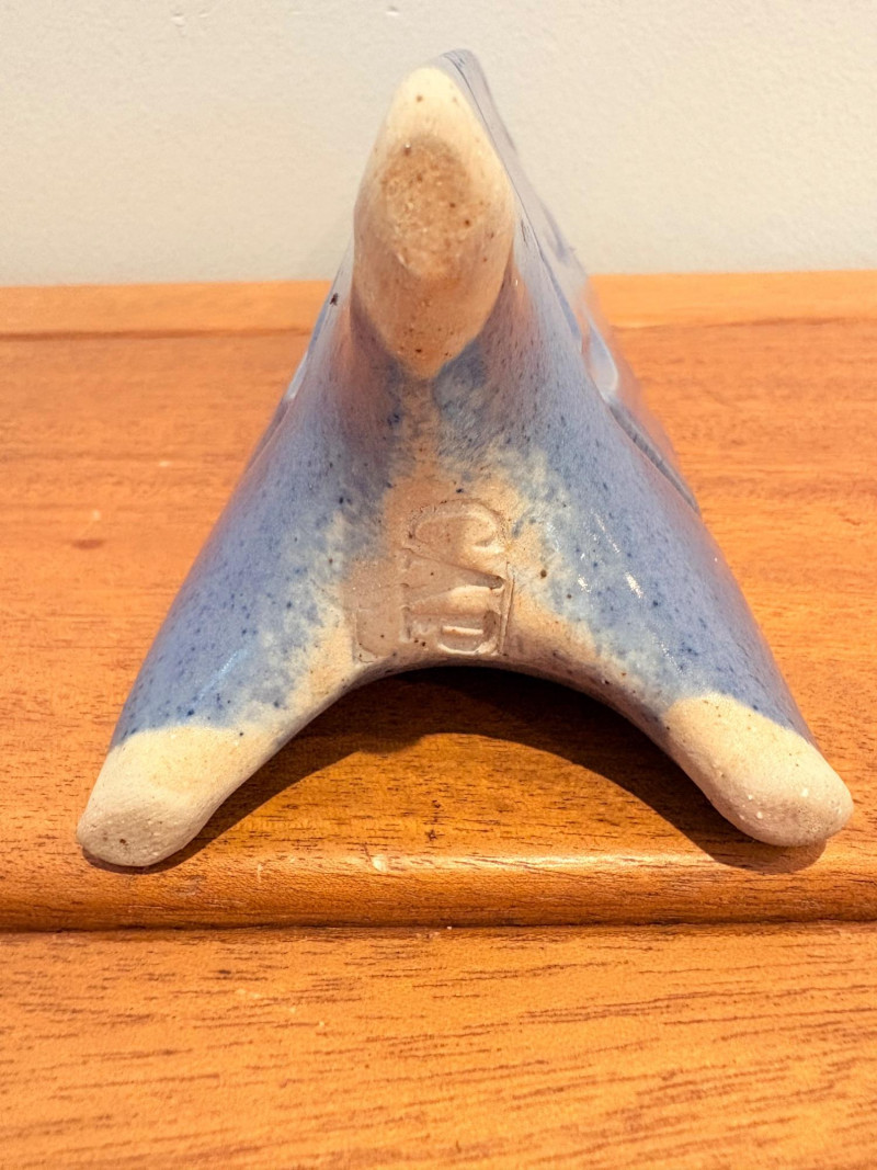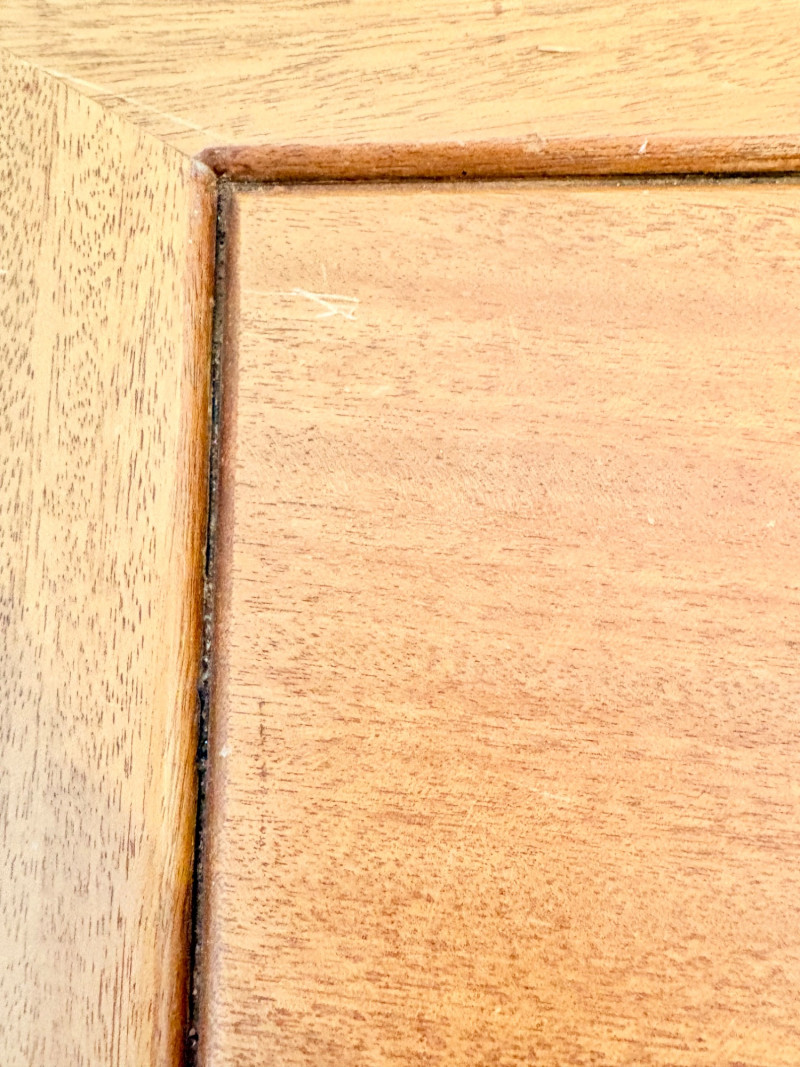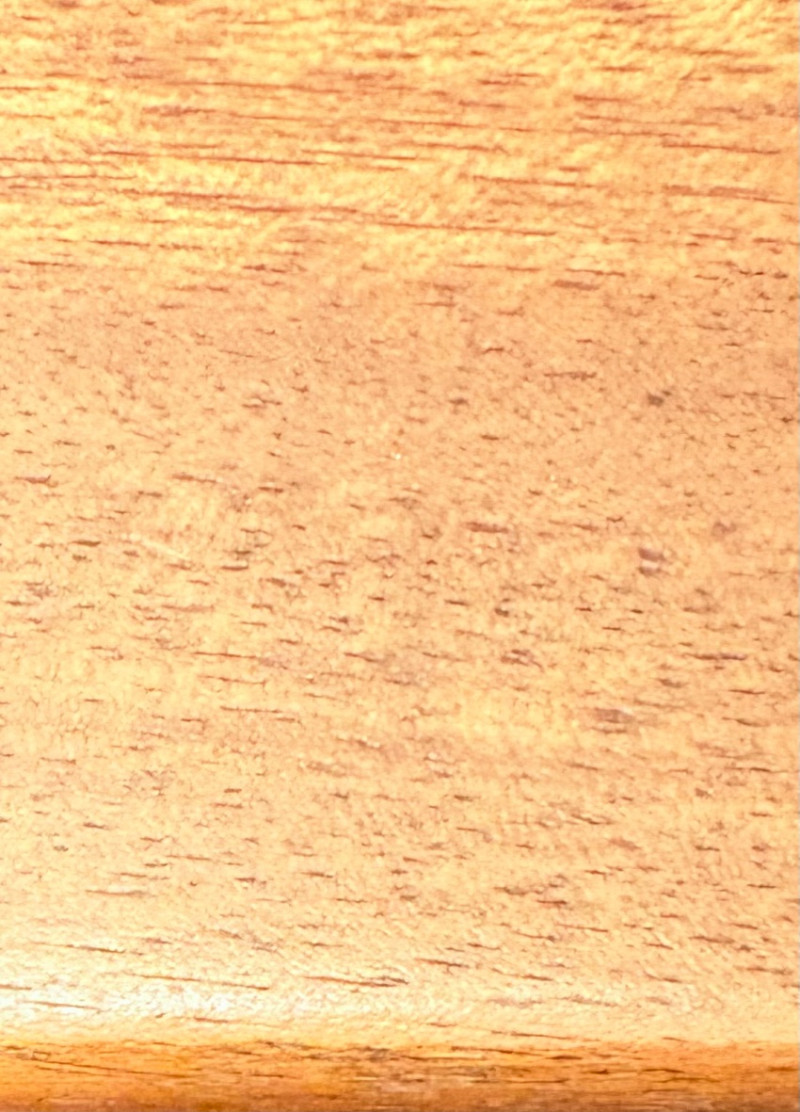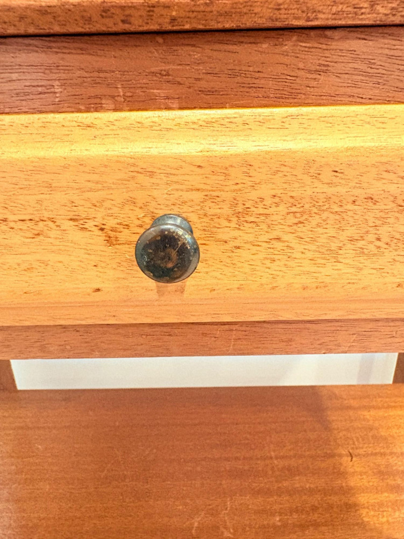 Pairing of lovely artisan-made works of art. Artisan-made wooden side table has beautiful grain and is in very good condition. Mitered top surface with routed center. Pull-out drawer in front and a shelf below. Routed edge on the top and drawer, but straight edges on the legs and shelf. No maker mark, but this is obviously handmade and the drawer has a brown felt liner. Please note that someone has pulled the drawer out vigorously at some point and it is slightly cracked along the back edge. Does not inhibit use or visual appeal - see third to last photo. Measures 27" H x 24.5" W x 13.5" D. Scratches shown in second and last photo are on the backside - not visible unless you have the table in the middle of a room. Purple ceramic vase has abstract incisions and a drip glaze rim. Stands 10.5" H x just over 3" W x 3" D. No flaws noted - maker initials are on the bottom.