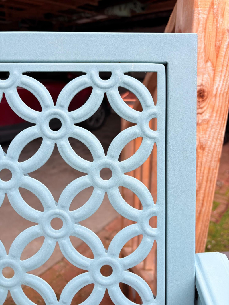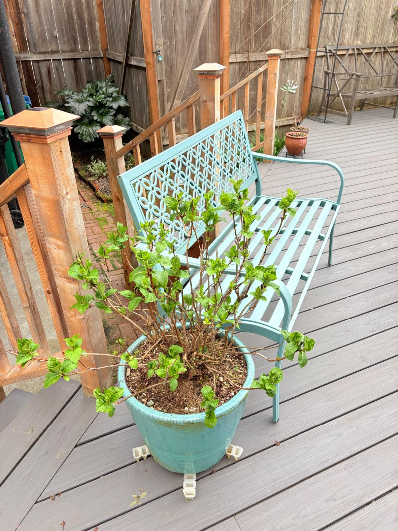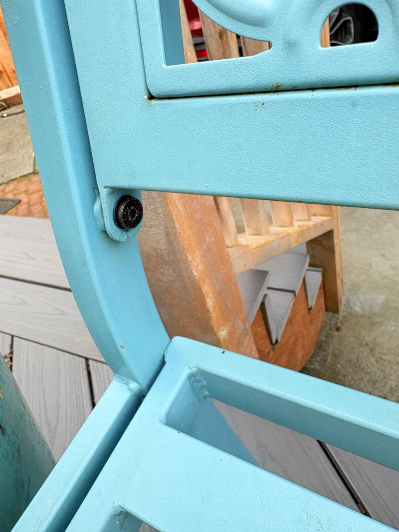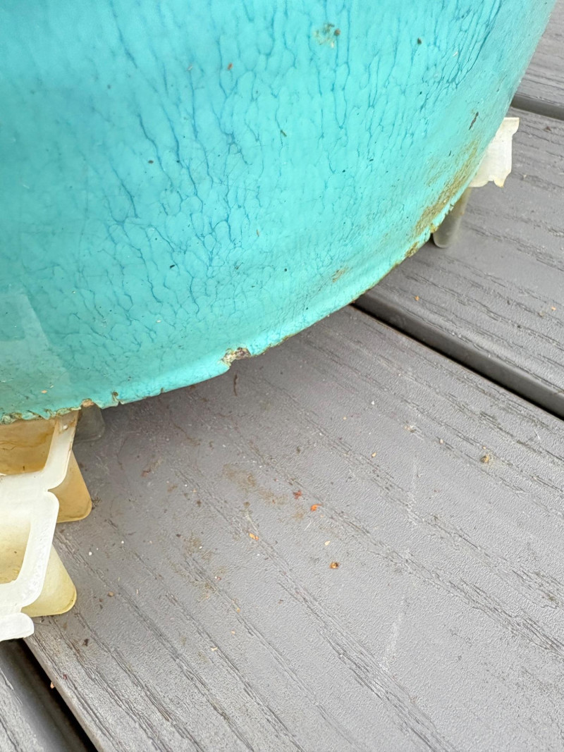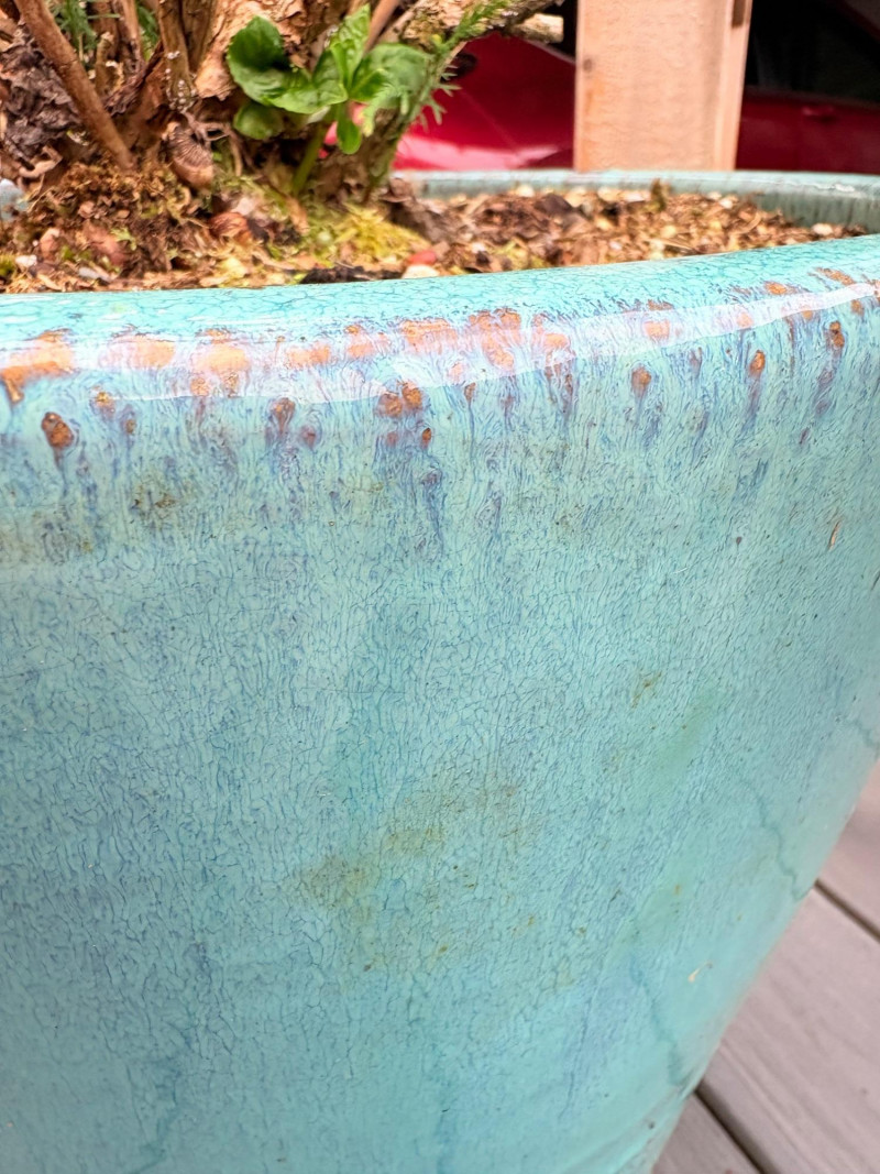 Gorgeous teal-colored outdoor bench from maker Grand Patio. The bench has a rosette back and slotted bench along with curved arms and slightly shaped seat areas. Measures 34" H x 49.5" W x 21.5" D. Very solid feeling and in good cosmetic shape - appears to be able to be disassembled with an Allen wrench Paired with lovely hydrangea just starting to bud out in the same color ceramic pot. Pot measures approximately 14" H with a diameter of approximately 16”. Pot exterior needs to be scrubbed to remove green growth and there are a few small imperfections along the base that barely show - see last photo. For sale elsewhere: