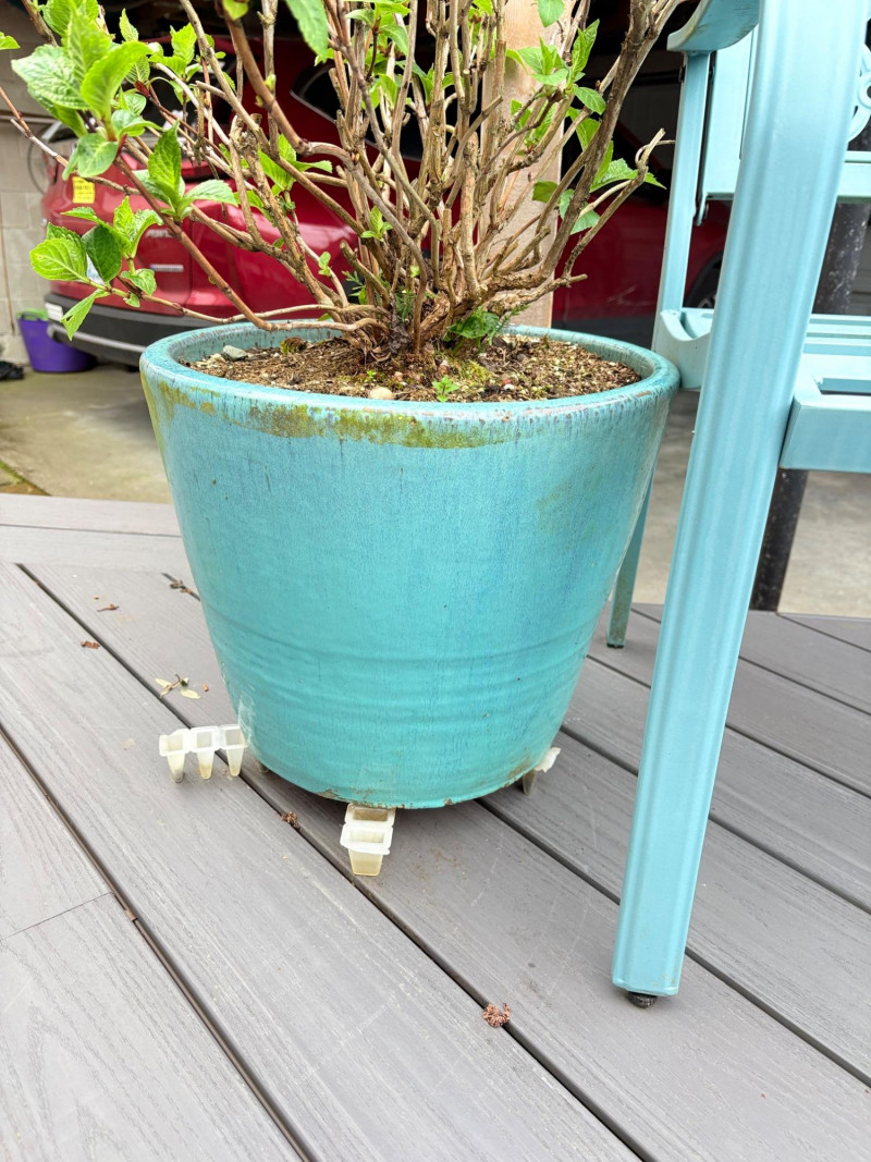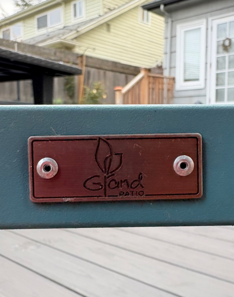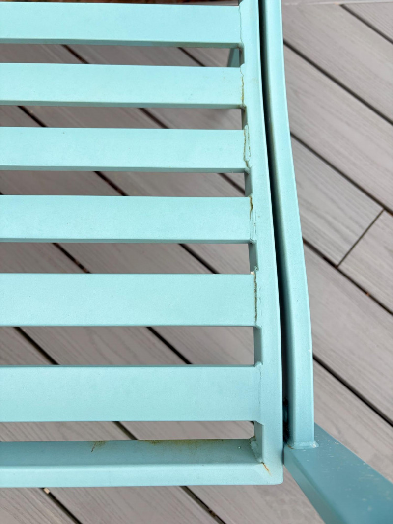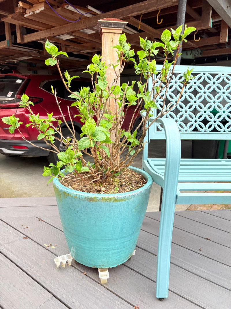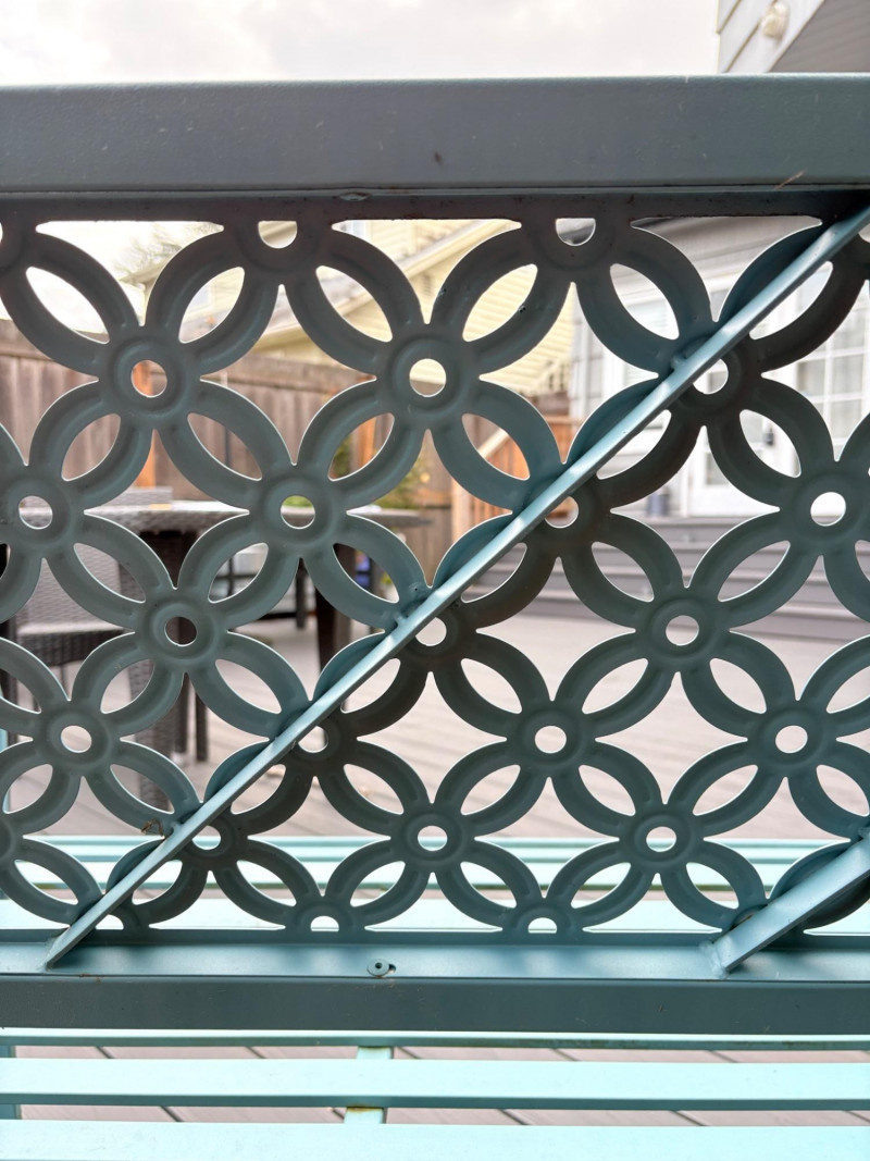 Gorgeous teal-colored outdoor bench from maker Grand Patio. The bench has a rosette back and slotted bench along with curved arms and slightly shaped seat areas. Measures 34" H x 49.5" W x 21.5" D. Very solid feeling and in good cosmetic shape - appears to be able to be disassembled with an Allen wrench Paired with lovely hydrangea just starting to bud out in the same color ceramic pot. Pot measures approximately 14" H with a diameter of approximately 16”. Pot exterior needs to be scrubbed to remove green growth and there are a few small imperfections along the base that barely show - see last photo. For sale elsewhere: