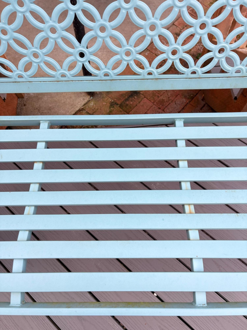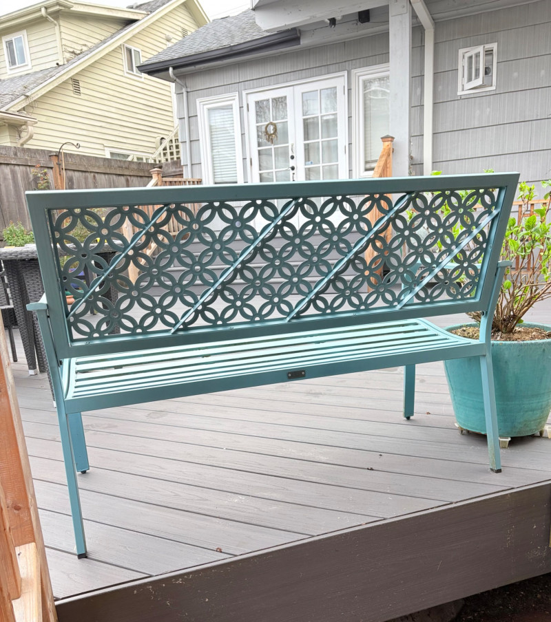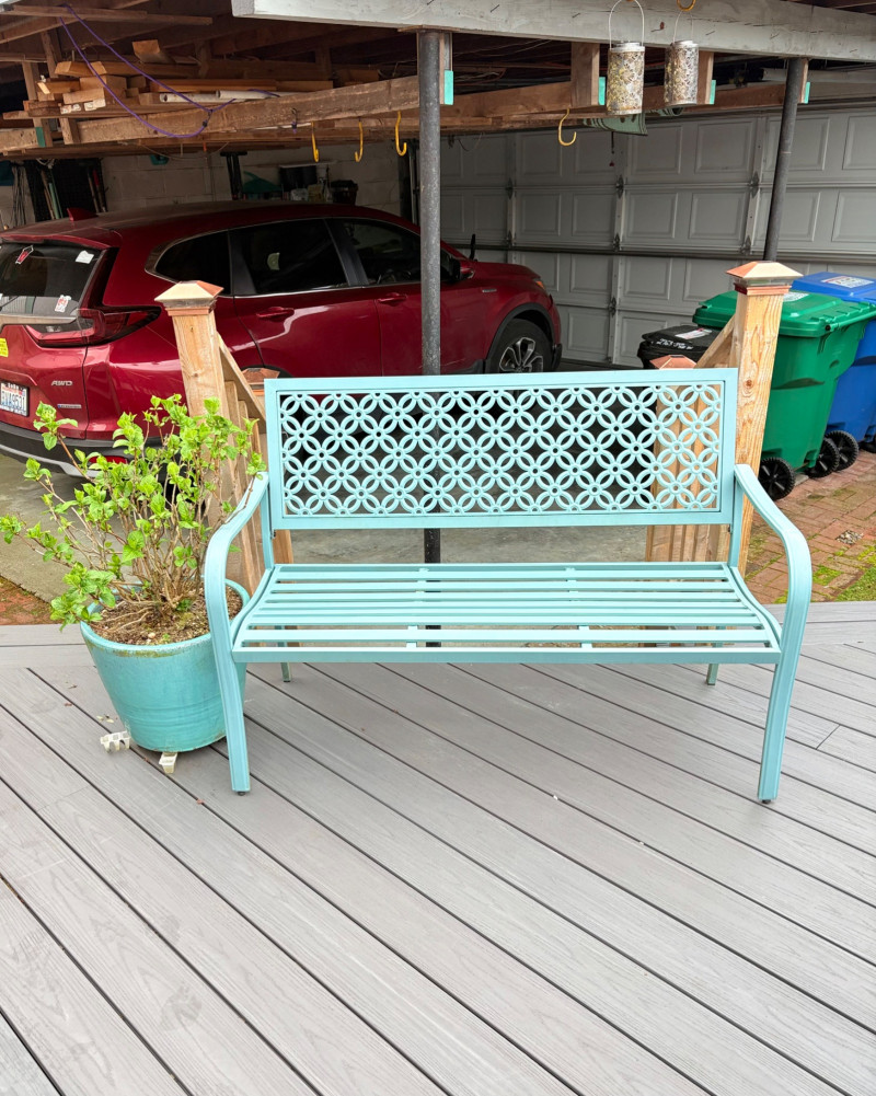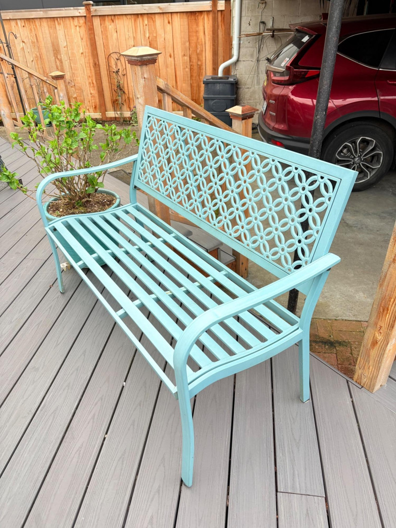 Lot # 72 - Grand Patio Teal Metal Outdoor Bench + Hydrangea