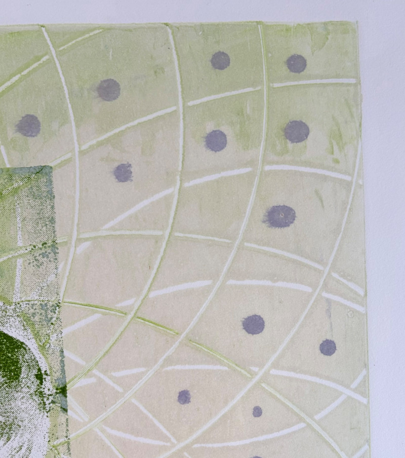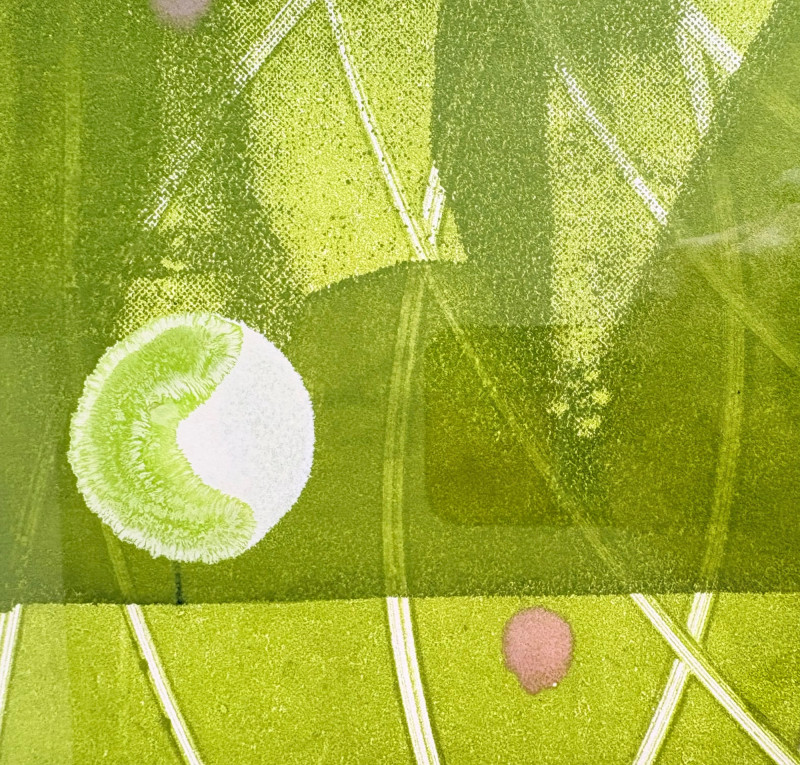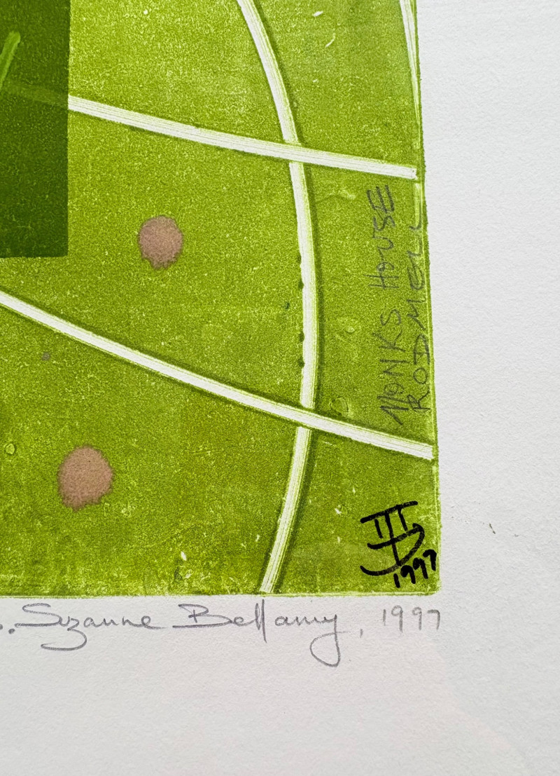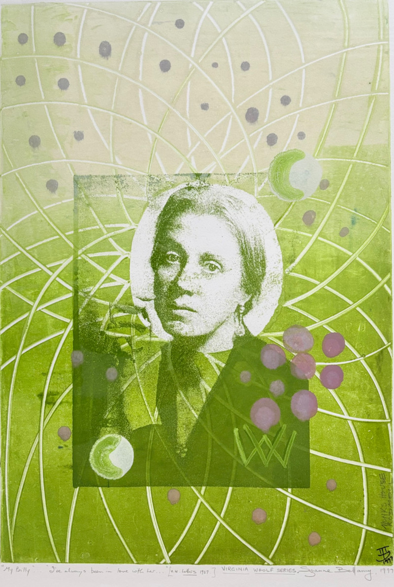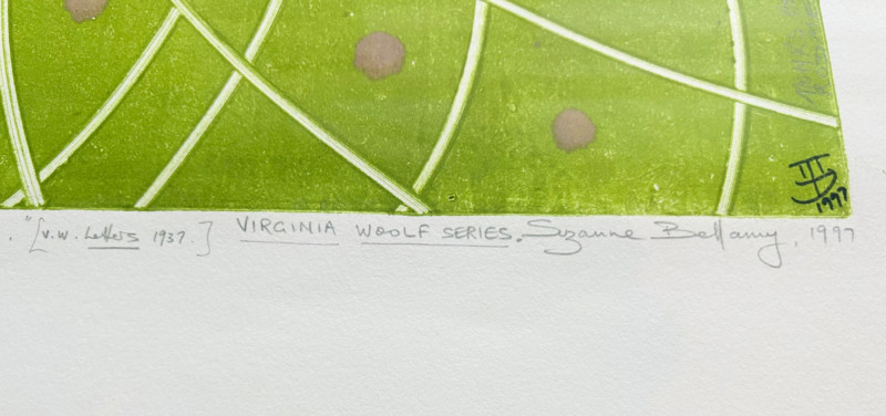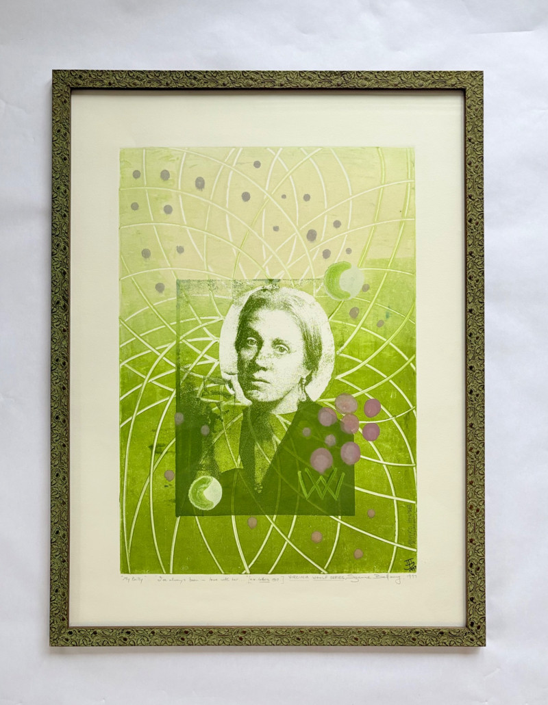 "My Billy - I’ve Always Been in Love with Her" print from Suzanne Bellamy's Virginia Woolf Series (1997). This is a superb print from Australian artist Suzanne Bellamy. The apple green ink that dominates this print is softened by the lilac purple circles scattered across the surface. We love love the halo-like effect highlighting the the subject's face and find the frame selection to be interesting - ornate top surface moving to sleek design on the sides - perhaps our client's way of portraying the transition between Victorian era to Art Deco? In any case, the frame is a gorgeous green wood perfectly setting off the tones of the print. Signed and dated by the artist in pencil in the lower margin with additional marks/info on the lower right of the print. Measures 31.5" H x 23.5" H framed. *The title is taken from Virginia Woolf's letters from 1937,