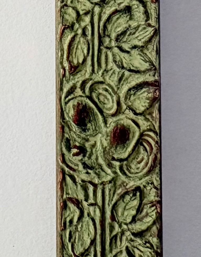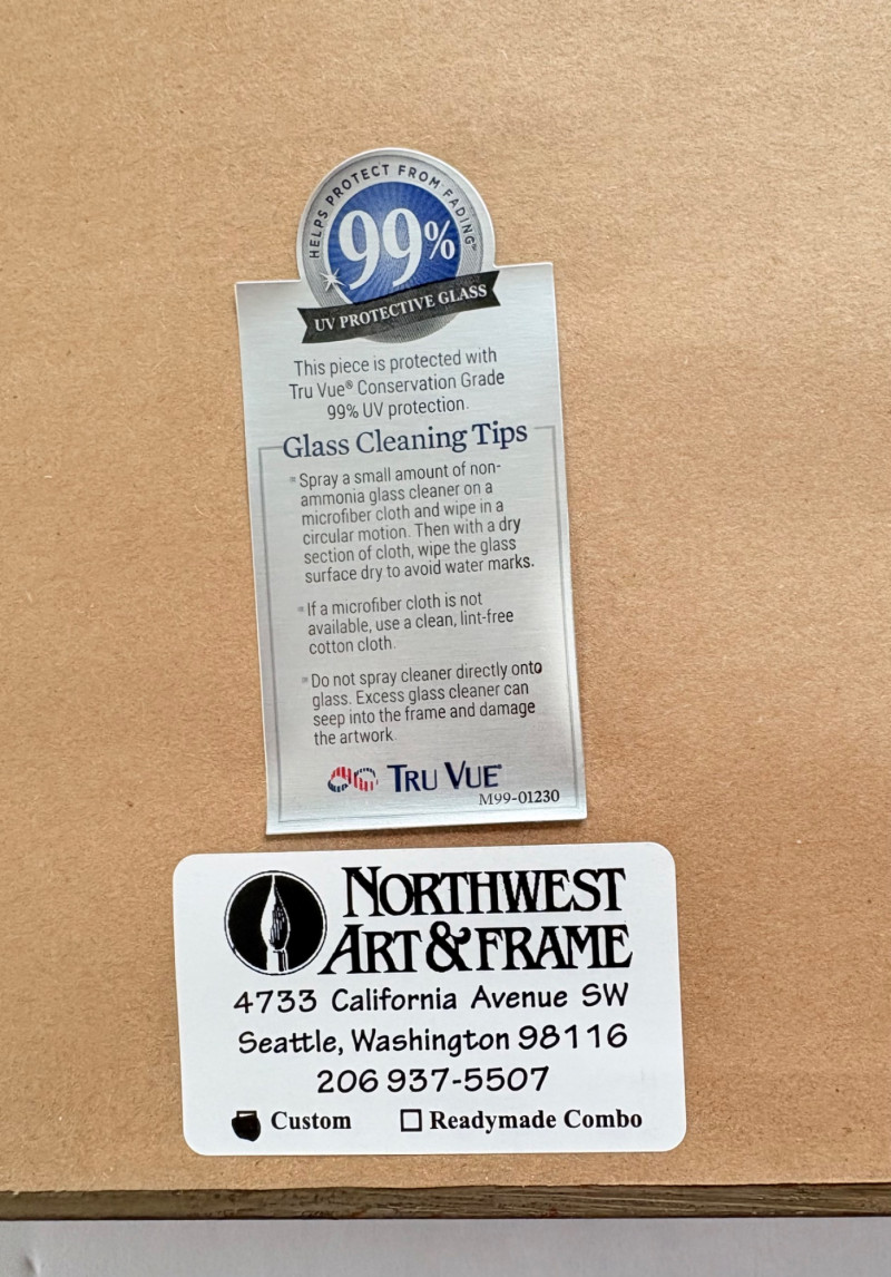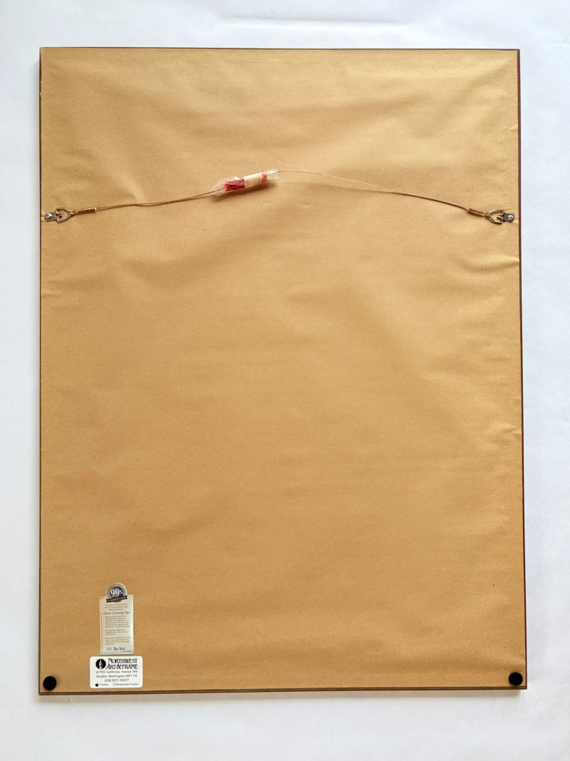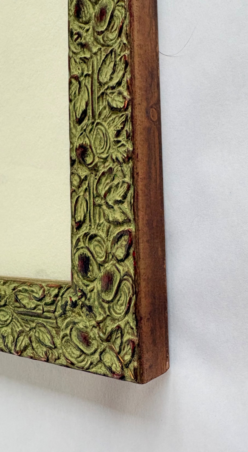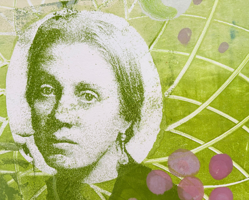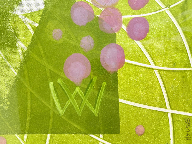 "My Billy - I’ve Always Been in Love with Her" print from Suzanne Bellamy's Virginia Woolf Series (1997). This is a superb print from Australian artist Suzanne Bellamy. The apple green ink that dominates this print is softened by the lilac purple circles scattered across the surface. We love love the halo-like effect highlighting the the subject's face and find the frame selection to be interesting - ornate top surface moving to sleek design on the sides - perhaps our client's way of portraying the transition between Victorian era to Art Deco? In any case, the frame is a gorgeous green wood perfectly setting off the tones of the print. Signed and dated by the artist in pencil in the lower margin with additional marks/info on the lower right of the print. Measures 31.5" H x 23.5" H framed. *The title is taken from Virginia Woolf's letters from 1937,