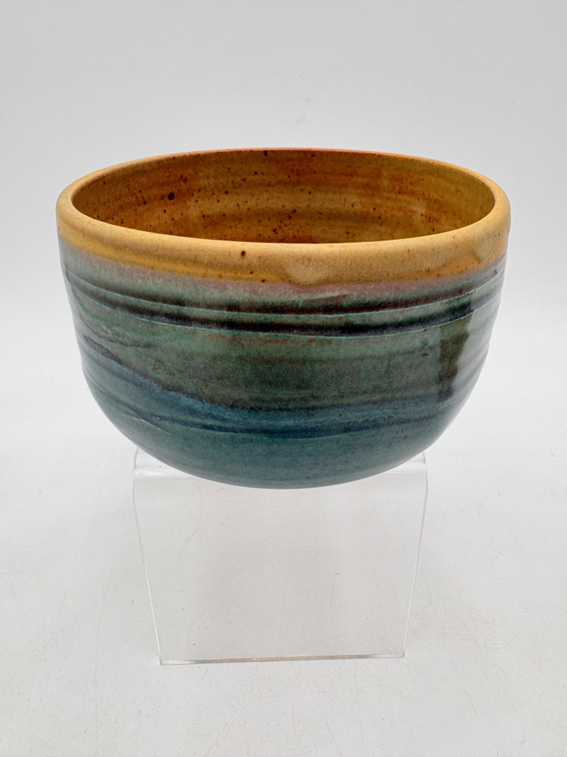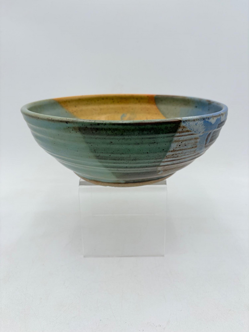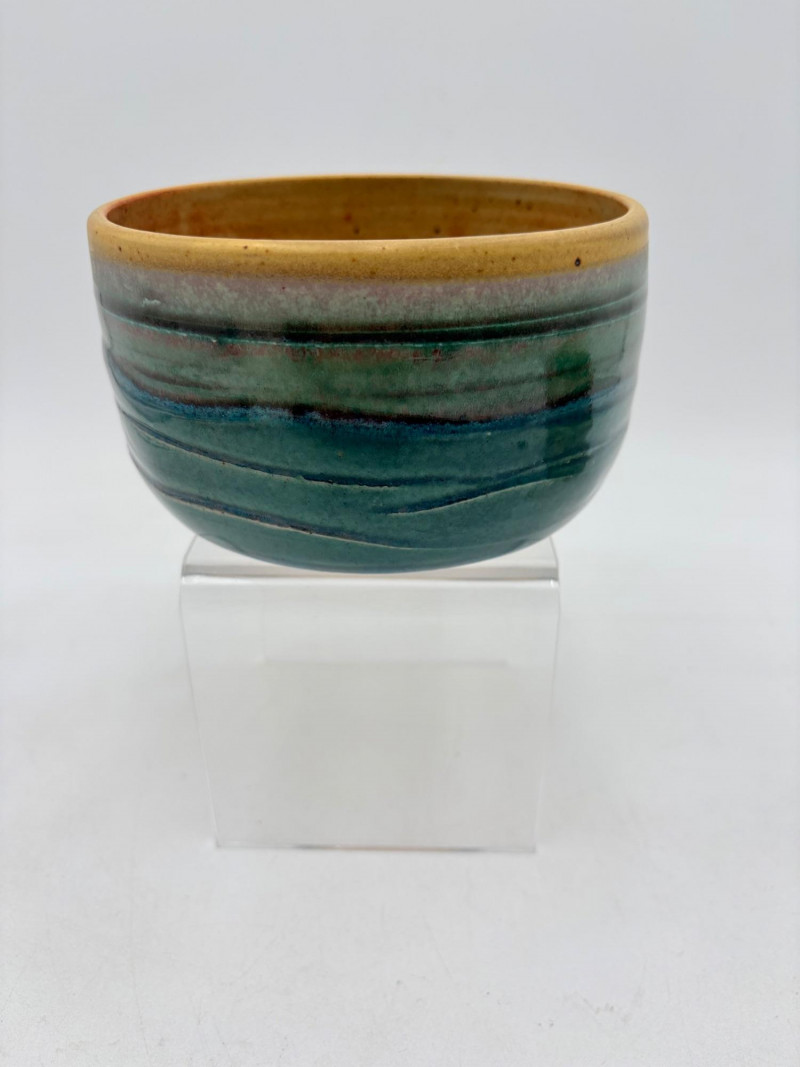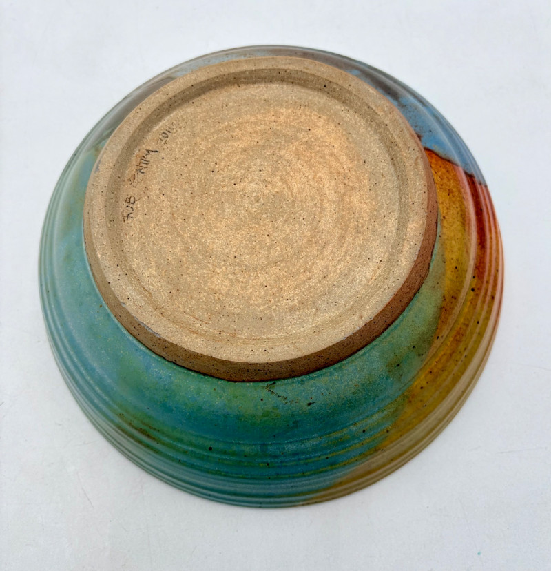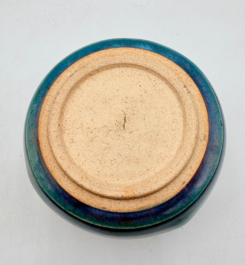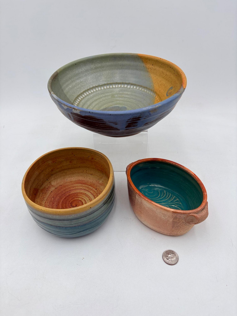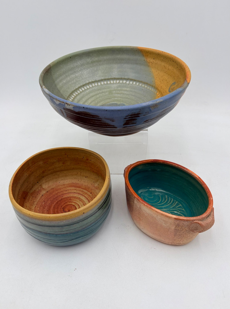 Beautiful trio of functional ceramic art. - Large multi-colored bowl with inside decorative incised ring is artist signed on bottom. Measures 3.25" x 9.5" diameter. - Squarish bowl in green tones with brown-yellow interior is artist signed on bottom. Measures 3.25" H x 6" diameter. - Oval-shaped container with rough exterior and smooth glazed interior is artist signed on bottom. Measures 2.75" H x 6.5" L x 4" W.