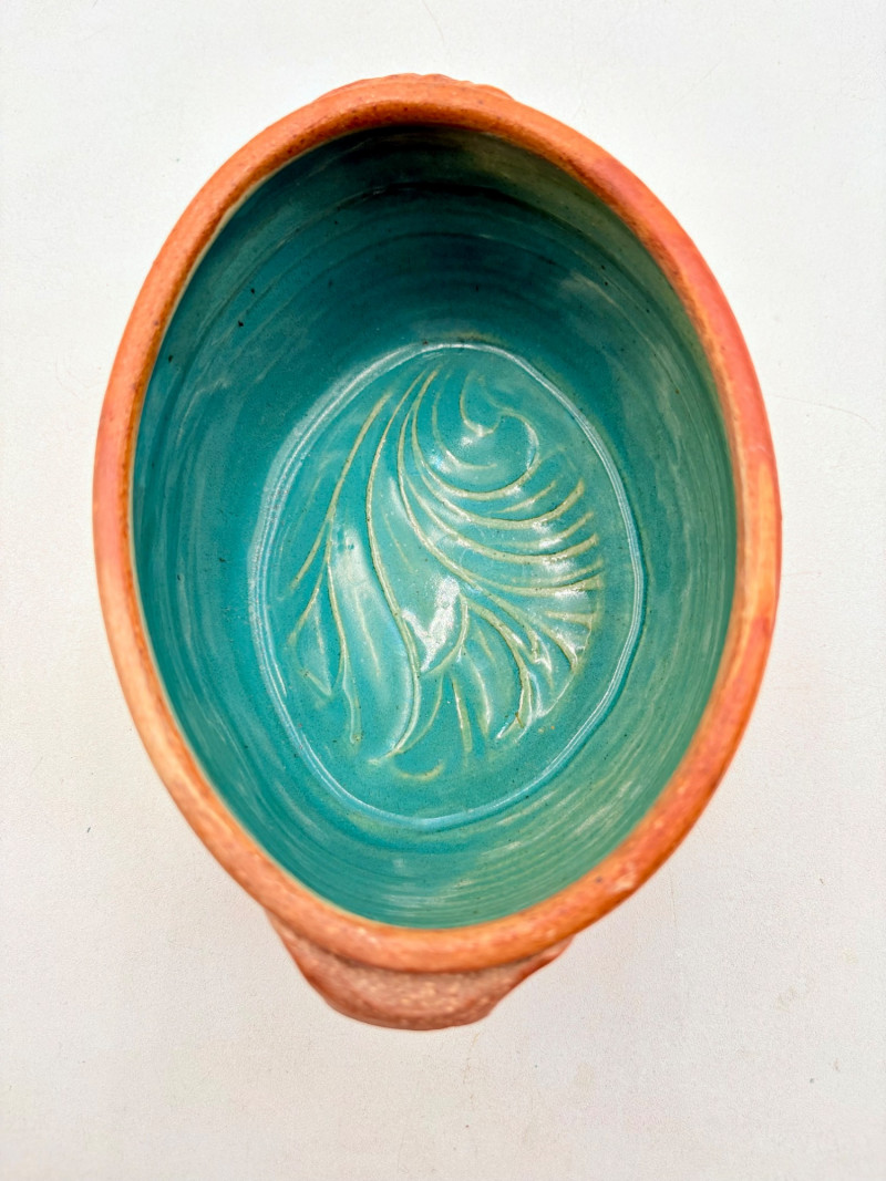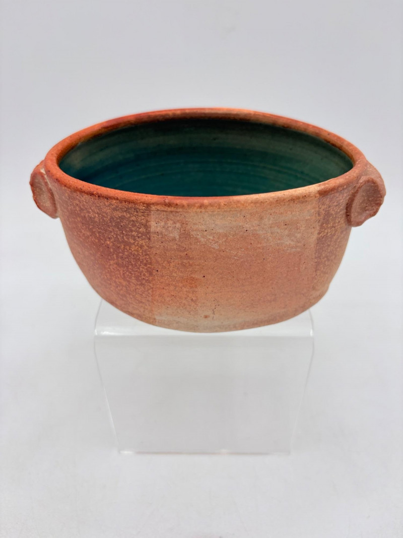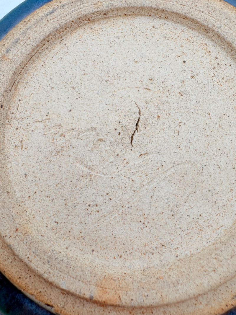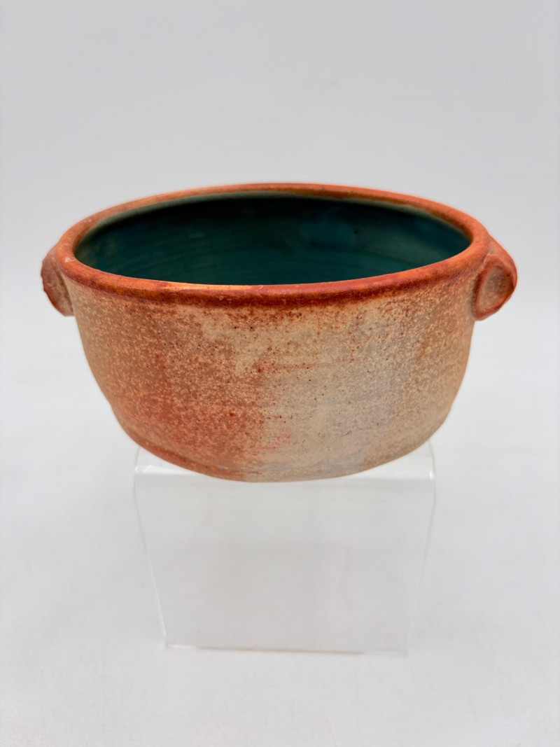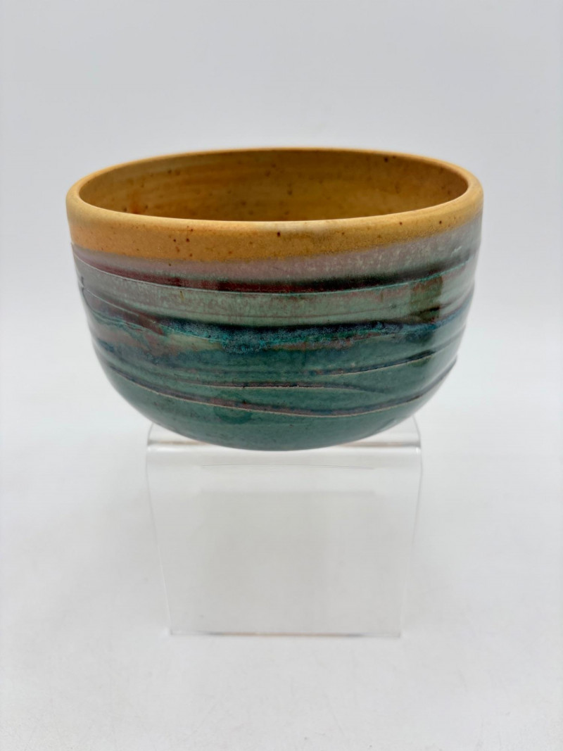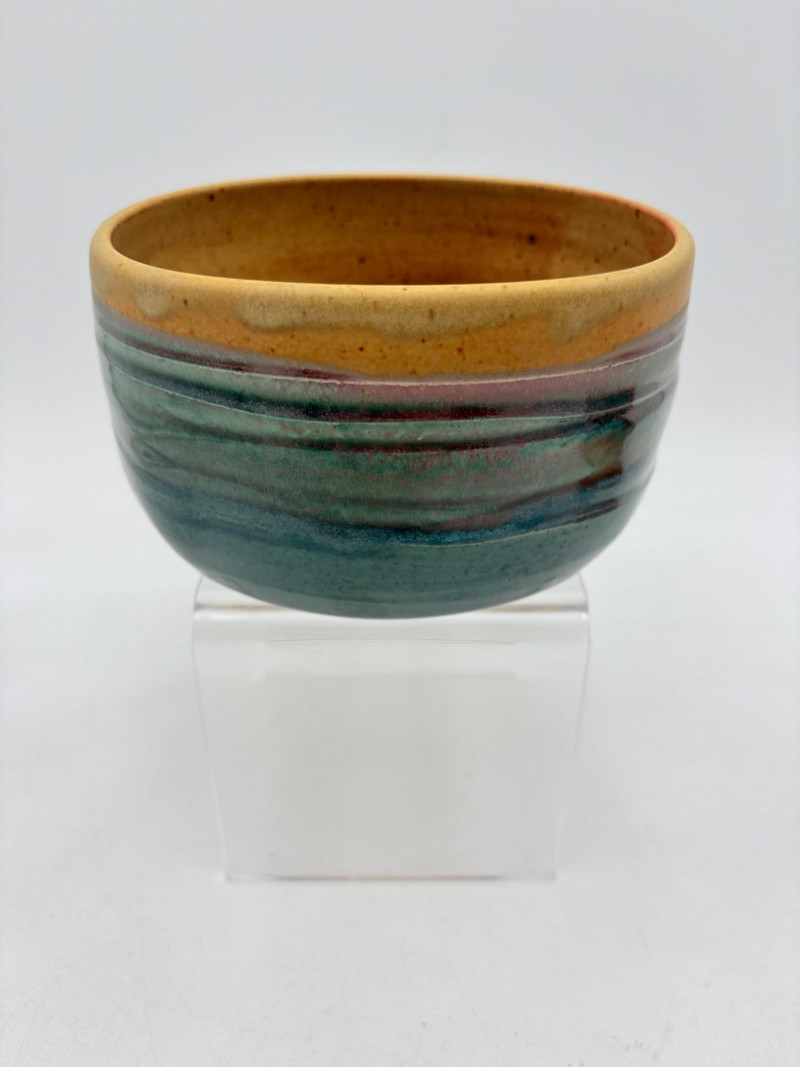 Beautiful trio of functional ceramic art. - Large multi-colored bowl with inside decorative incised ring is artist signed on bottom. Measures 3.25" x 9.5" diameter. - Squarish bowl in green tones with brown-yellow interior is artist signed on bottom. Measures 3.25" H x 6" diameter. - Oval-shaped container with rough exterior and smooth glazed interior is artist signed on bottom. Measures 2.75" H x 6.5" L x 4" W.