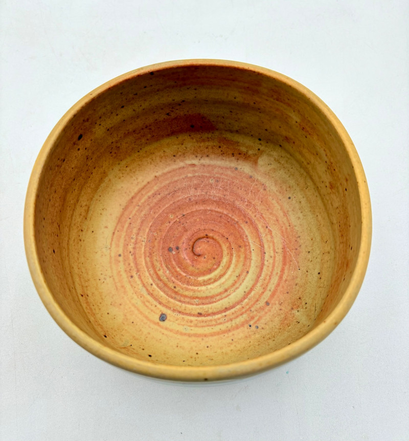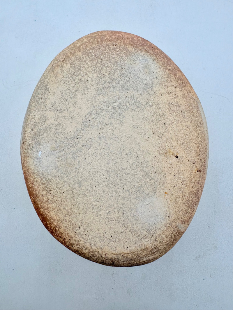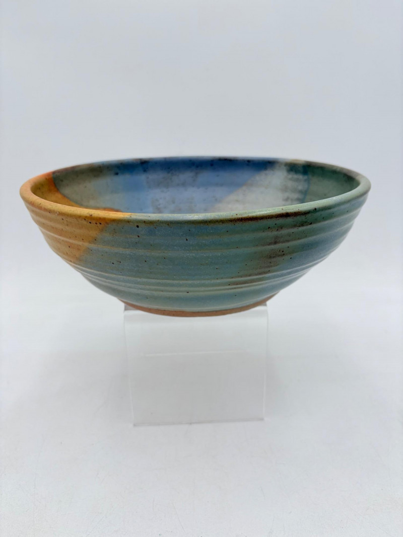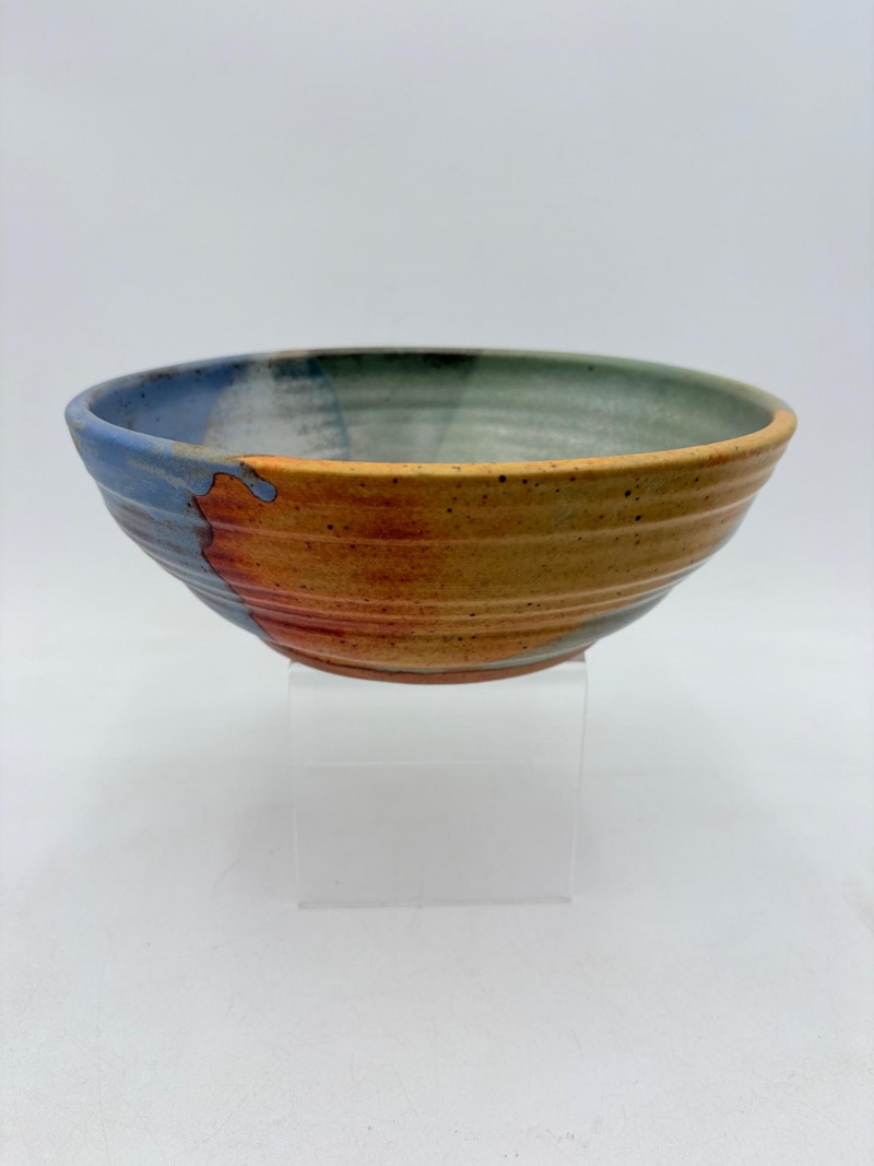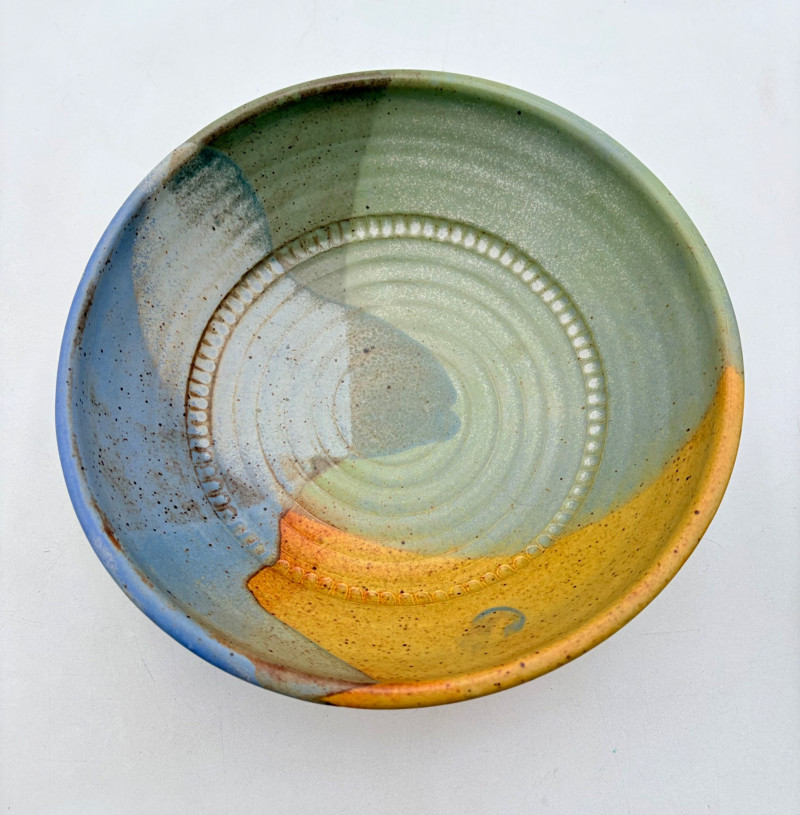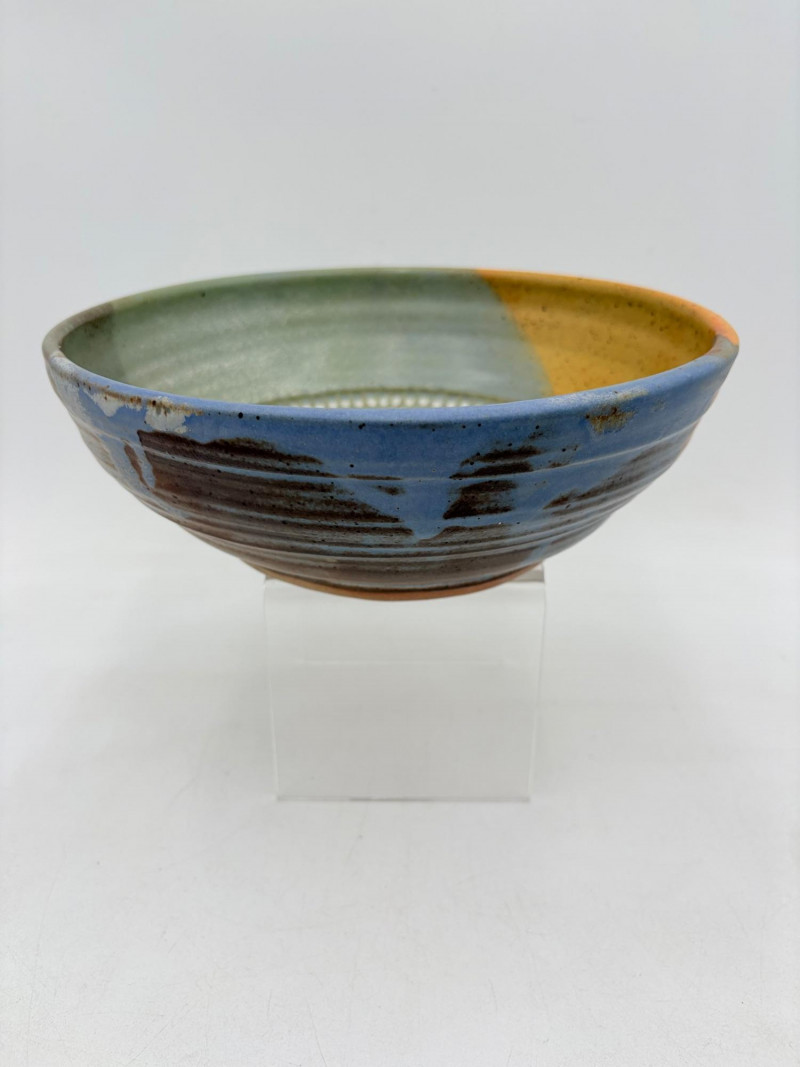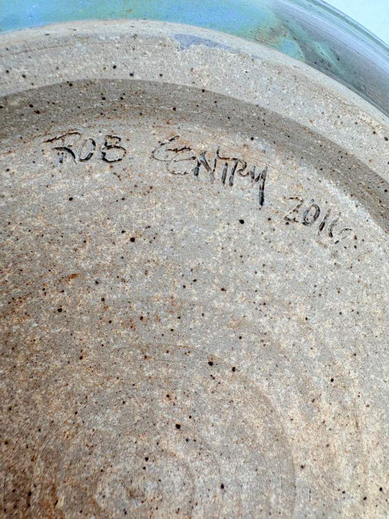 Beautiful trio of functional ceramic art. - Large multi-colored bowl with inside decorative incised ring is artist signed on bottom. Measures 3.25" x 9.5" diameter. - Squarish bowl in green tones with brown-yellow interior is artist signed on bottom. Measures 3.25" H x 6" diameter. - Oval-shaped container with rough exterior and smooth glazed interior is artist signed on bottom. Measures 2.75" H x 6.5" L x 4" W.