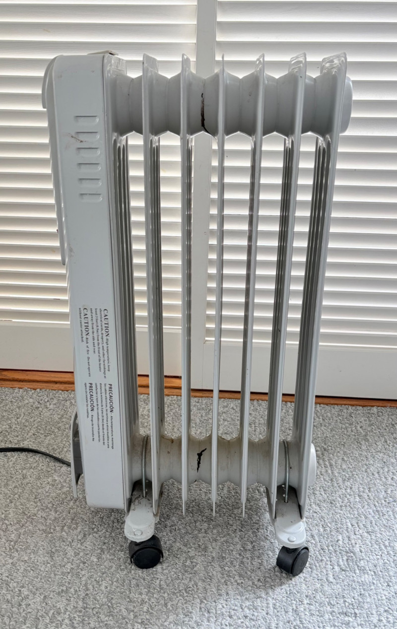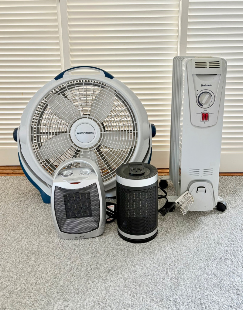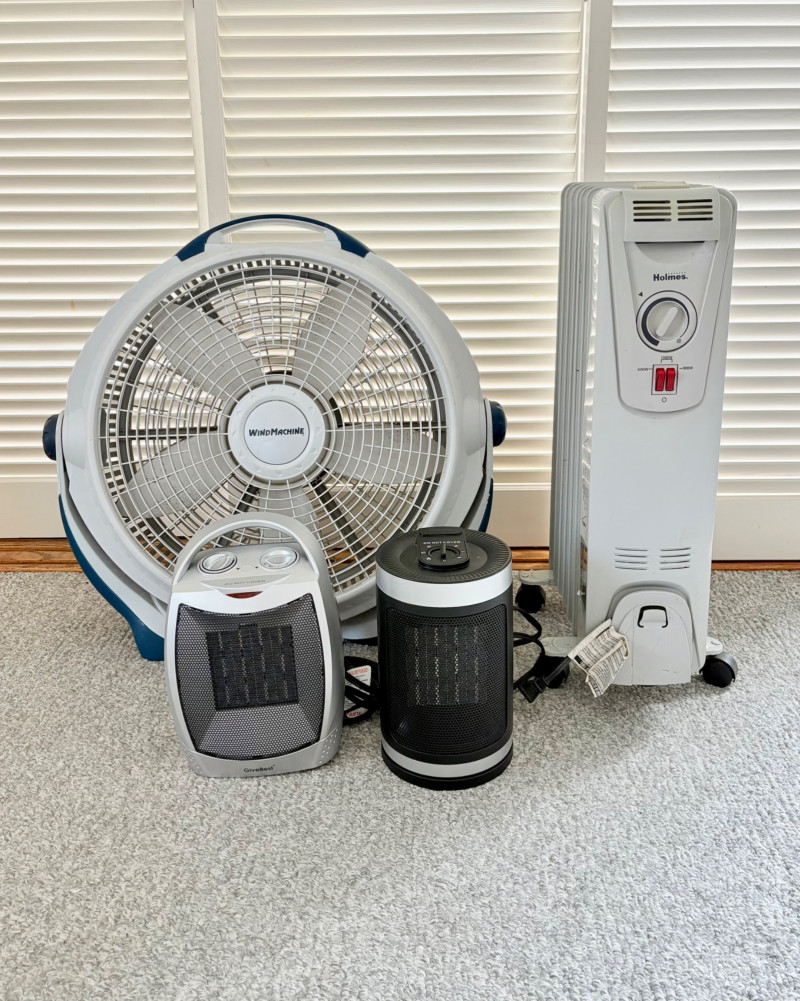 These appliances can keep you comfortable year-round in the heat and the cold! All powered up and worked when tested. Lasko Wind Machine circular fan. 3 speeds. Measures 24" H x 25" W (needs a good scrub). PTC fan/heater combo for year-round use. Measures 9.5" H x 6" diameter. GiveBest fan/heater combo has 2 speeds with adjustable temperature. Measures 10.5" H x 7" W. Holmes oil radiator is an efficient way to heat a room with a choice of wattage. Stands 25" H x 6" W x 14" D (needs a scrub).