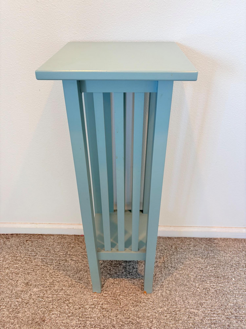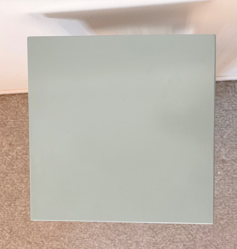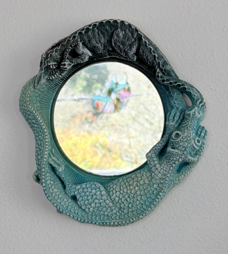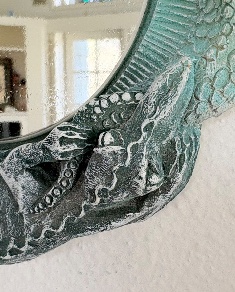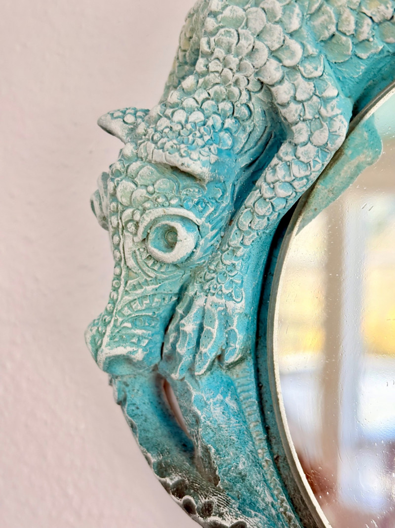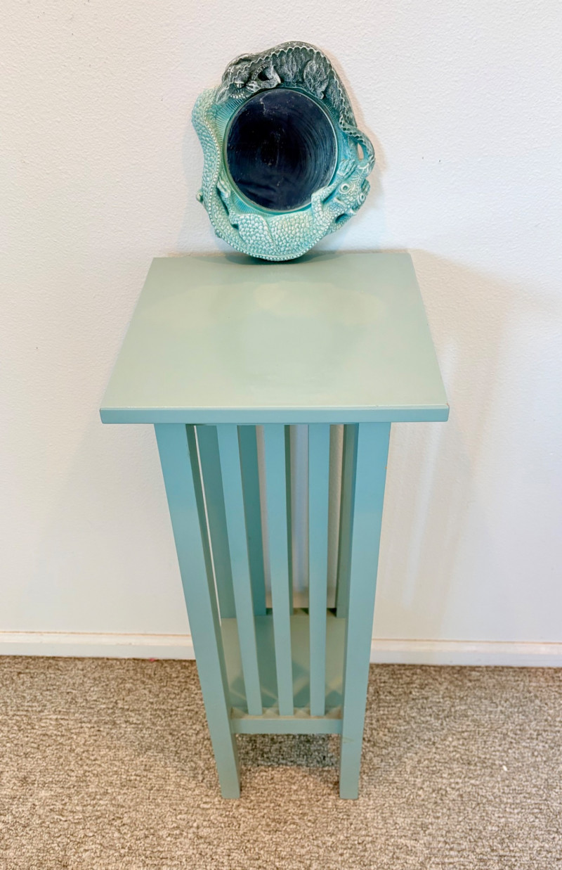 Small Shaker-style table with slightly shaped lower legs in rich green/teal. In very good condition - surface is virtually unmarred and there are only a couple of flaws - see last picture for most egregious. Measures approx. 31.5" H x 12" square. From Newton Buying Corporation. Double dragon mirror would look fabulous hung right above the table at your entrance. Round mirror is encircled by two dragons biting each other’s tail in dark teal fading to pale teal. Appears to be artist-made given the plaster of casting. Mirror measures approximately 5" in diameter with the whole piece measuring about 8.5" H. Can be positioned with either dragon on top as there are hooks for both on the verso.