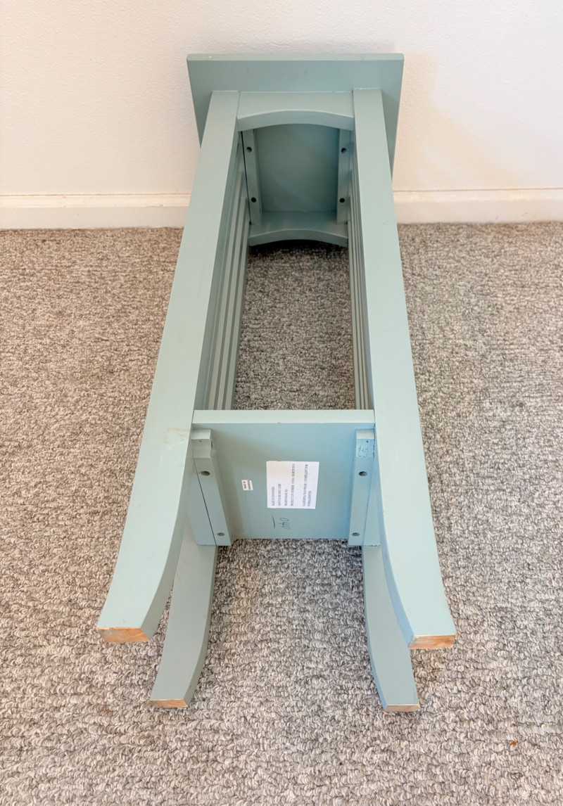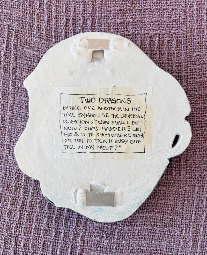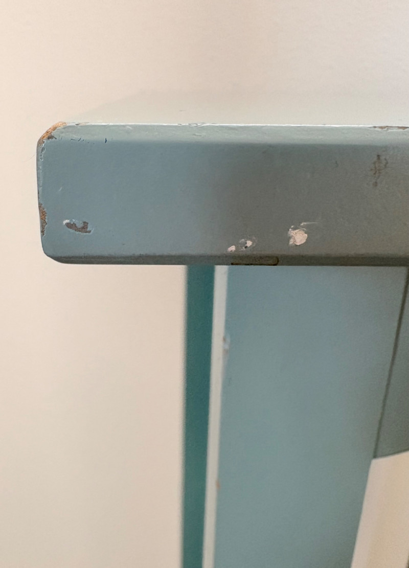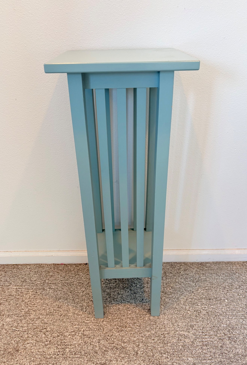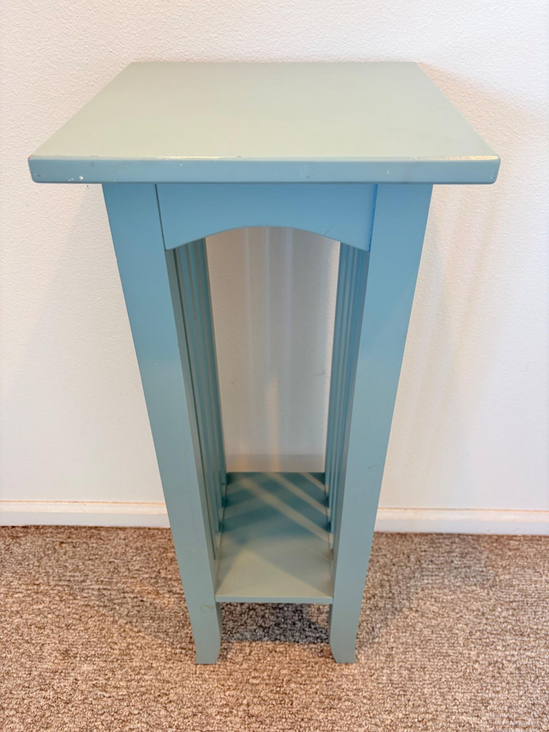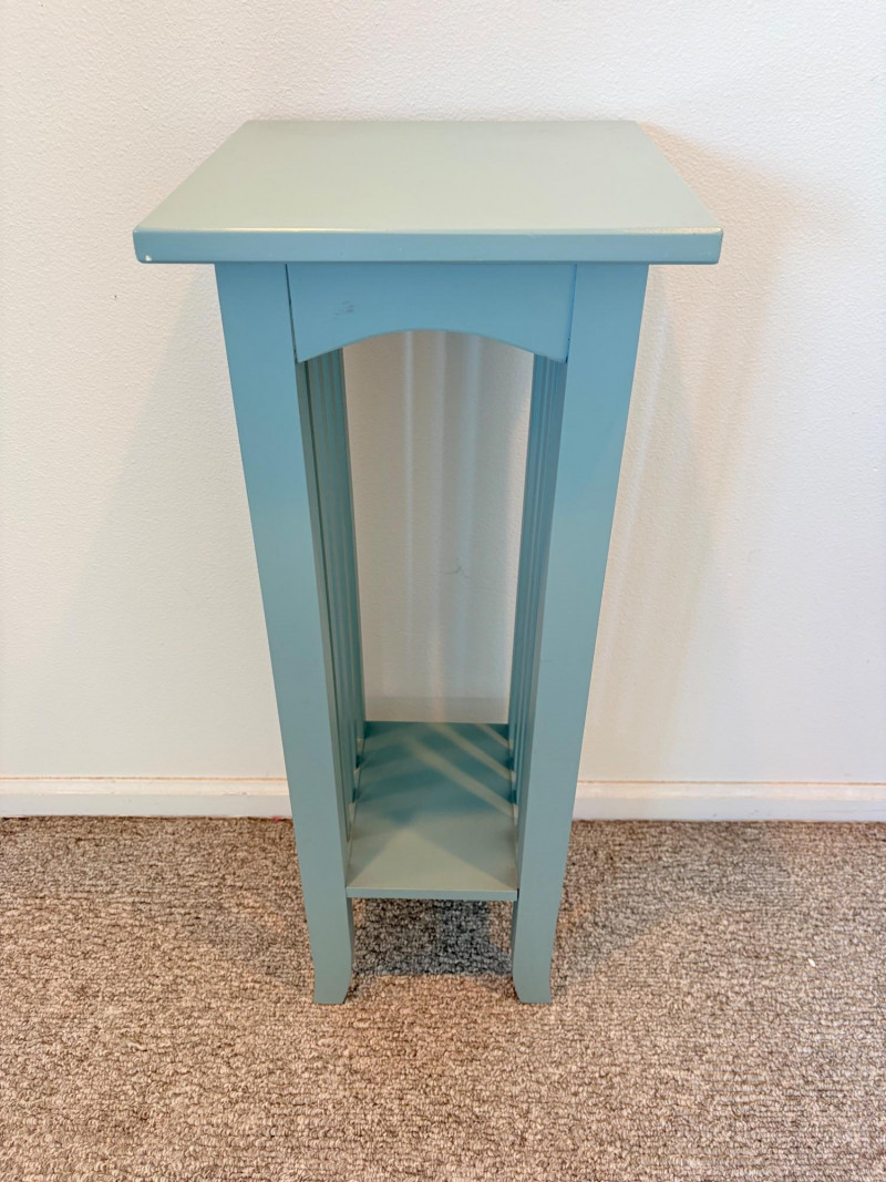 Small Shaker-style table with slightly shaped lower legs in rich green/teal. In very good condition - surface is virtually unmarred and there are only a couple of flaws - see last picture for most egregious. Measures approx. 31.5" H x 12" square. From Newton Buying Corporation. Double dragon mirror would look fabulous hung right above the table at your entrance. Round mirror is encircled by two dragons biting each other’s tail in dark teal fading to pale teal. Appears to be artist-made given the plaster of casting. Mirror measures approximately 5" in diameter with the whole piece measuring about 8.5" H. Can be positioned with either dragon on top as there are hooks for both on the verso.