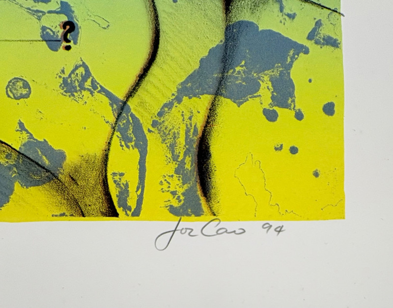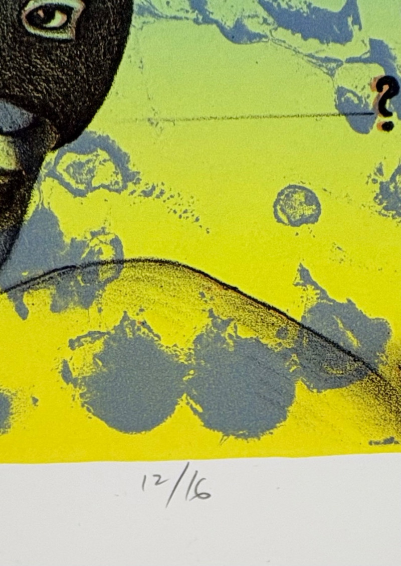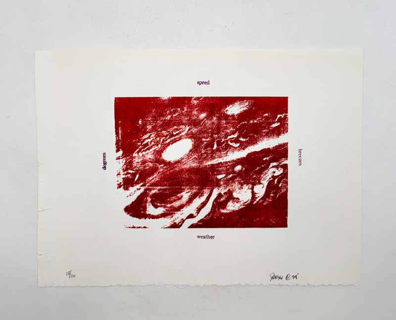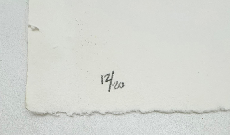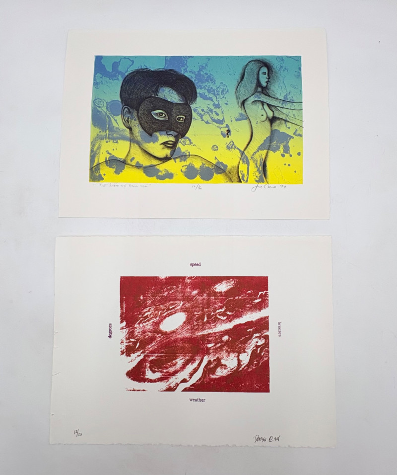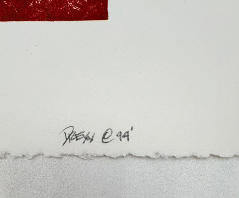 "Looking for the Joy of Fun" (AI translation) print by Loc Cao. This is #12 of an edition of 16. Measures 11" H x 15" W unframed. "Untitled" print in rusty color by Drew T. Long. This is #12 of an edition of 20. Measures 11" H x 15" W unframed. Note that there are some small rips along one edge of the print paper - doesn't affect the print & would still be fine to float - see last photo. Both pieces from the Order/Disorder Portfolio of Exchange Prints published in 1994. Both are signed & numbered by the artist in pencil.