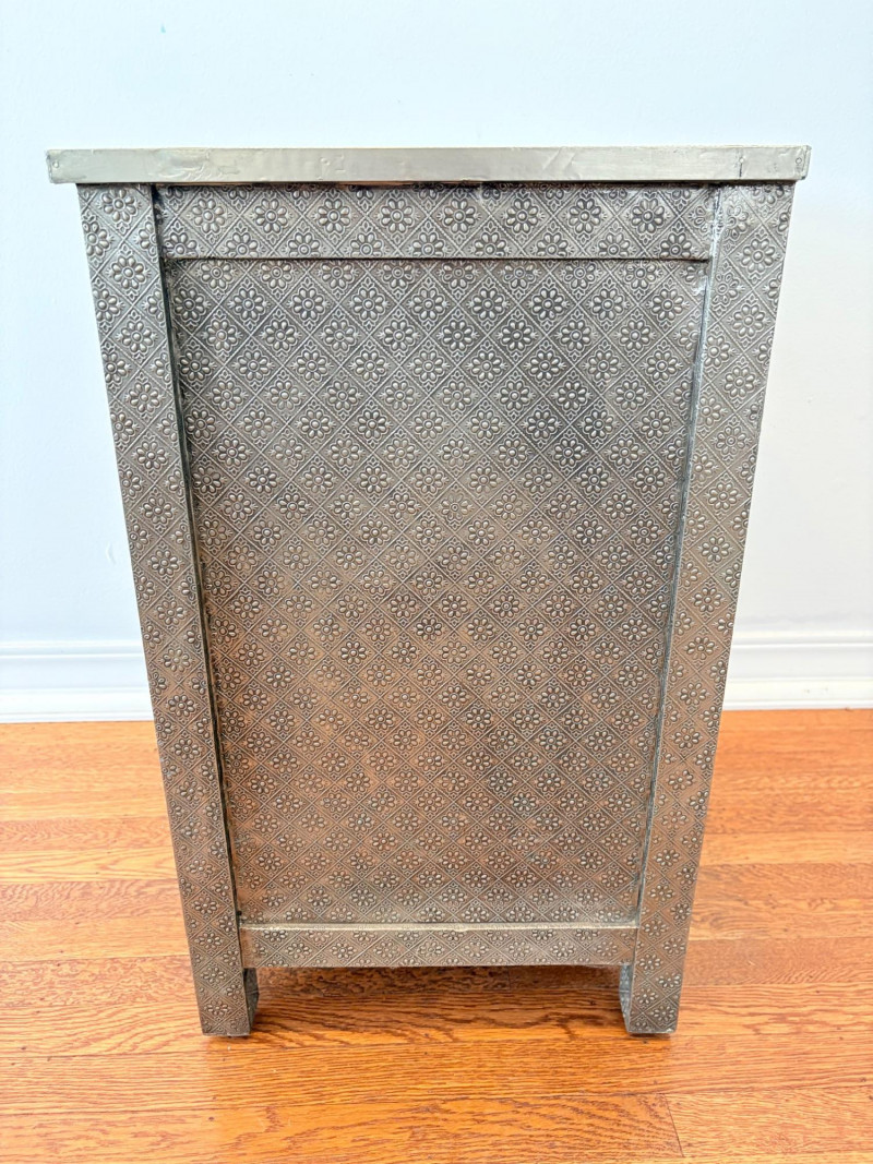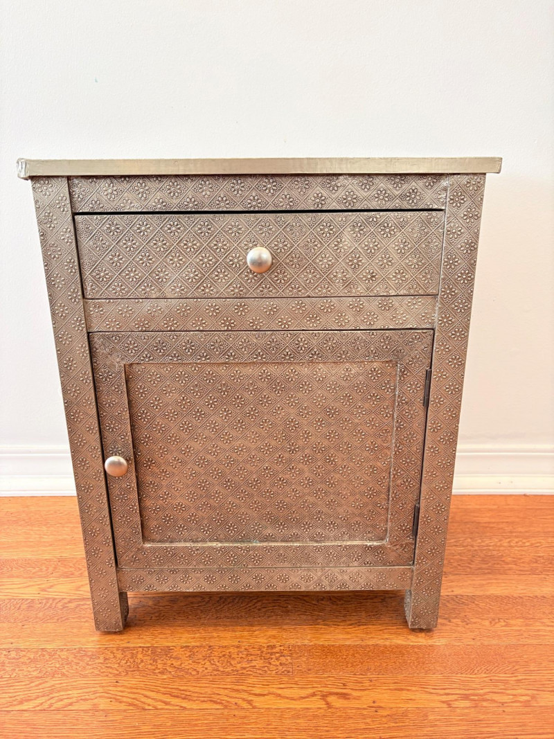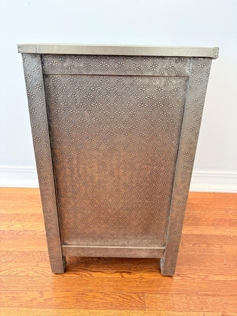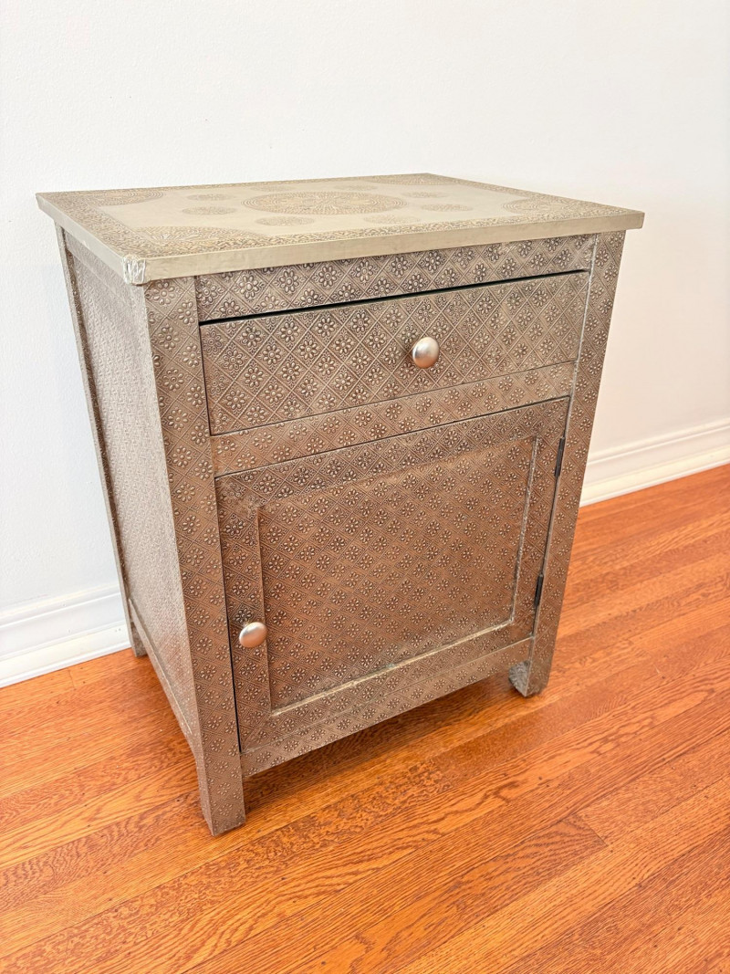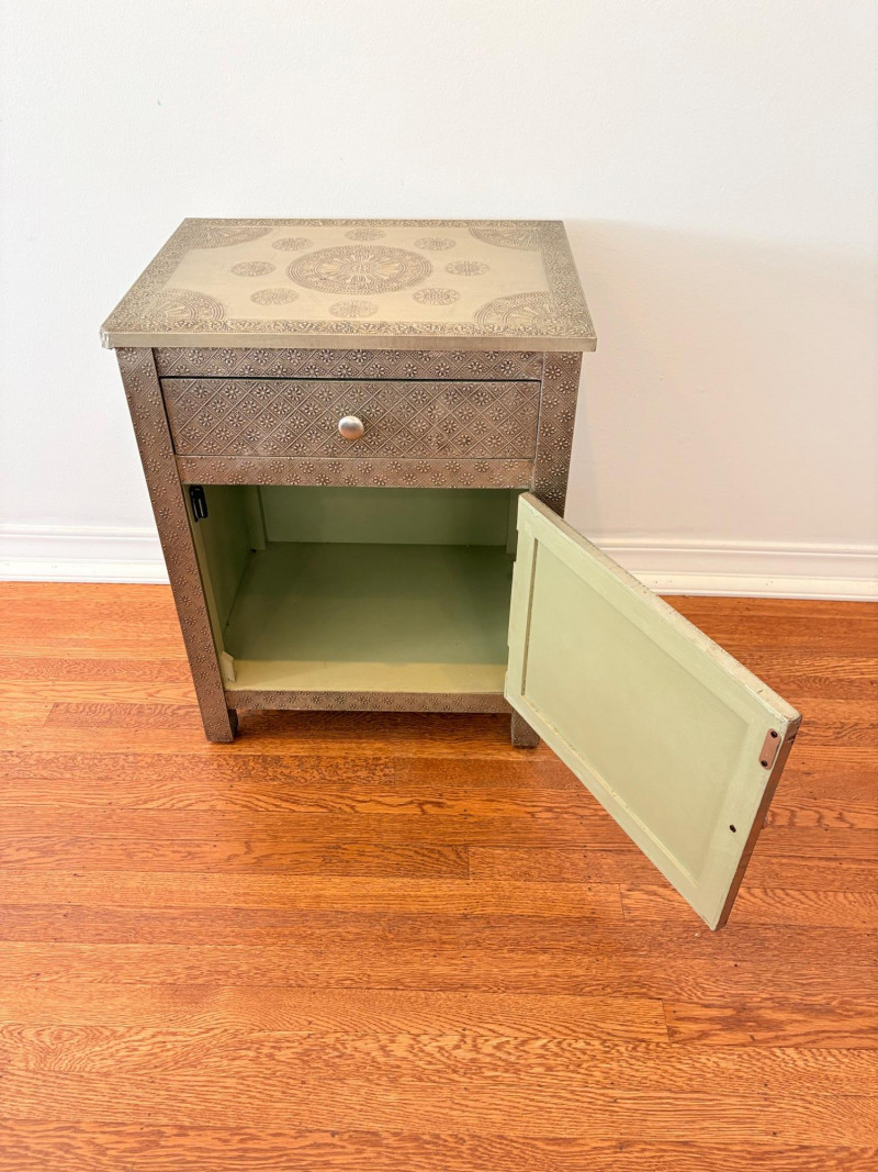 Nightstand is made of wood covered with embossed metal. Has one drawer and a swing open-door below. Nice all over pattern on the lower part of the chest with medallions and floral border on the top surface. Interior is painted olive green while the metal exterior is silver with a very slight greenish cast to it in certain light. In great condition except for one major flaw: the left front corner has been smashed at some point - please see last photo. Made by Cost Plus Imports about 10 years ago. Measures 26.5" H x 21" W x 17" D including pulls.