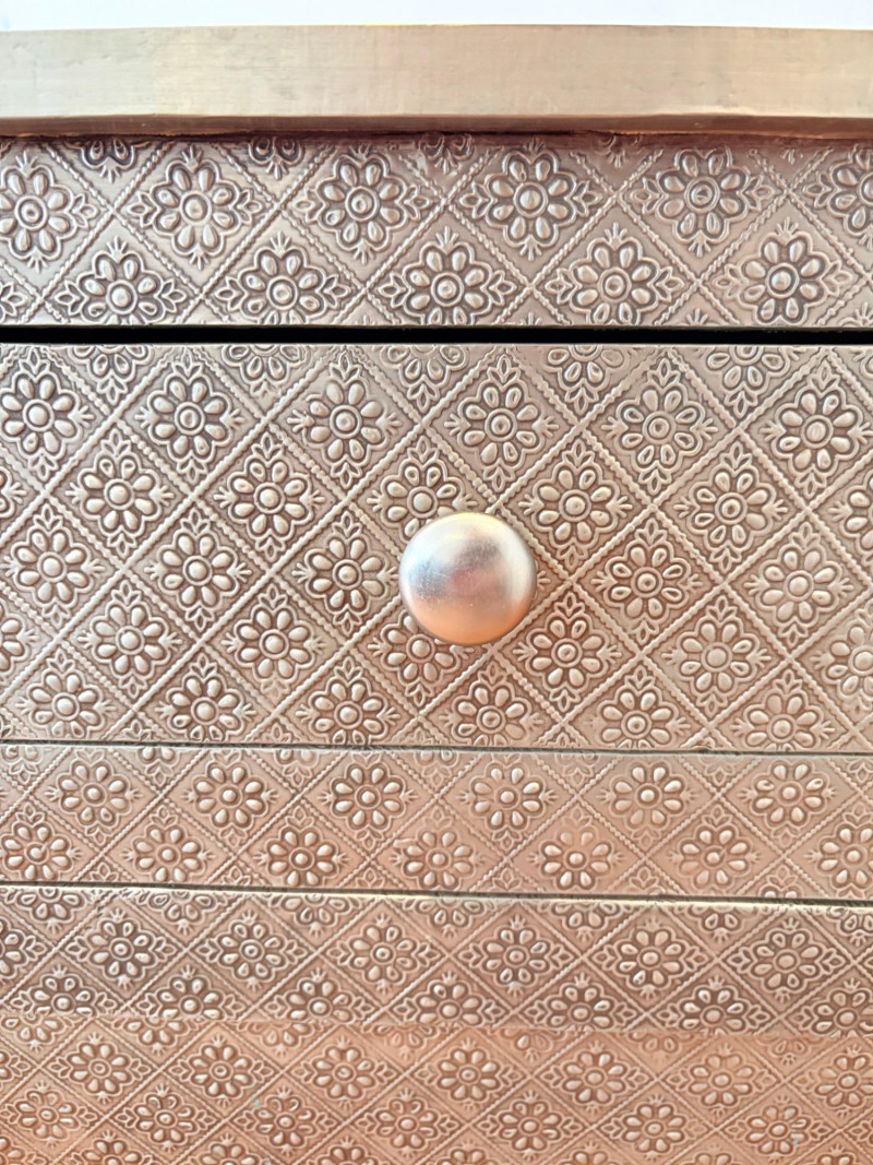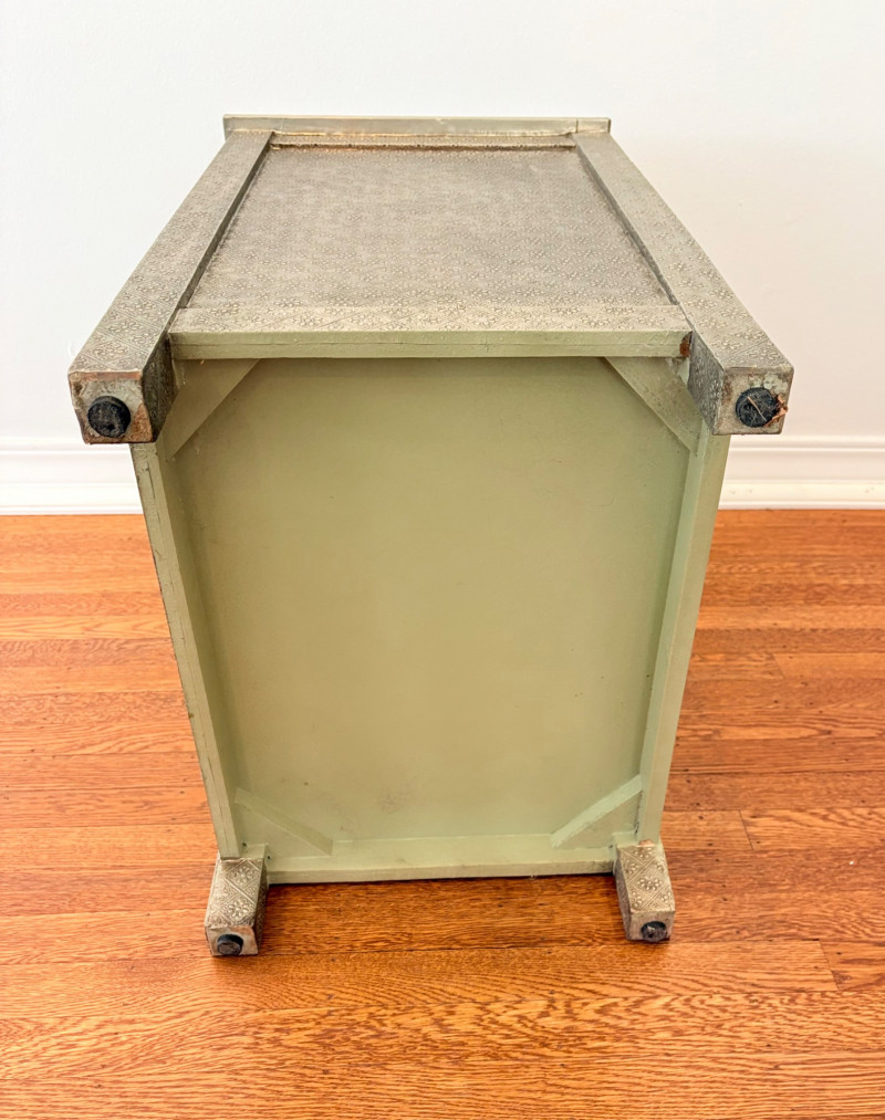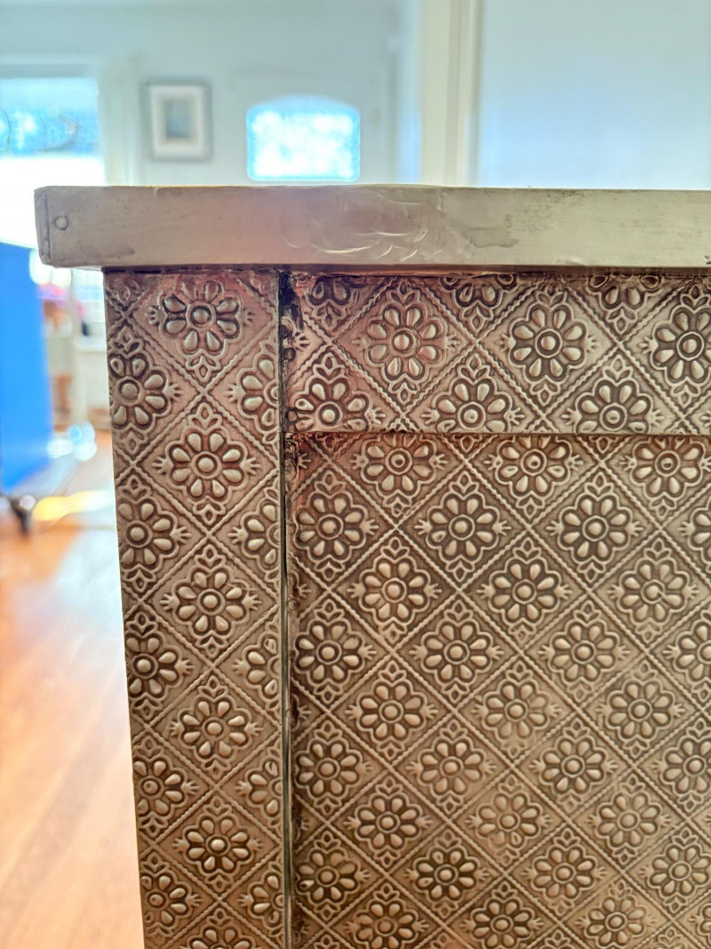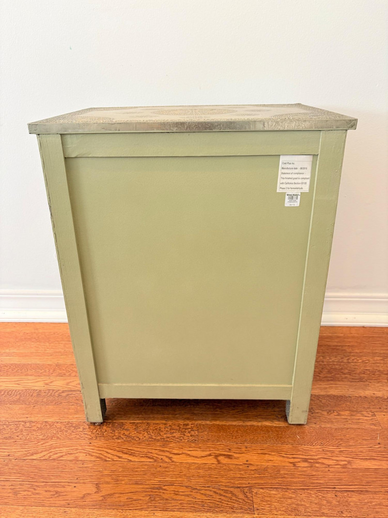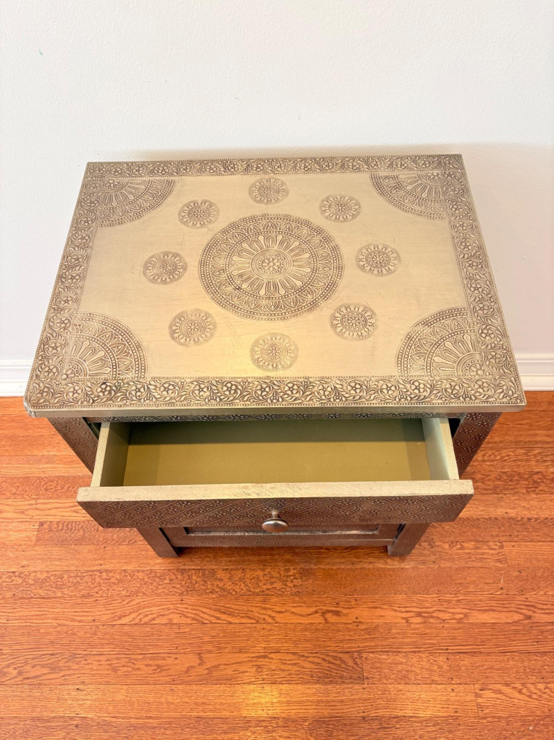 Nightstand is made of wood covered with embossed metal. Has one drawer and a swing open-door below. Nice all over pattern on the lower part of the chest with medallions and floral border on the top surface. Interior is painted olive green while the metal exterior is silver with a very slight greenish cast to it in certain light. In great condition except for one major flaw: the left front corner has been smashed at some point - please see last photo. Made by Cost Plus Imports about 10 years ago. Measures 26.5" H x 21" W x 17" D including pulls.