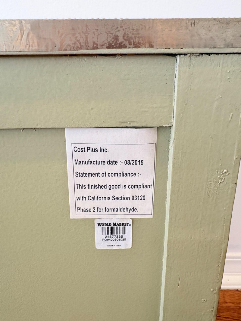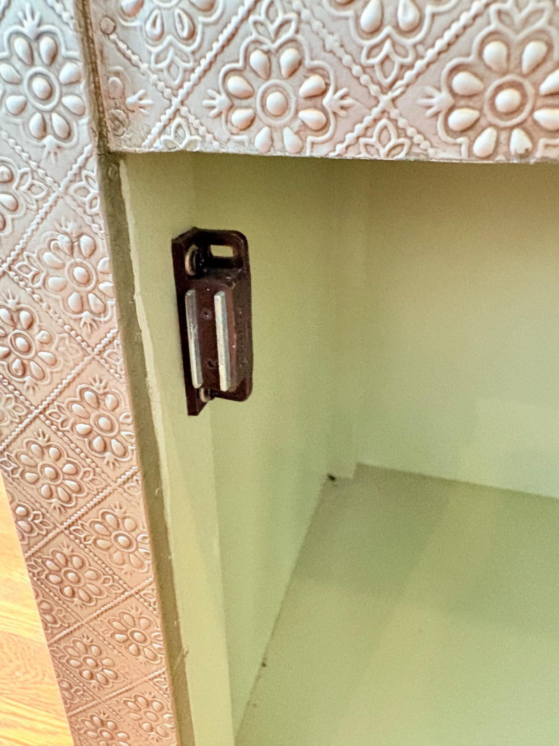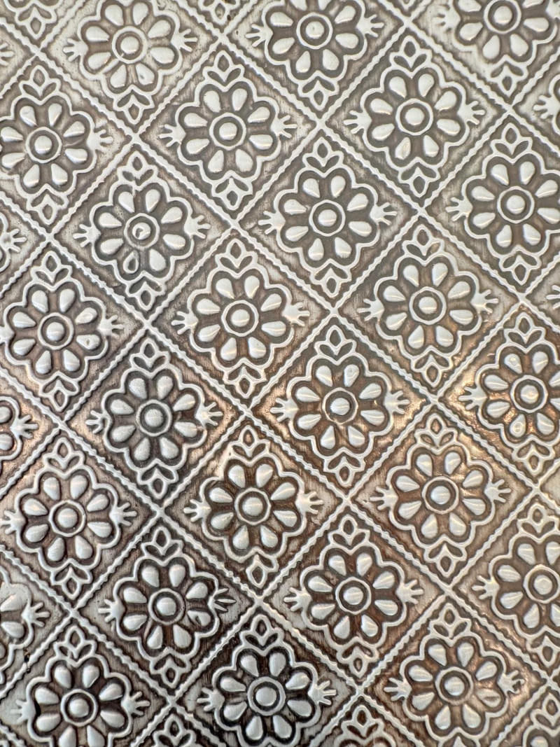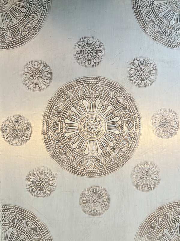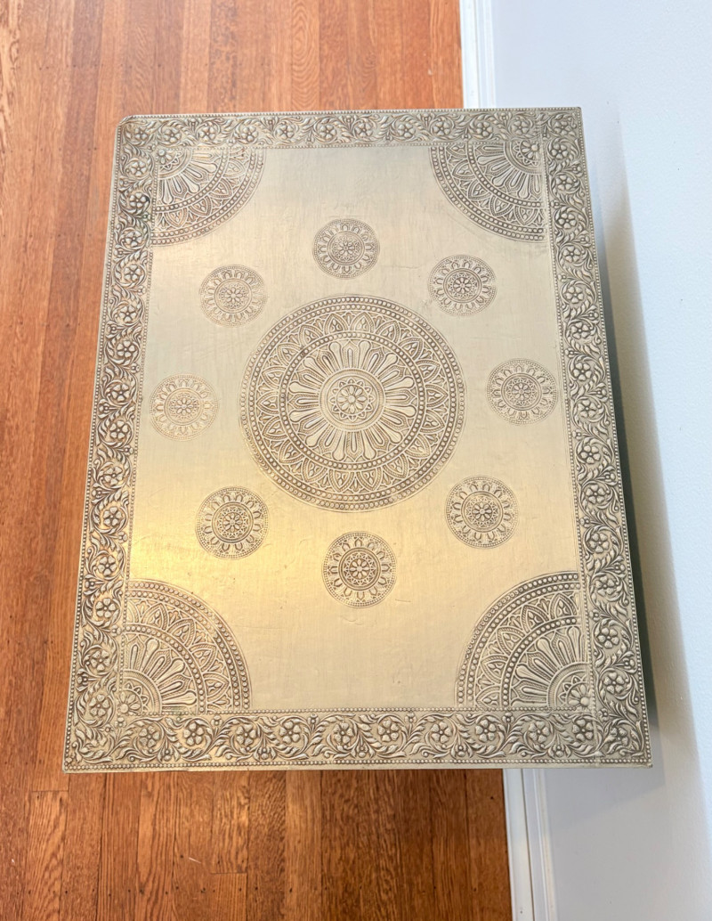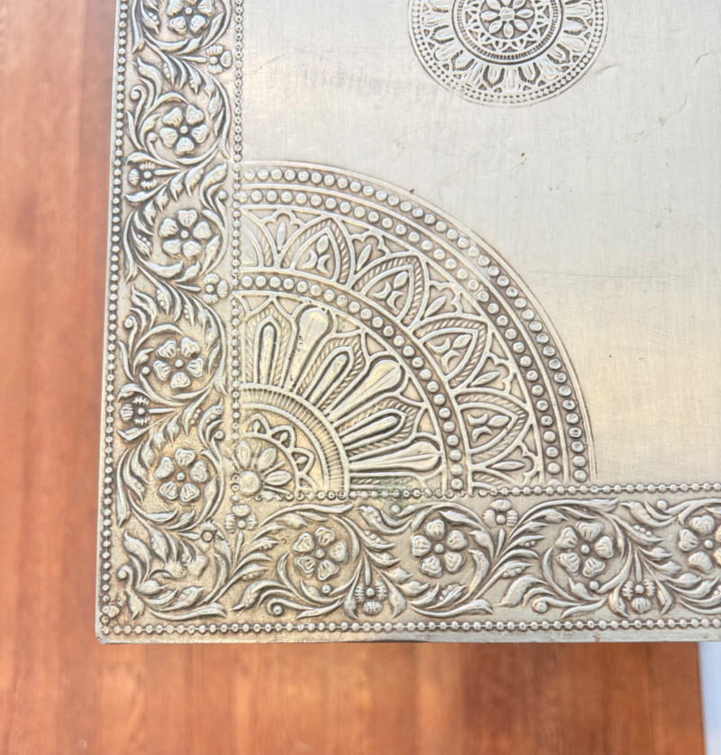 Nightstand is made of wood covered with embossed metal. Has one drawer and a swing open-door below. Nice all over pattern on the lower part of the chest with medallions and floral border on the top surface. Interior is painted olive green while the metal exterior is silver with a very slight greenish cast to it in certain light. In great condition except for one major flaw: the left front corner has been smashed at some point - please see last photo. Made by Cost Plus Imports about 10 years ago. Measures 26.5" H x 21" W x 17" D including pulls.
