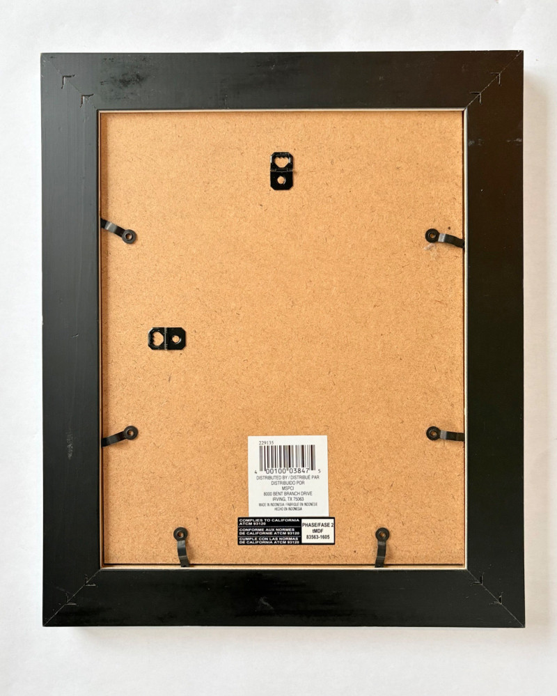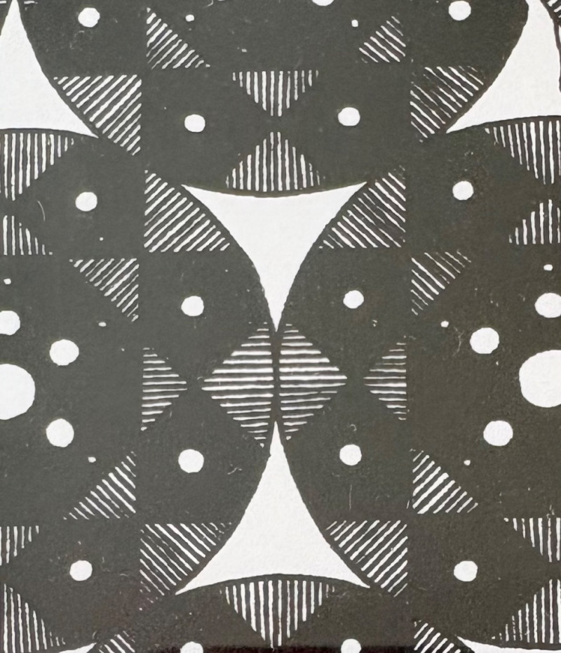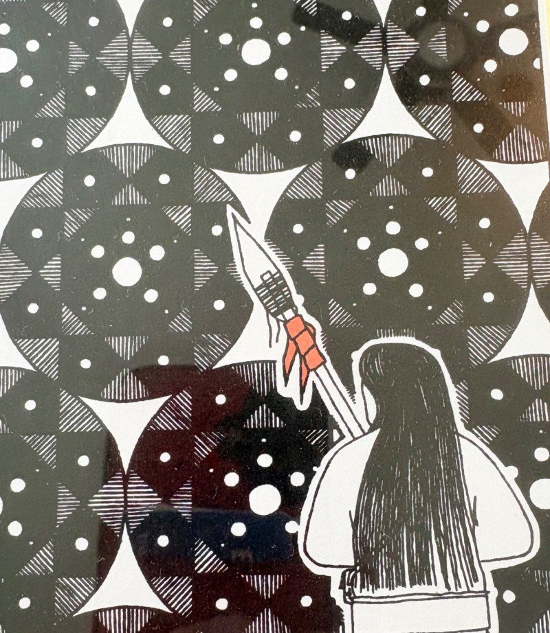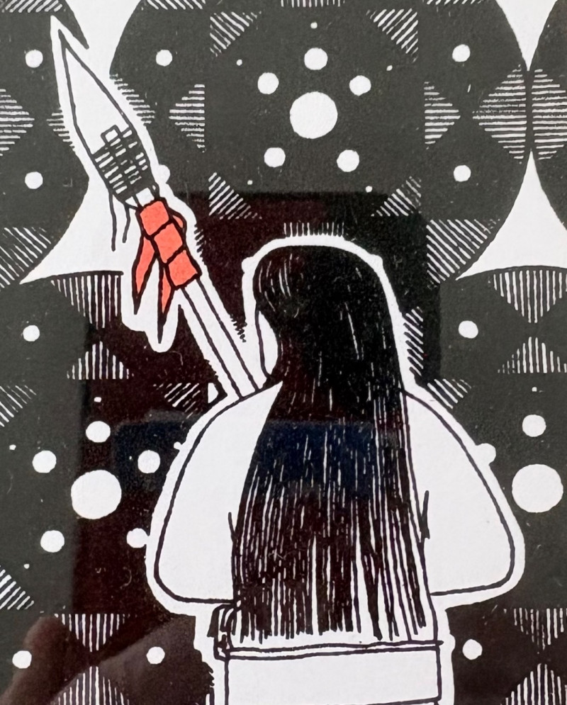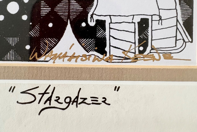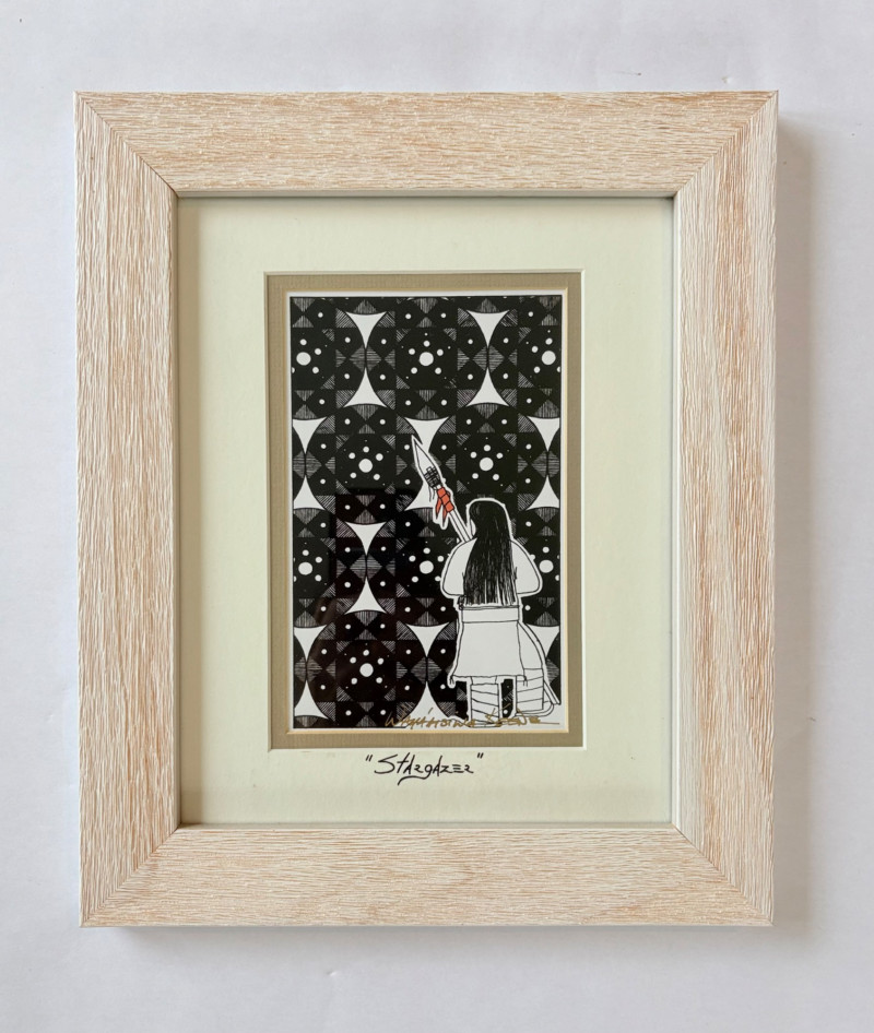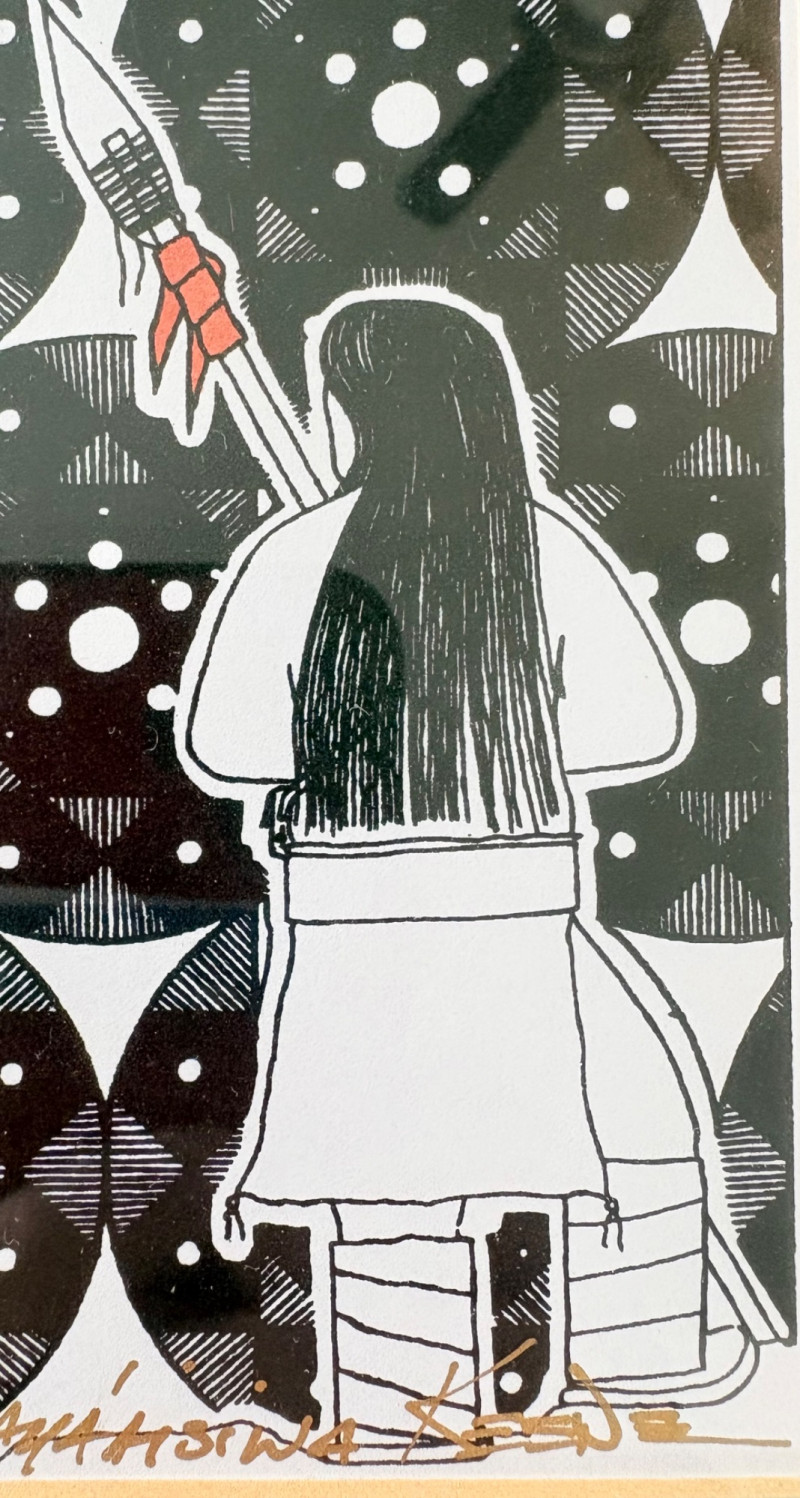 "Stargazer" is a lovely black and white composition with geometric patterning common in Native art. We love that the figure has its back to us engaging the stars rather than his audience. One pop of color (red) on his spear lashing draws the eye to the center of the composition. Signed by the artist in gold sharpie on the lower right.. A white washed wooden frame and double mat sets off the image beautifully. Measures 12.5" H x 10.5" W framed.