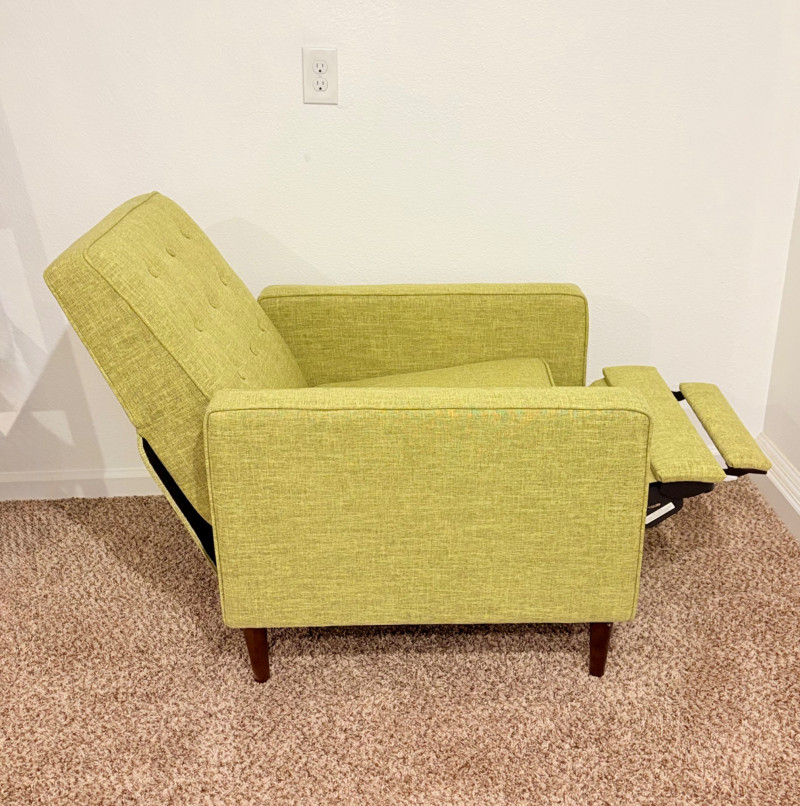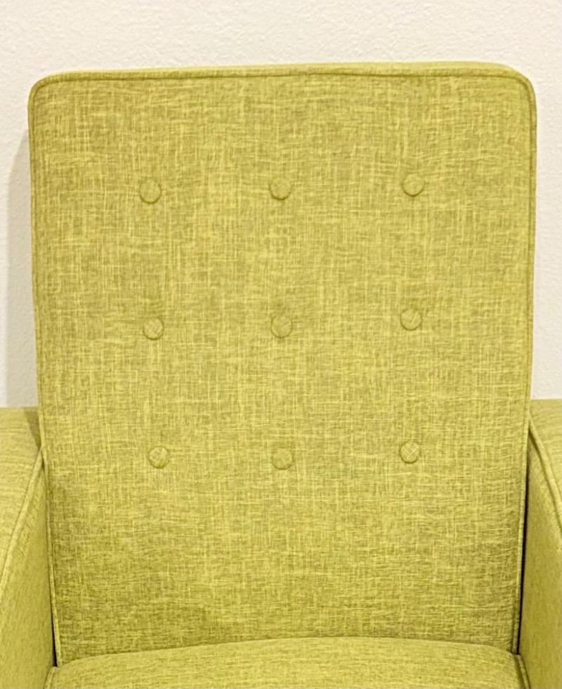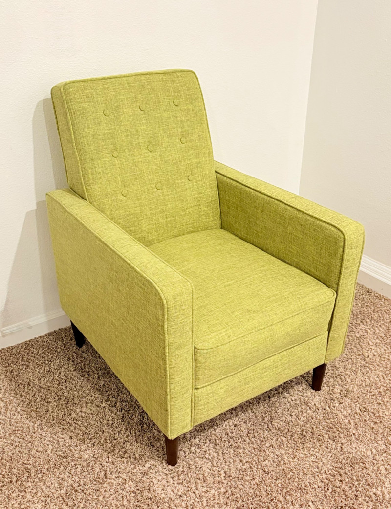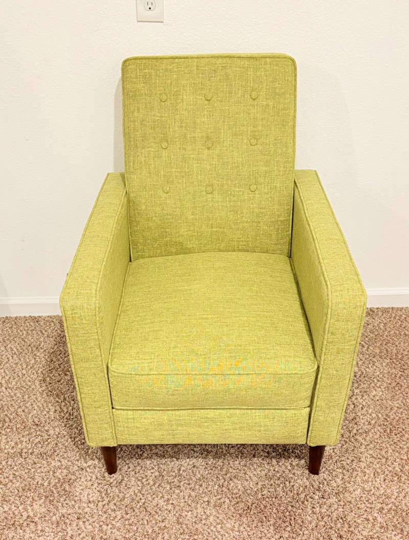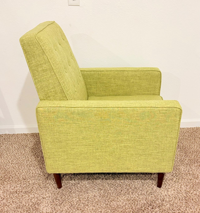 Recliners are usually fugly, right? Well, that's not the case here! This lime green chair IS a recliner upholstered in green linen-like material with a button- tufted back and brown wooden legs. Rather than being overstuffed and bulky, it has a slim profile and pushes back to recline; the fact that is is a recliner isn't readily obvious when upright. Sold by Noble House Furnishings of California. In great condition. Measures 37" H x 27" W x 35" D when upright, extends to 60" deep when reclined - great for a smaller room corner. Note that this is the same exact design as the recliner in Lot # 63, just a different colorway. Our monitor shows the color a bit too acidy - it is green rather than yellow-green.