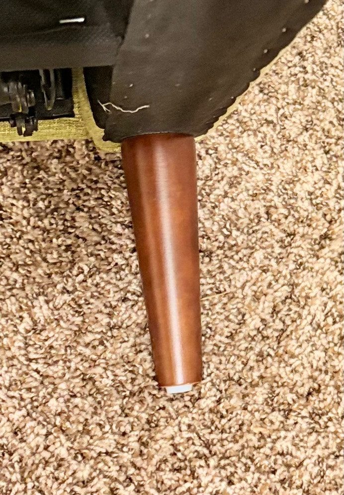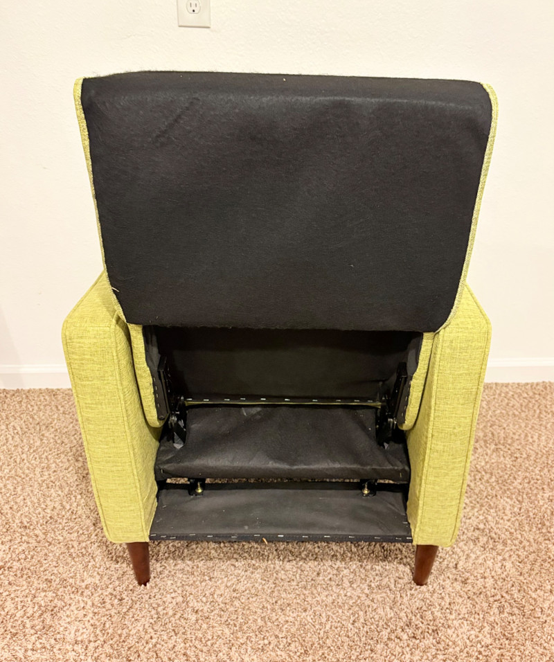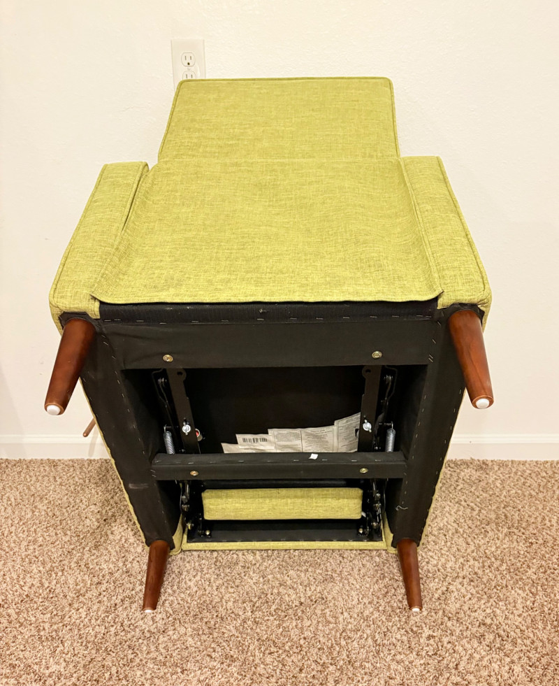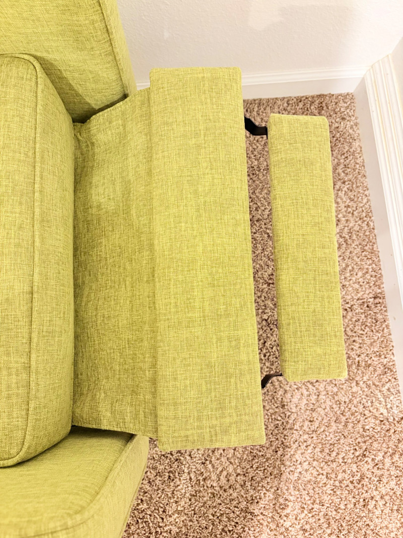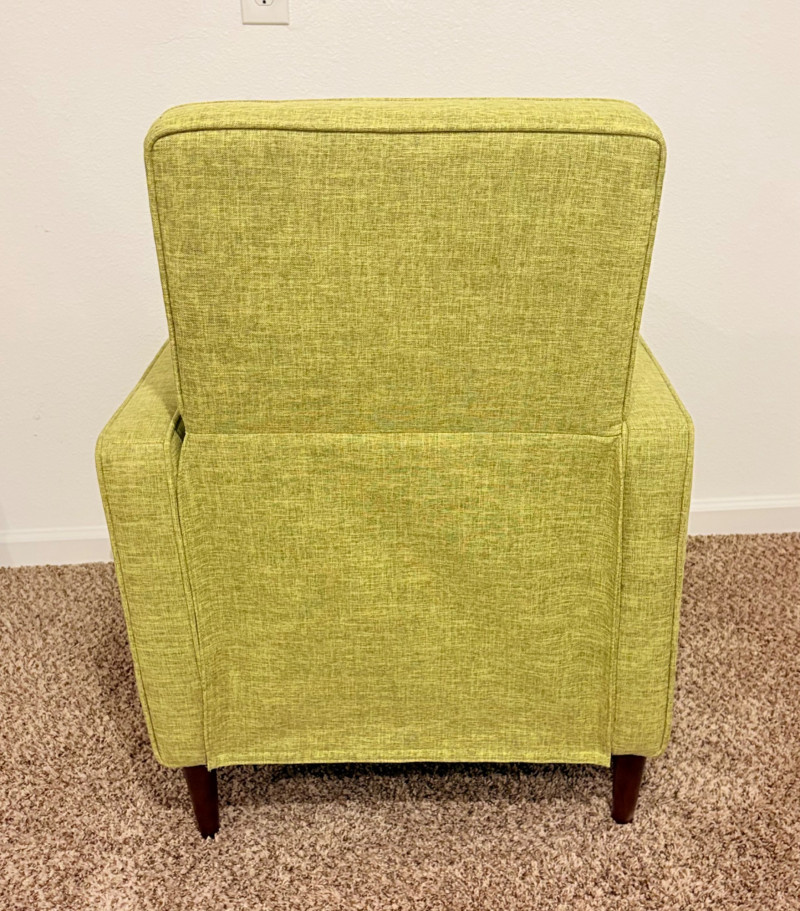 Recliners are usually fugly, right? Well, that's not the case here! This lime green chair IS a recliner upholstered in green linen-like material with a button- tufted back and brown wooden legs. Rather than being overstuffed and bulky, it has a slim profile and pushes back to recline; the fact that is is a recliner isn't readily obvious when upright. Sold by Noble House Furnishings of California. In great condition. Measures 37" H x 27" W x 35" D when upright, extends to 60" deep when reclined - great for a smaller room corner. Note that this is the same exact design as the recliner in Lot # 63, just a different colorway. Our monitor shows the color a bit too acidy - it is green rather than yellow-green.