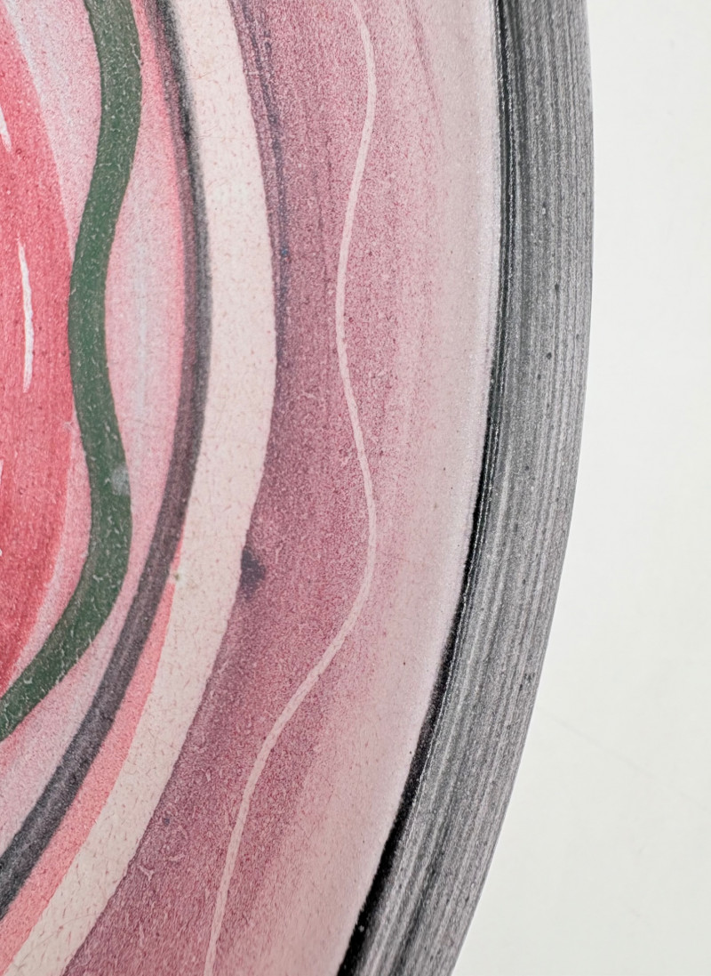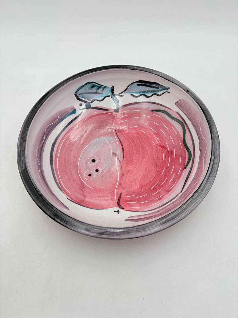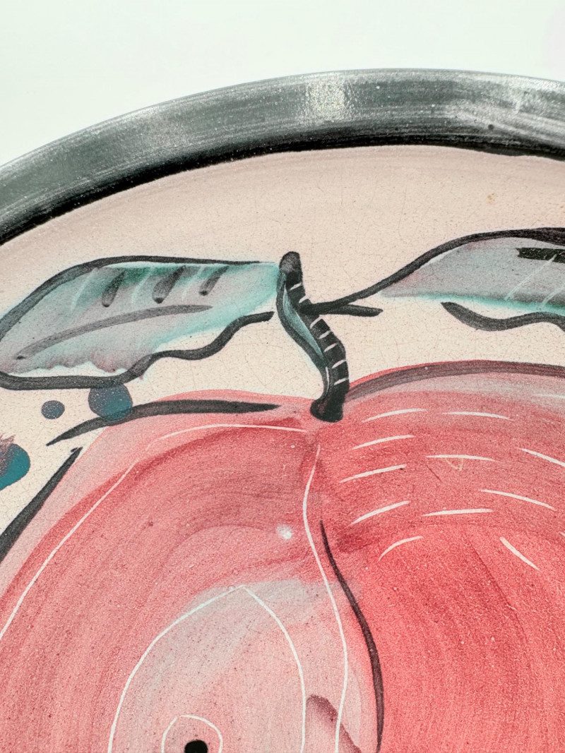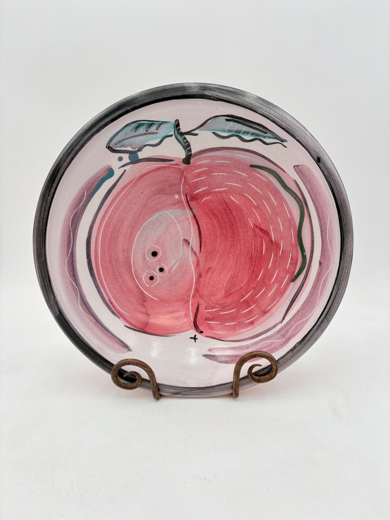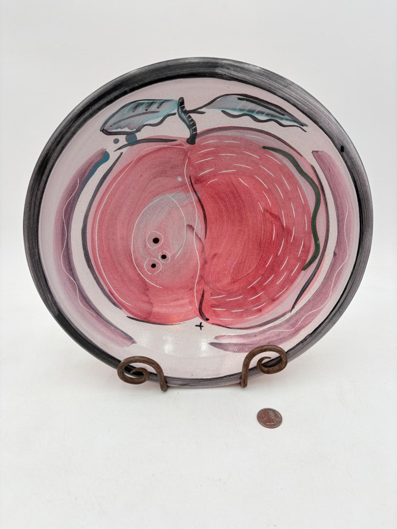 This large glazed bowl is perfect as a container for fruit (thus the apple) or as a display piece on the metal stand included. Glazed interior colors range from pink to pale lilac to blue to black. The exterior is unglazed and emblazoned with black "drawn" leaves. Signed by artist on bottom. Measures 3" H x 12" diameter.
