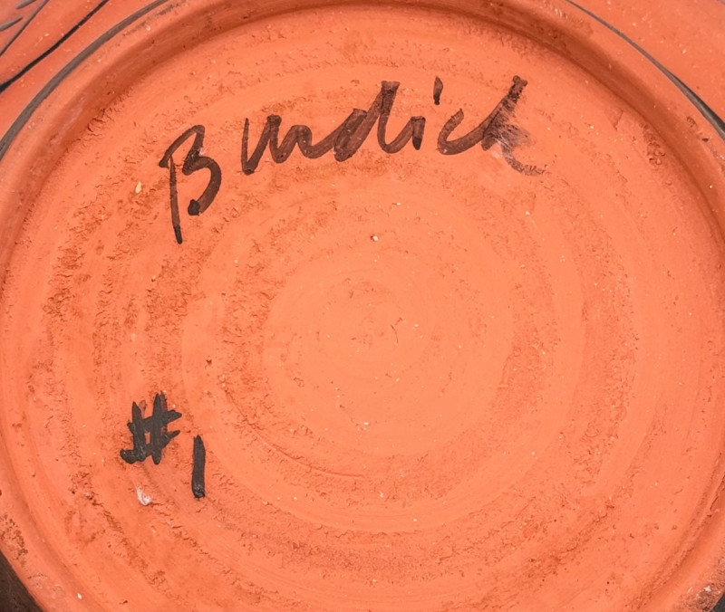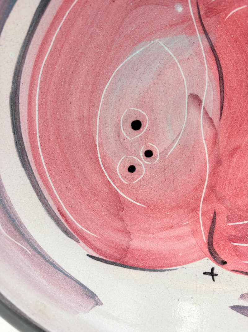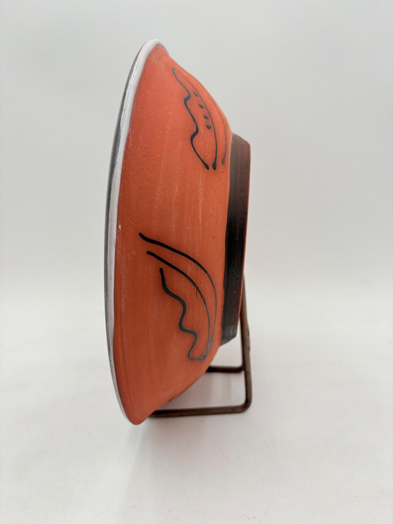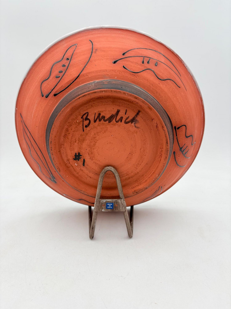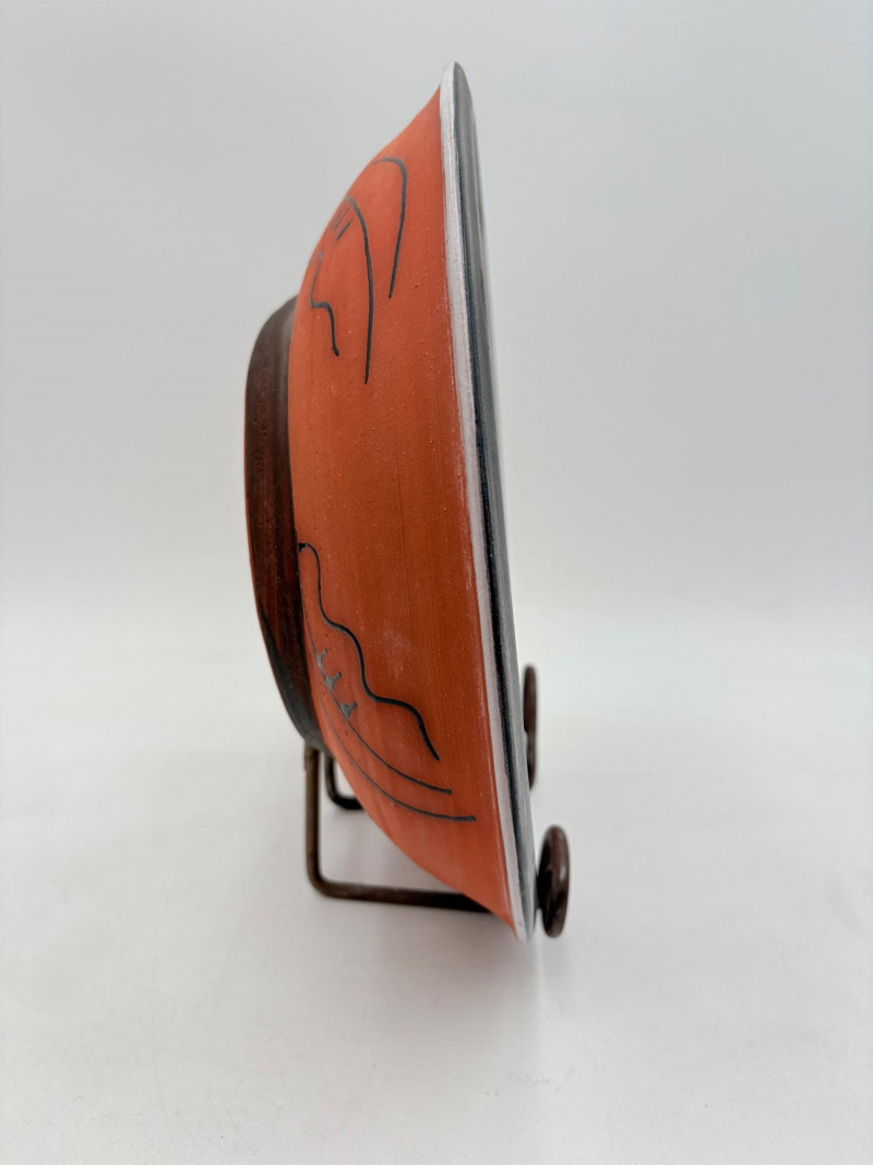 This large glazed bowl is perfect as a container for fruit (thus the apple) or as a display piece on the metal stand included. Glazed interior colors range from pink to pale lilac to blue to black. The exterior is unglazed and emblazoned with black "drawn" leaves. Signed by artist on bottom. Measures 3" H x 12" diameter.