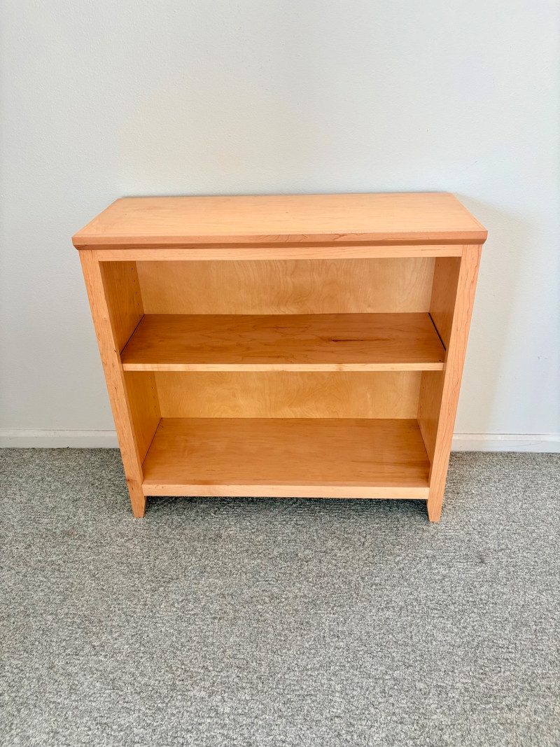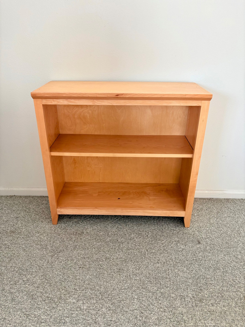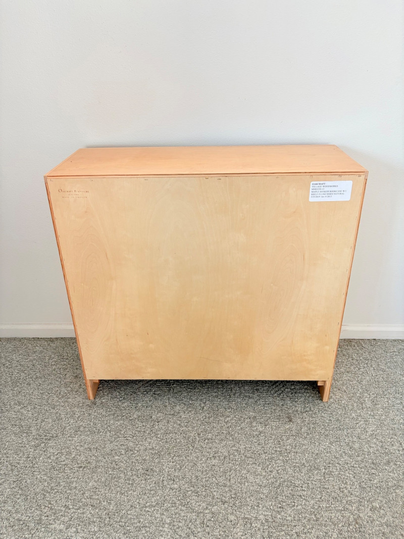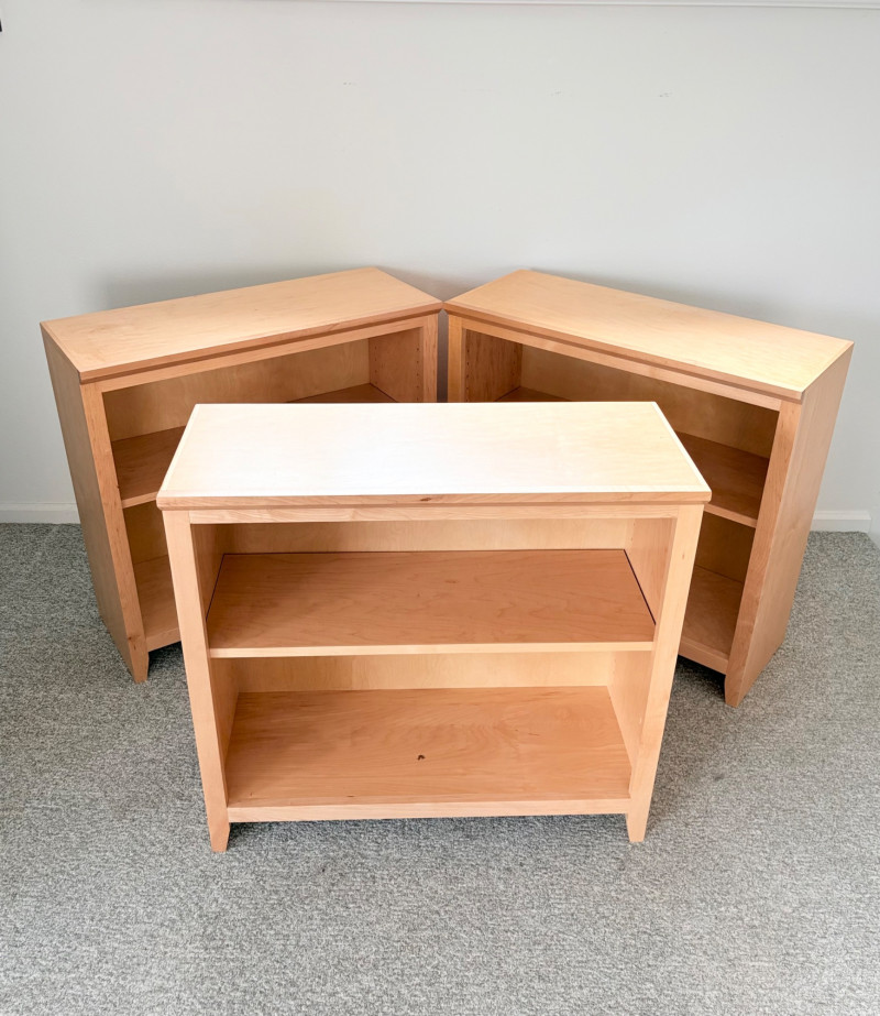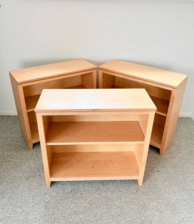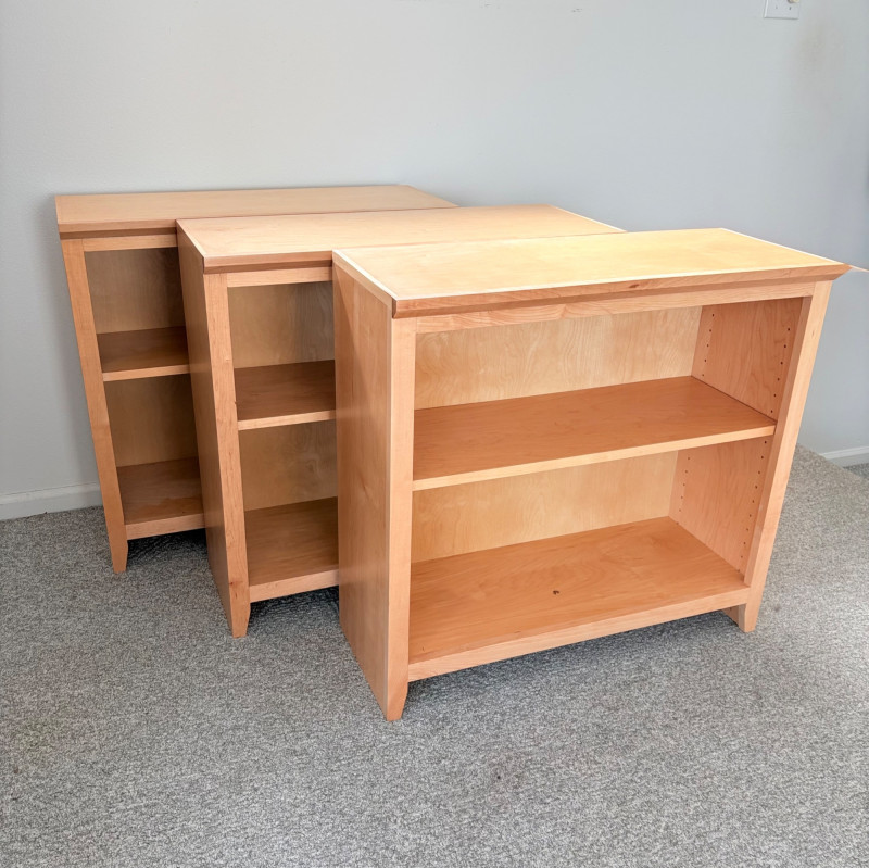 Gorgeous trio of solid maple wood bookshelves from Corvallis, Oregon, manufacturer Oak Craft Village Woodworks. All three are identical with adjustable middle shelf, slightly angled support legs and unfinished back. All in very good condition with just a few fade marks on the shelves from sun exposure - see last photo. Measure 30" H x 31.5" W x 12.5" D. for more info on this company: https://www.oakcraftfurniture.com/
