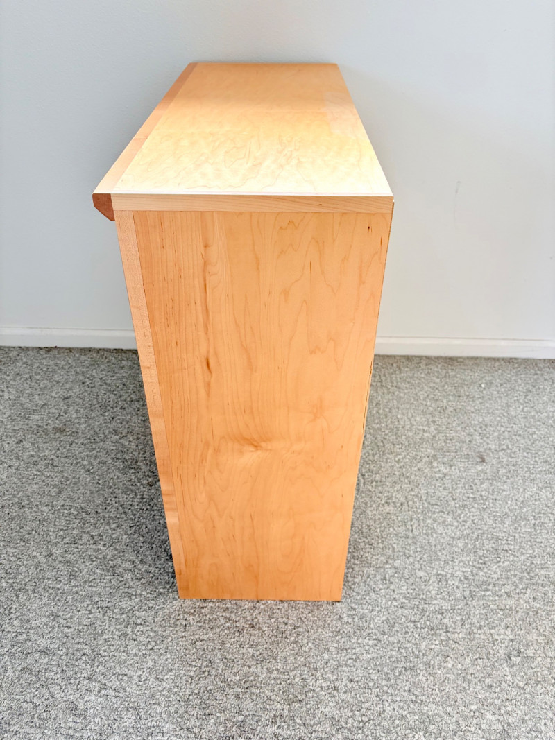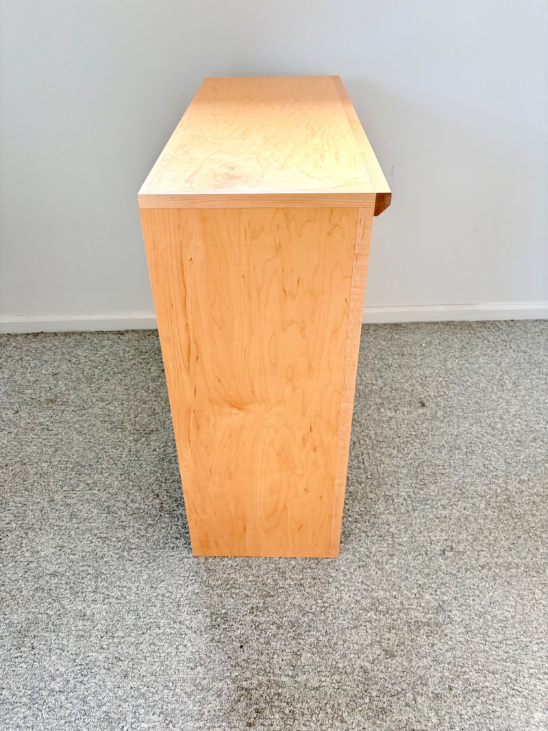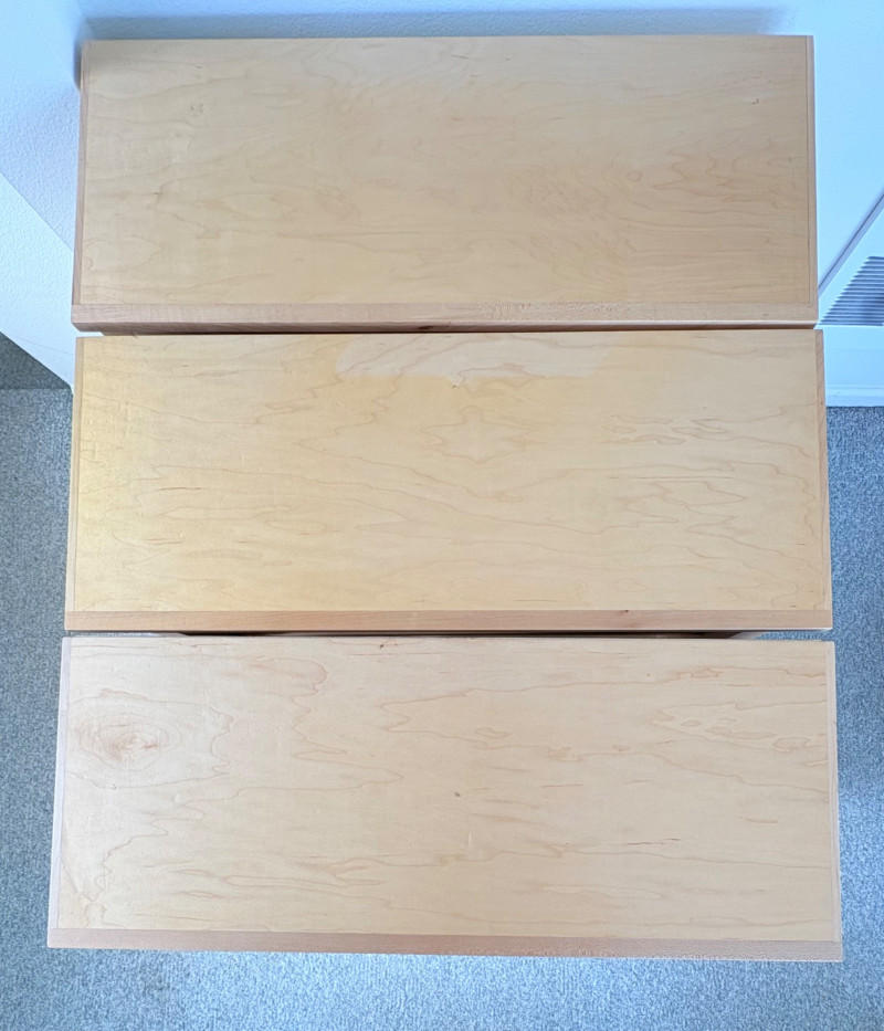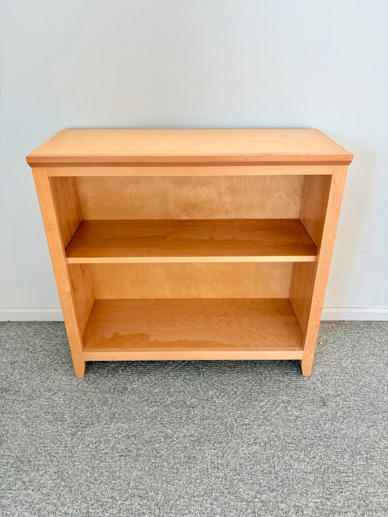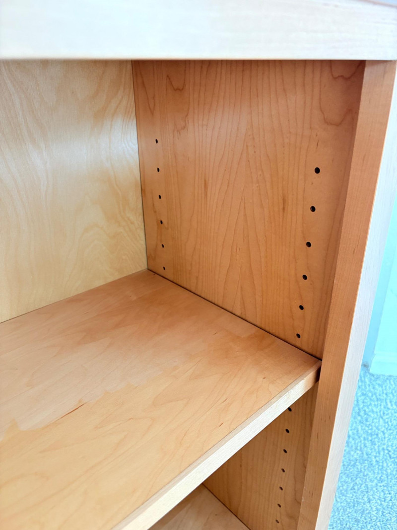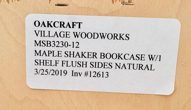 Gorgeous trio of solid maple wood bookshelves from Corvallis, Oregon, manufacturer Oak Craft Village Woodworks. All three are identical with adjustable middle shelf, slightly angled support legs and unfinished back. All in very good condition with just a few fade marks on the shelves from sun exposure - see last photo. Measure 30" H x 31.5" W x 12.5" D. for more info on this company: https://www.oakcraftfurniture.com/