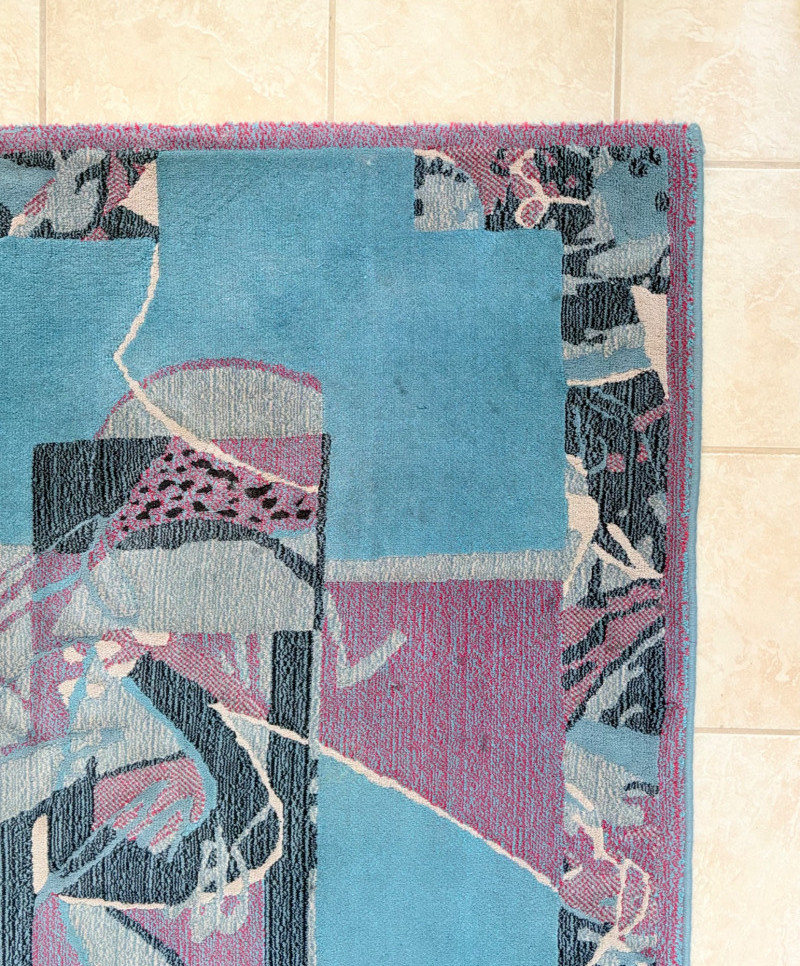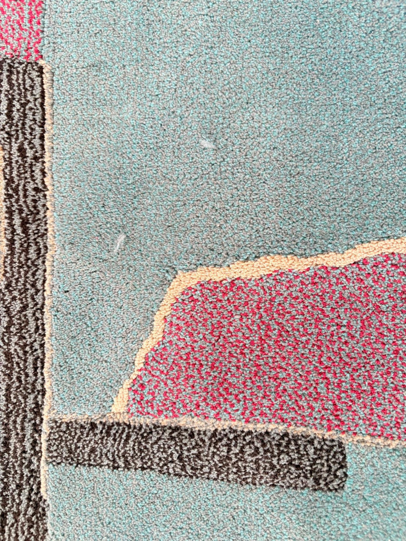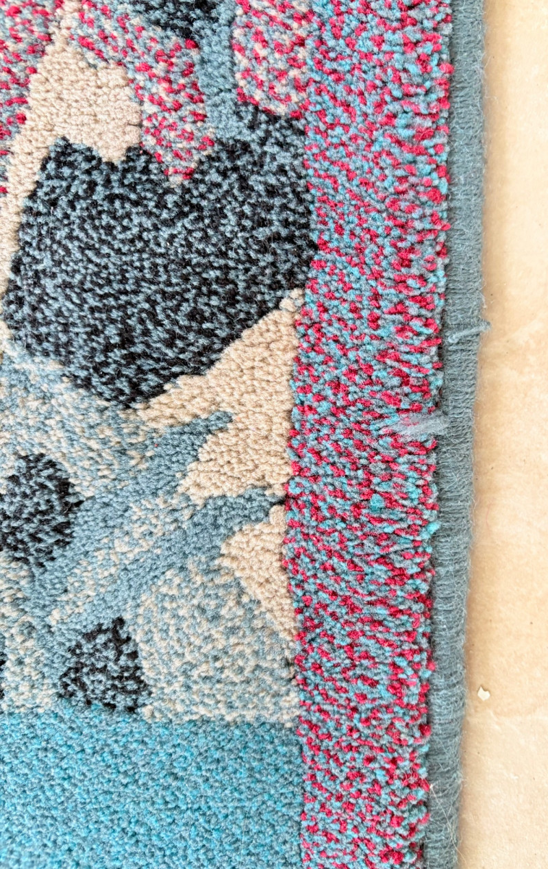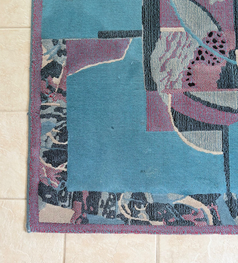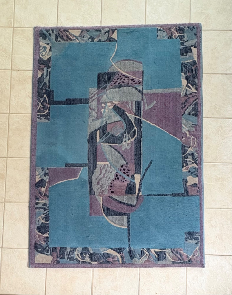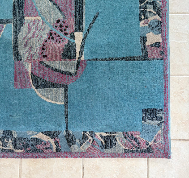 Couristan 100% acrylic area rug in an asymmetrical abstract design. Colors are teal, purple, black and beige. Bound edges and hemmed ends. Made in Belgium. In good condition, but in need of a deep clean to remove some spots. There appear to be a few spots where there are fuzz/small pulls (last photo); these are easily trimmed. Note that although the tag is gone, this is a smaller version of Lot #57 in the same colorway, weave, and design. Rug measures 3' 9" x 5' 5".