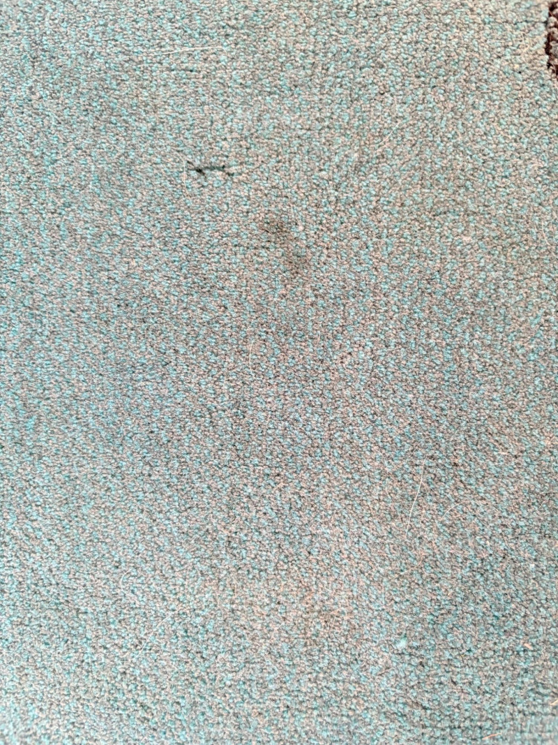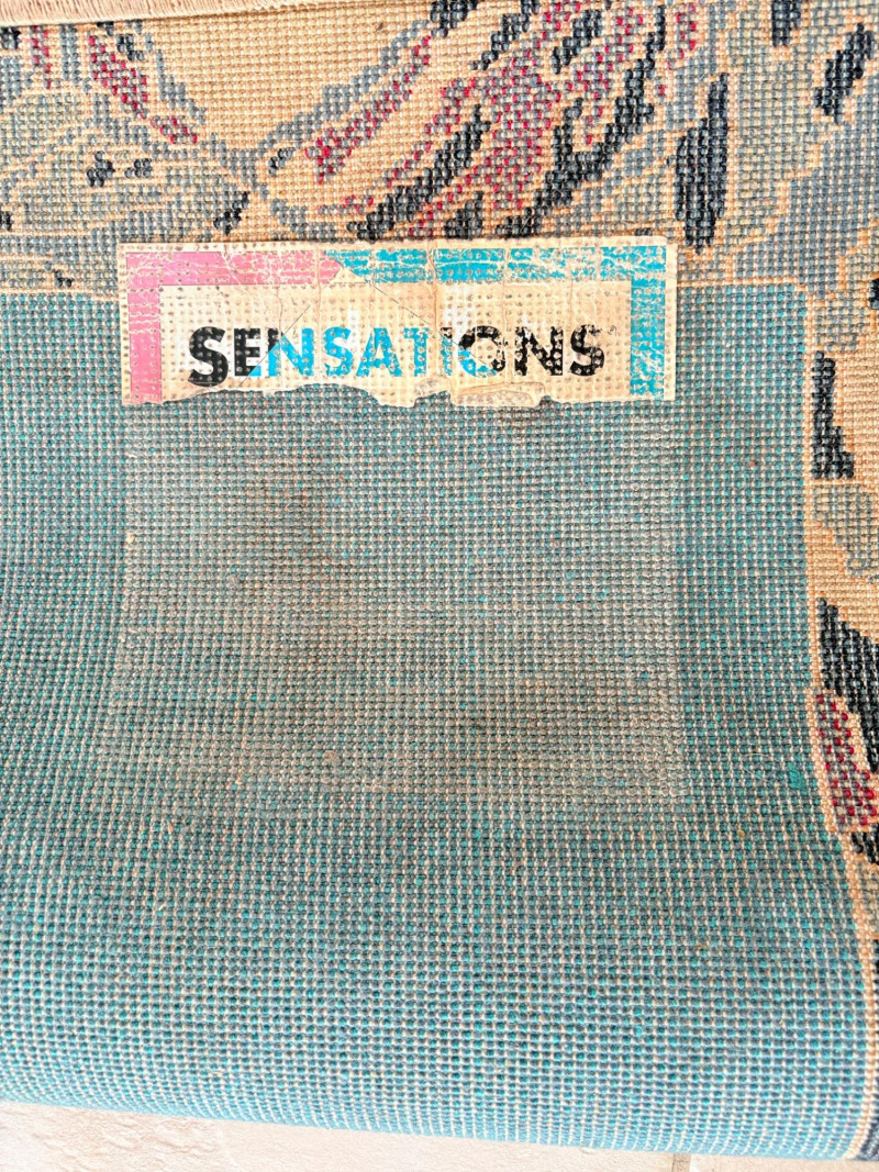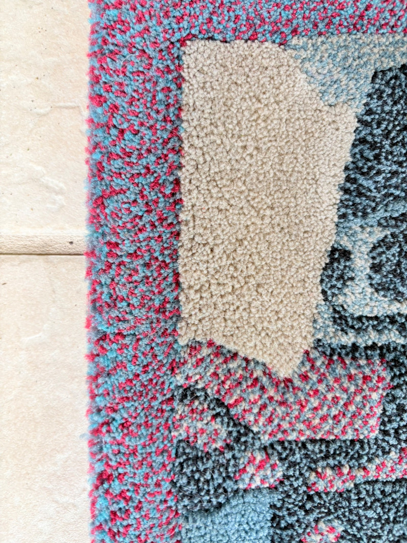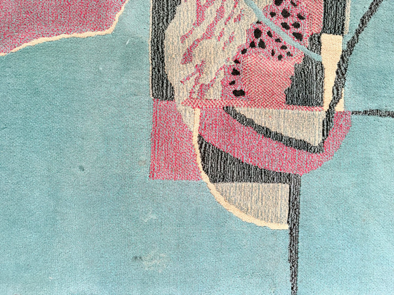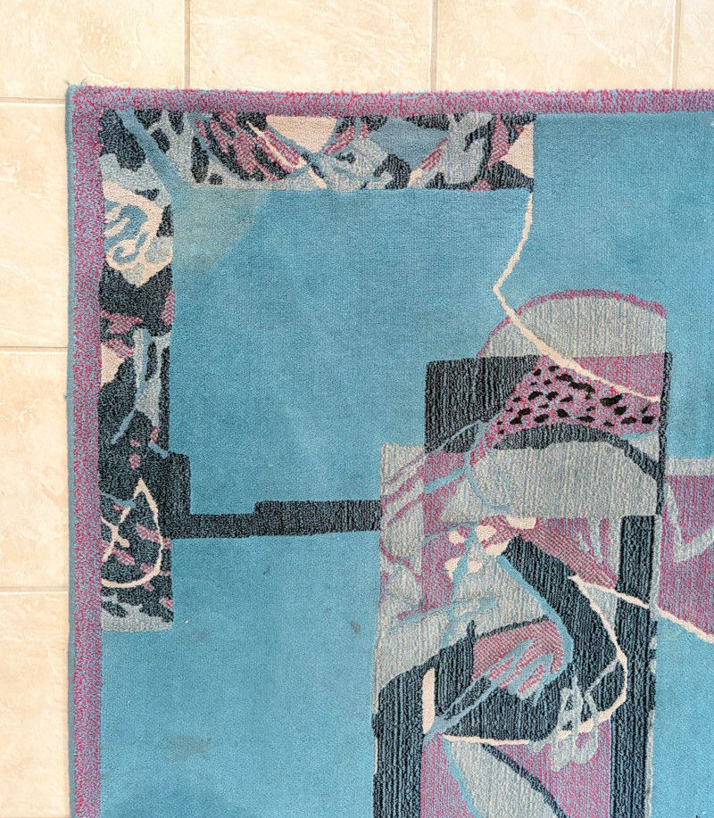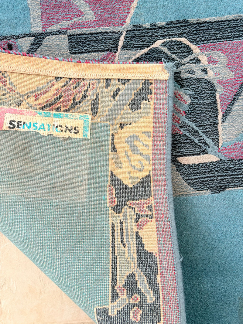Couristan 100% acrylic area rug in an asymmetrical abstract design. Colors are teal, purple, black and beige. Bound edges and hemmed ends. Made in Belgium. In good condition, but in need of a deep clean to remove some spots. There appear to be a few spots where there are fuzz/small pulls (last photo); these are easily trimmed. Note that although the tag is gone, this is a smaller version of Lot #57 in the same colorway, weave, and design. Rug measures 3' 9" x 5' 5".