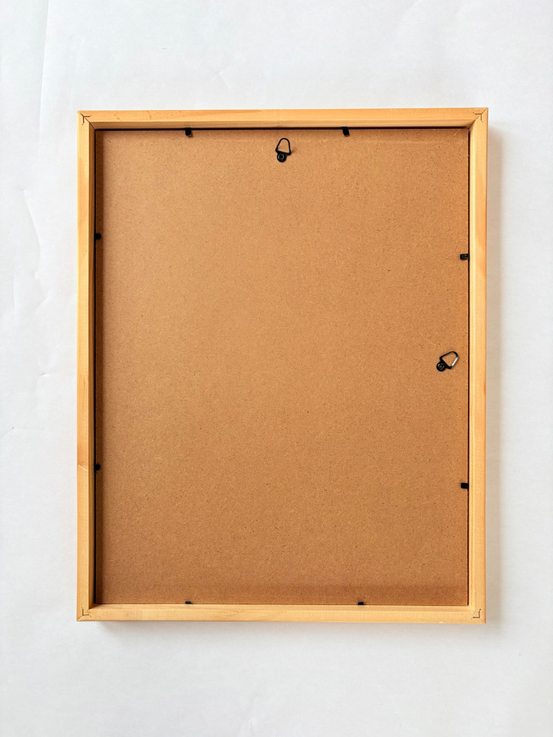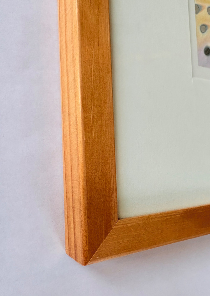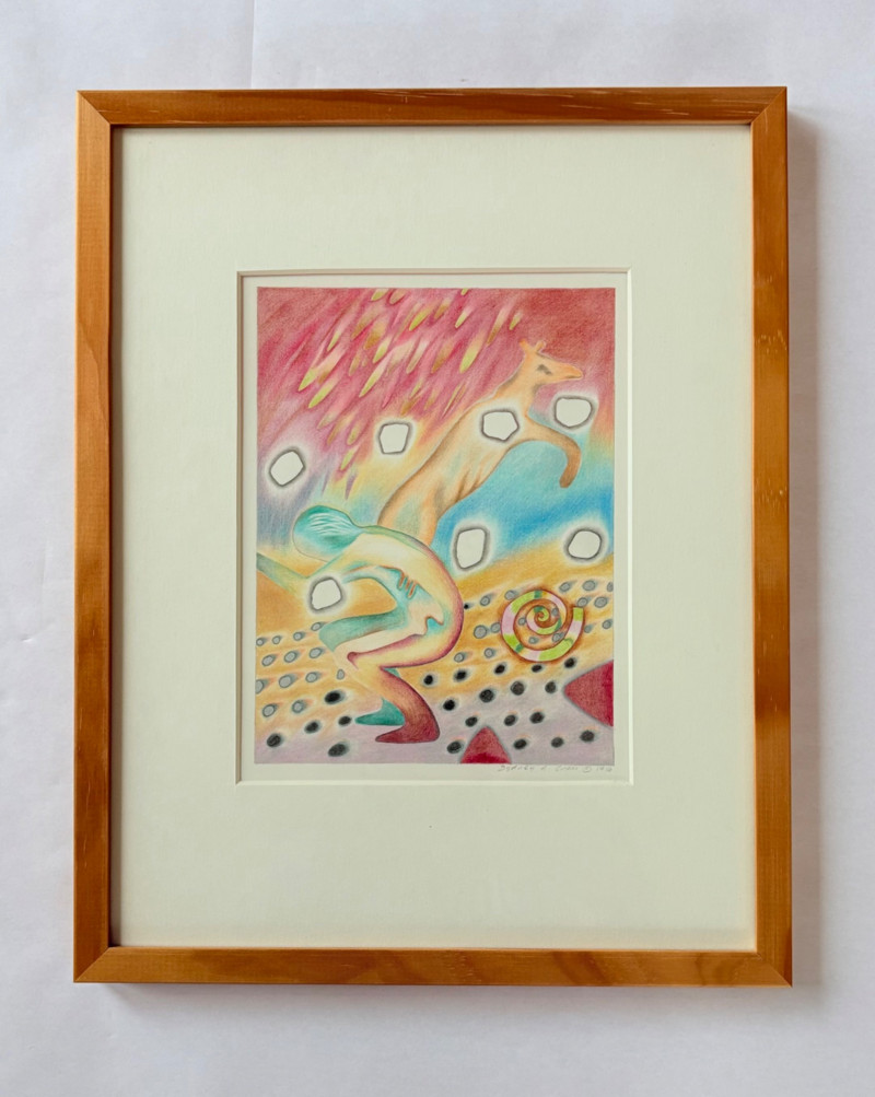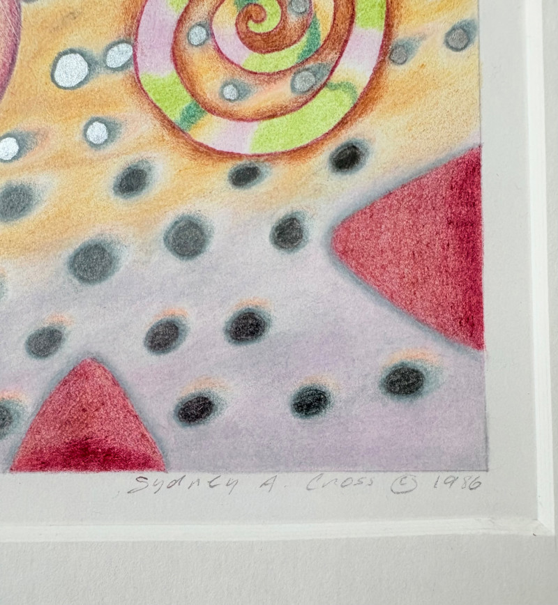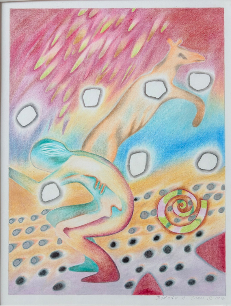Exquisite image by Sydney Cross with no title from 1986. This piece appears to be a print (?), but it feels more like a blend of watercolor and colored pencil with a blending of color and detail that is really exquisite. There’s also metallic silver on the surface and an almost photographic quality to the hair on the human in the left front. Truly a lovely peace that invites very close observation. White mat color matches the print paper and the piece has a natural wood frame. Measures 14.75" H x 11.75" W framed.