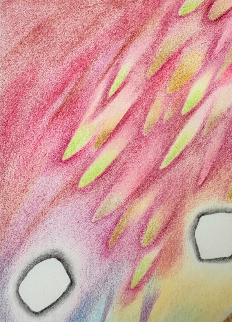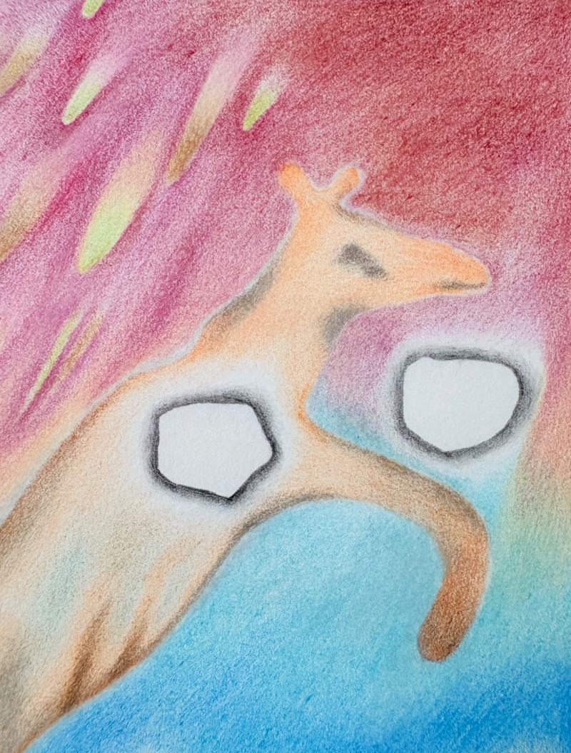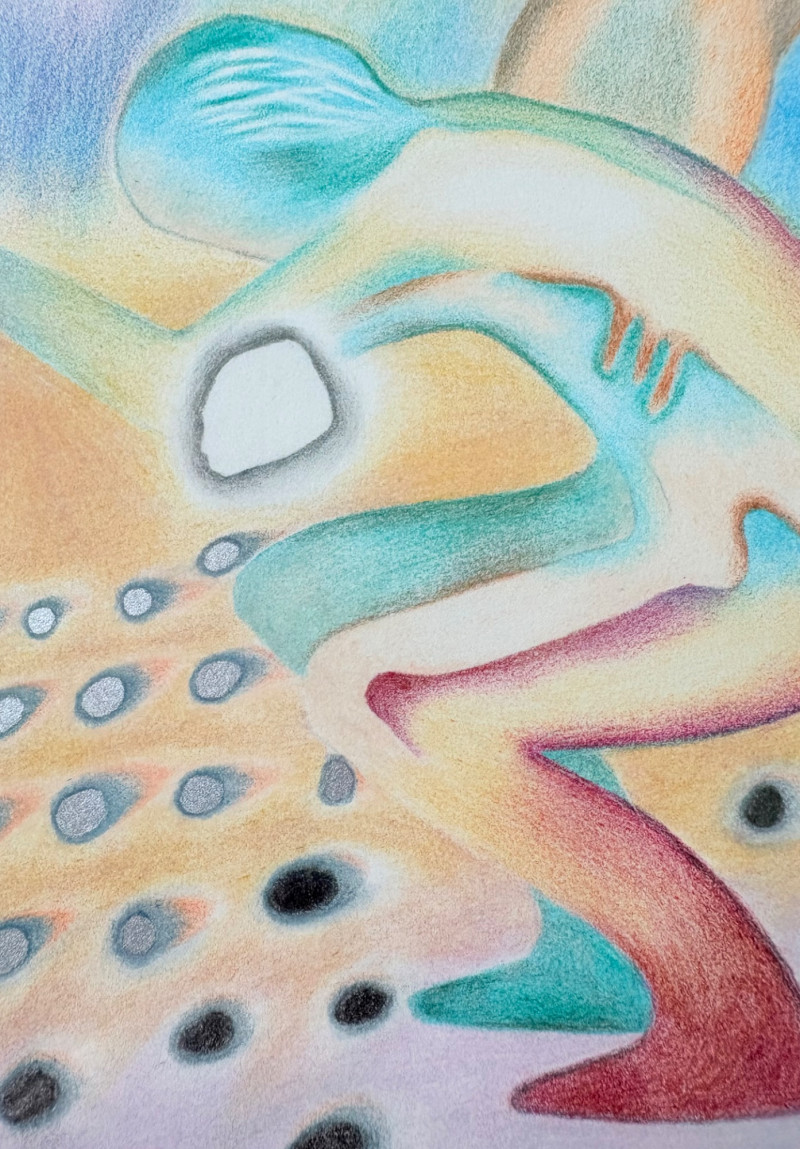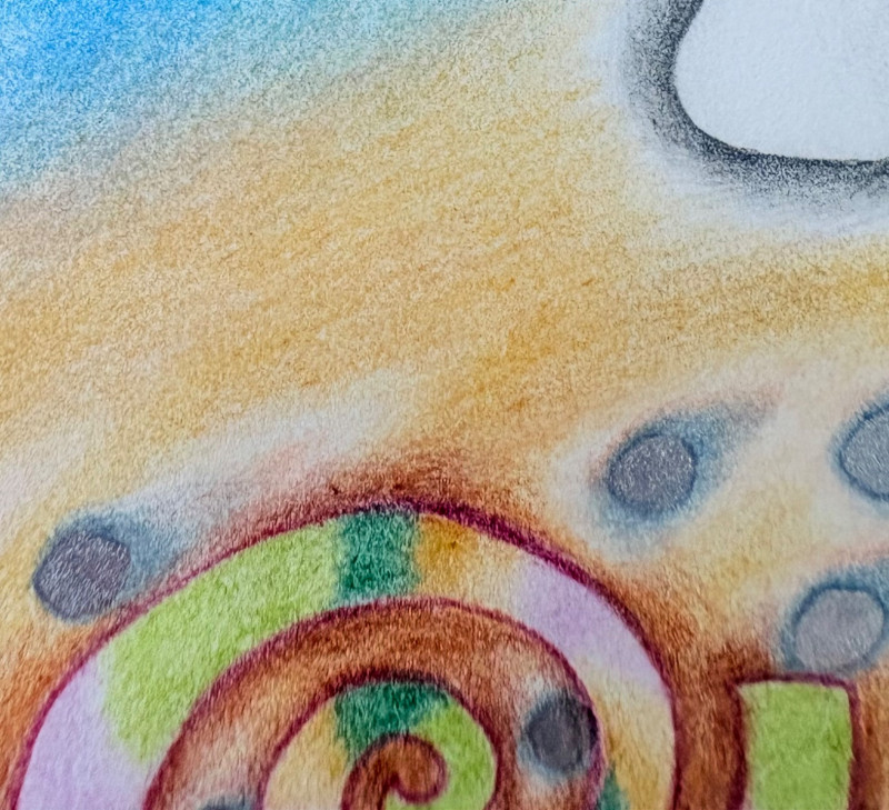 Exquisite image by Sydney Cross with no title from 1986. This piece appears to be a print (?), but it feels more like a blend of watercolor and colored pencil with a blending of color and detail that is really exquisite. There’s also metallic silver on the surface and an almost photographic quality to the hair on the human in the left front. Truly a lovely peace that invites very close observation. White mat color matches the print paper and the piece has a natural wood frame. Measures 14.75" H x 11.75" W framed.
