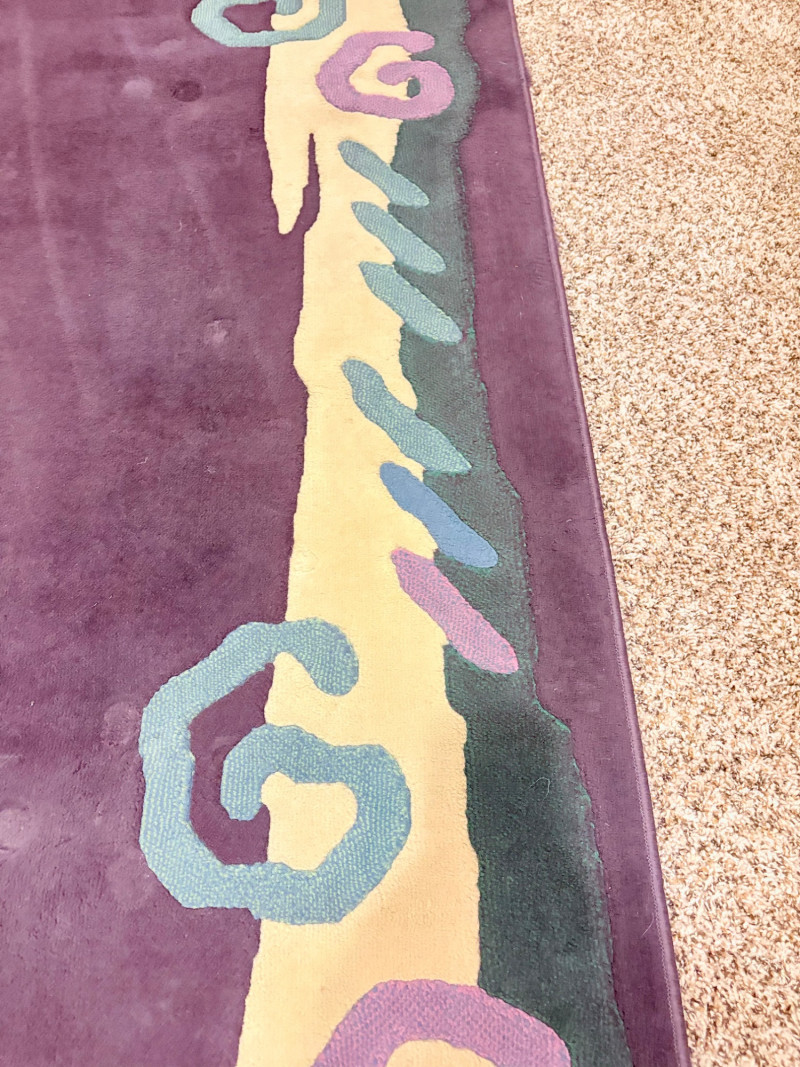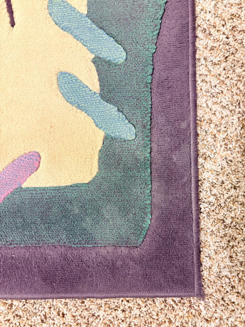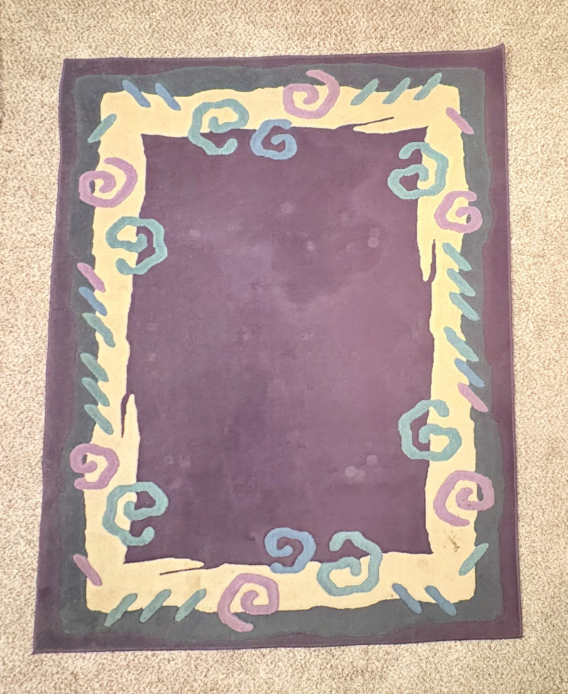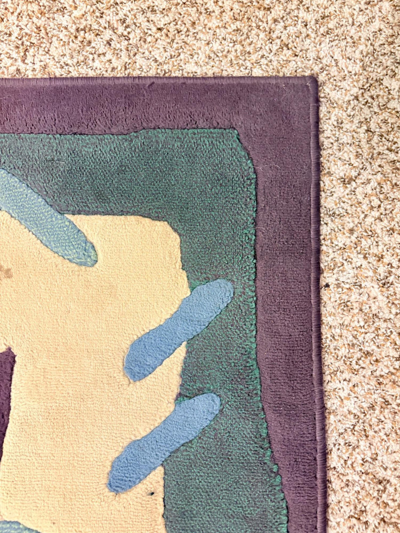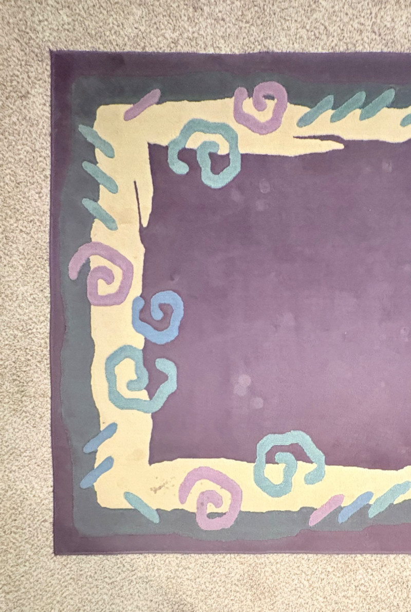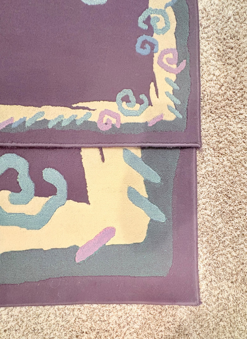 Do you like channeling a 1980s vibe? The teal, purple, and beige colors/designs on these vintage rugs are perfect for you! Large area rug with matching runner labeled "St. Croix - Eggplant". Large area rug measures 66" x 99" and is made in the USA of Olefin with jute/polyester backing. While the rug is quite dirty, the fibers appear to be in good shape as are the bound edges. We think a professional cleaning could give this hearty piece a new lease on life and could also remove the discolorations on one beige section - see 4th to last photo (The squares you see on the rug are from the legs of a dining table that was on it - they should also disappear with a professional cleaning or you can try the ice cube trick). Matching runner measures 23.5" x 99" and is in excellent shape except for one corner where the binding has been cut - it doesn't show much until you turn the edge of the runner up - see last 3 photos. Like the area rug, this one needs a professional clean, too.