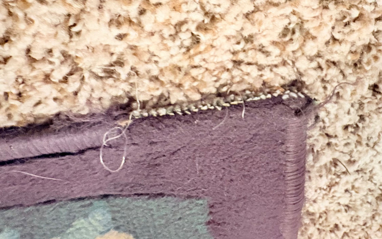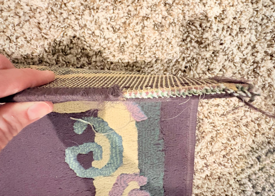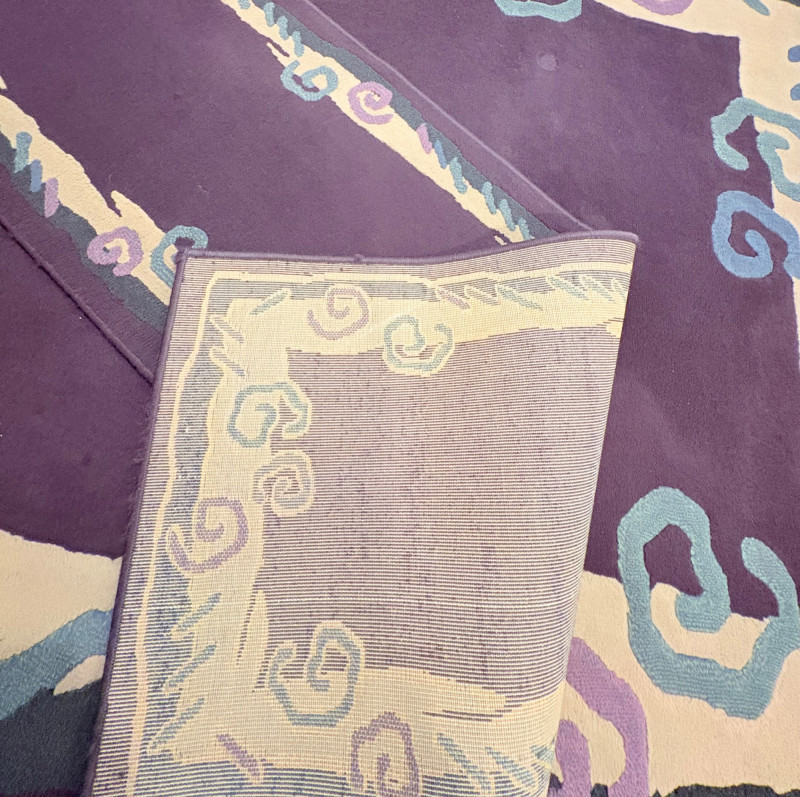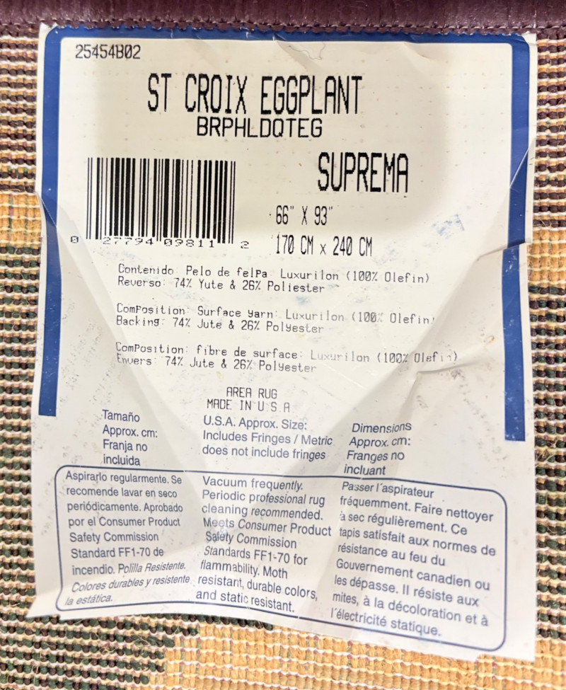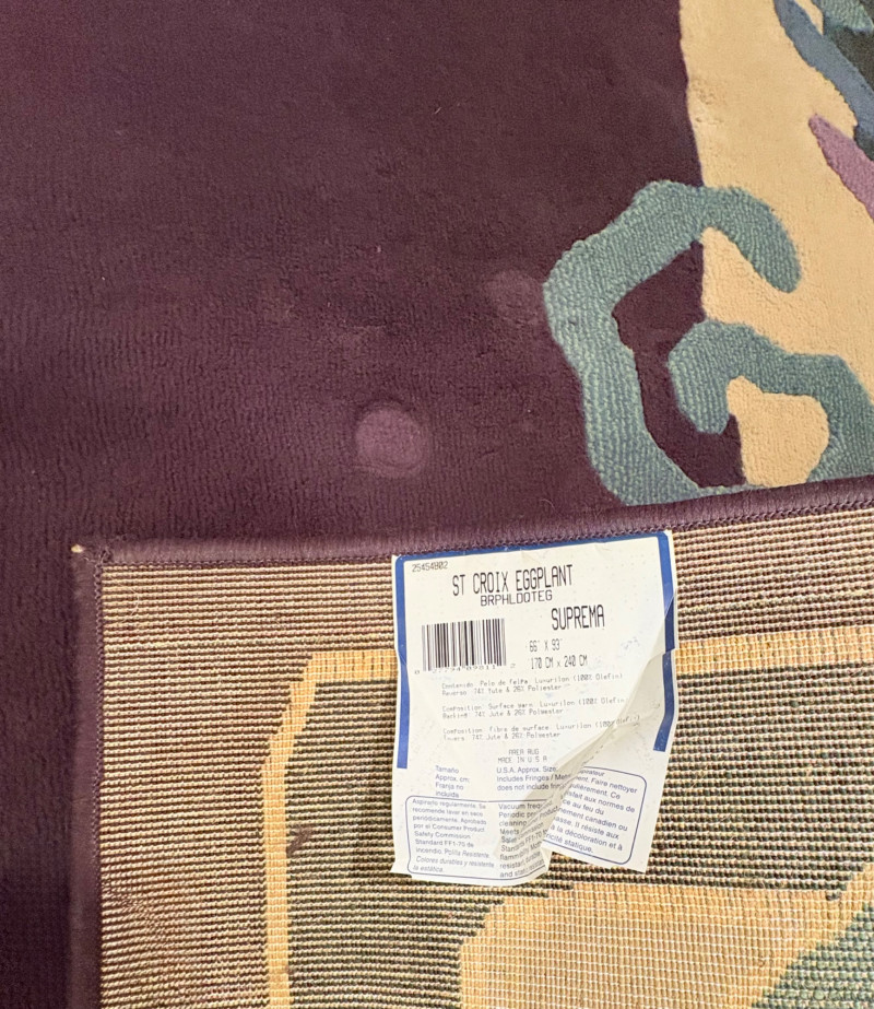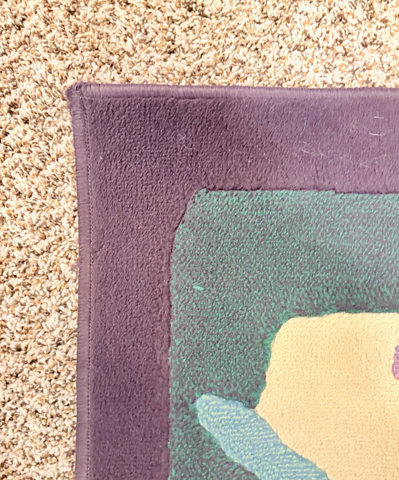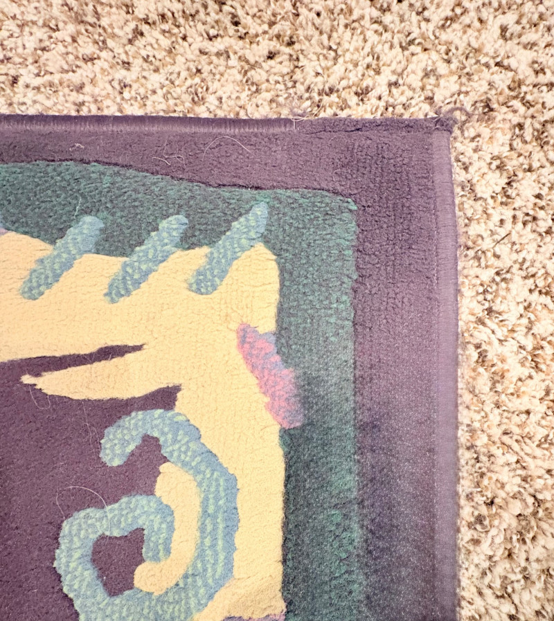 Do you like channeling a 1980s vibe? The teal, purple, and beige colors/designs on these vintage rugs are perfect for you! Large area rug with matching runner labeled "St. Croix - Eggplant". Large area rug measures 66" x 99" and is made in the USA of Olefin with jute/polyester backing. While the rug is quite dirty, the fibers appear to be in good shape as are the bound edges. We think a professional cleaning could give this hearty piece a new lease on life and could also remove the discolorations on one beige section - see 4th to last photo (The squares you see on the rug are from the legs of a dining table that was on it - they should also disappear with a professional cleaning or you can try the ice cube trick). Matching runner measures 23.5" x 99" and is in excellent shape except for one corner where the binding has been cut - it doesn't show much until you turn the edge of the runner up - see last 3 photos. Like the area rug, this one needs a professional clean, too.