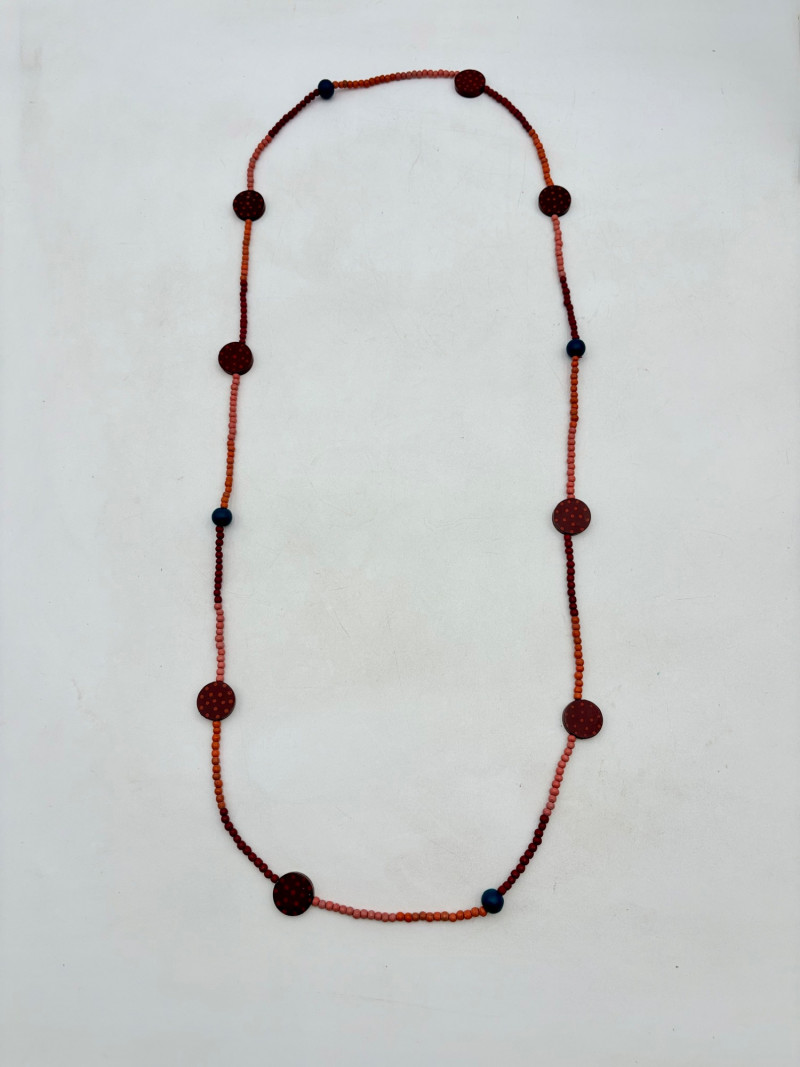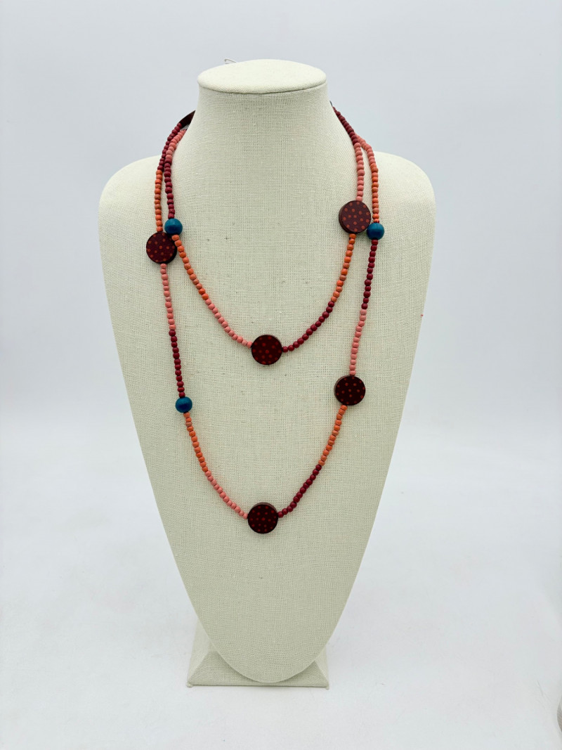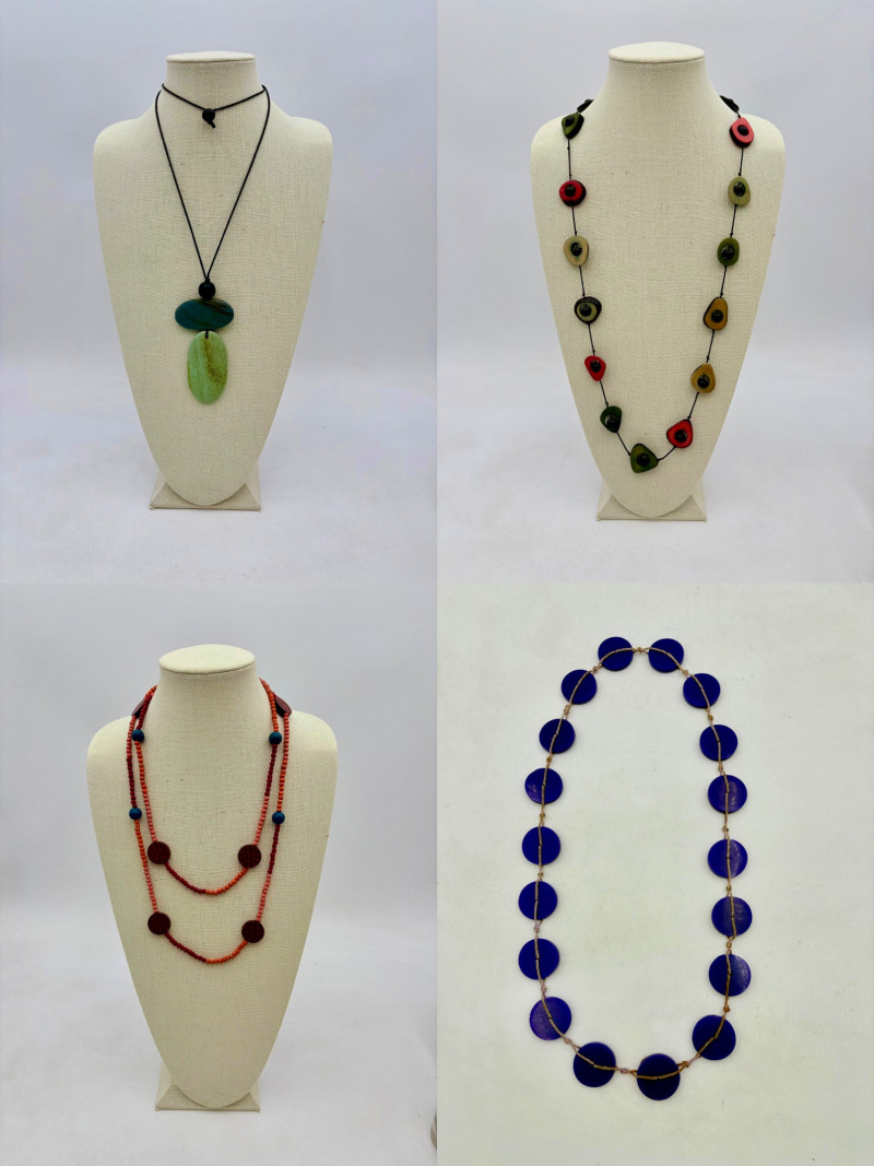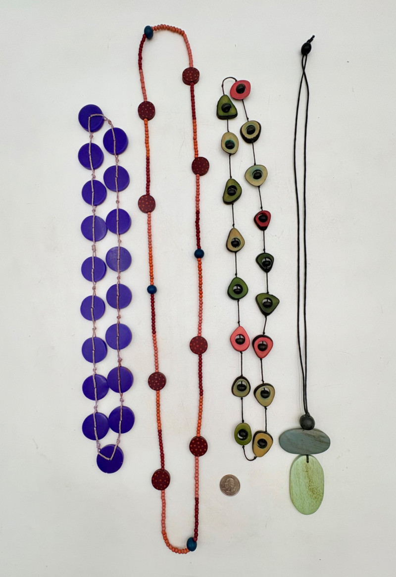 4 "old school" artsy necklaces - all of these are fairly long and can be doubled when worn. Great color combos with wonderful versatility.