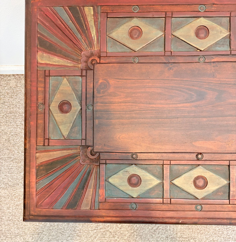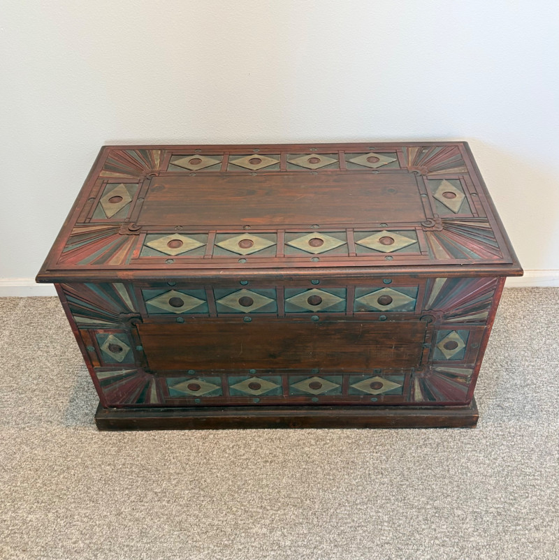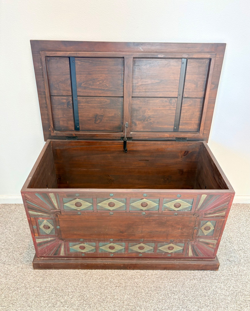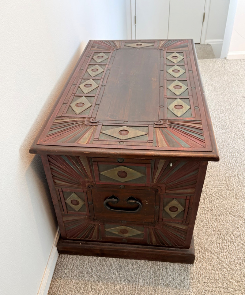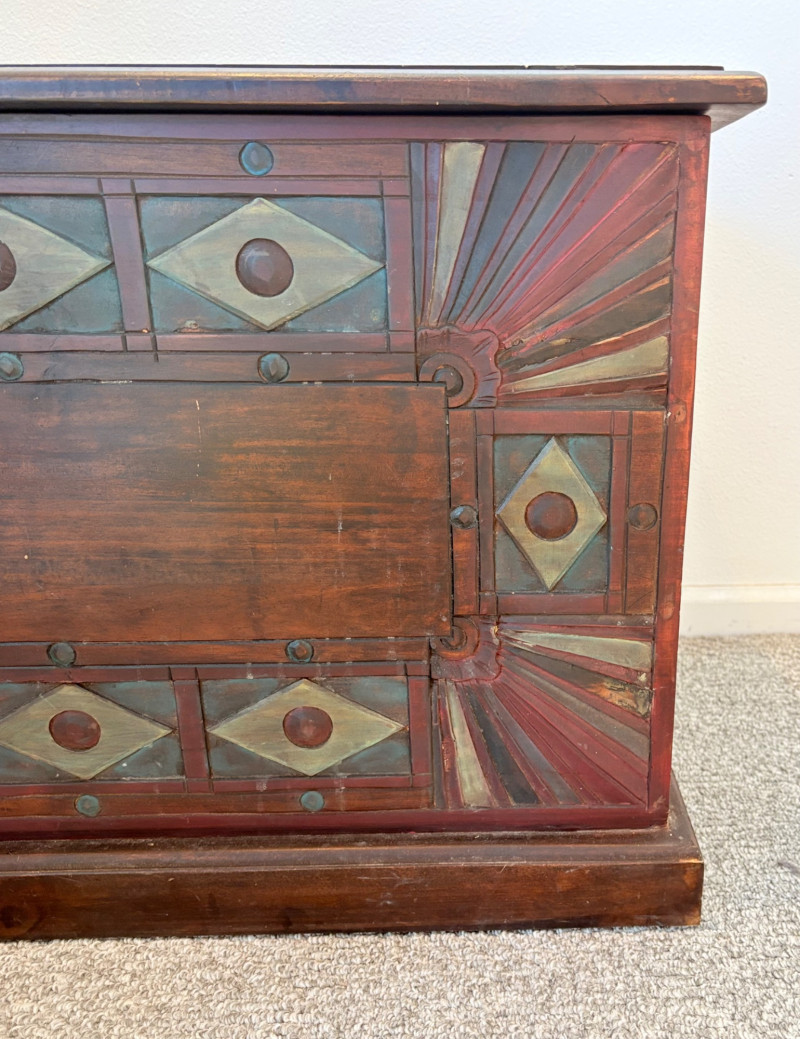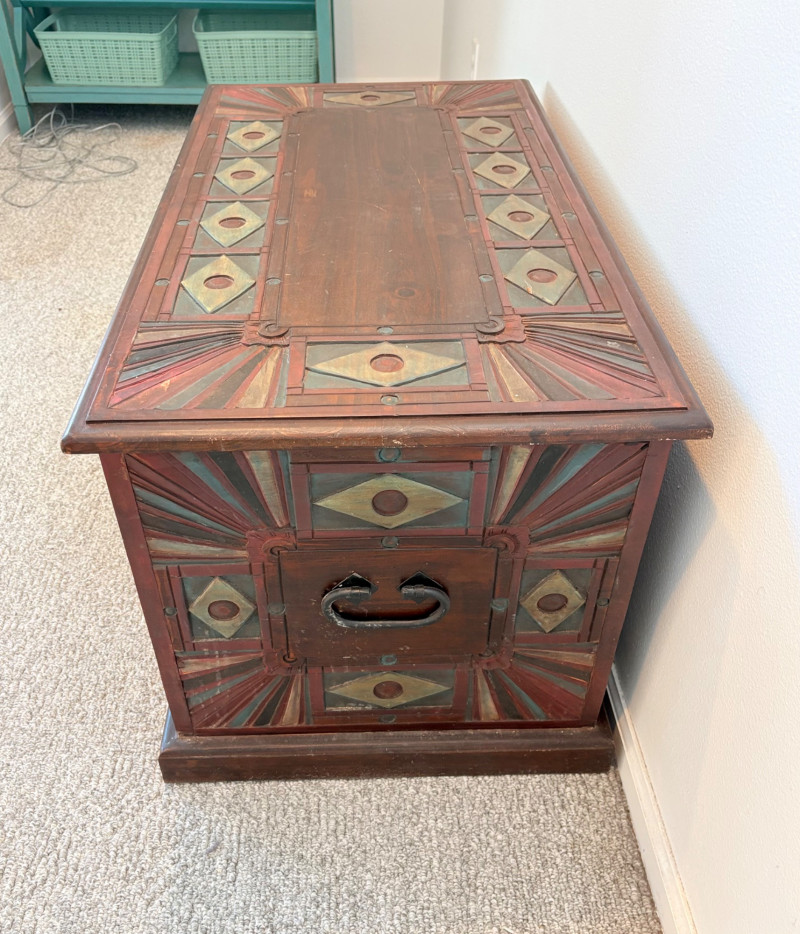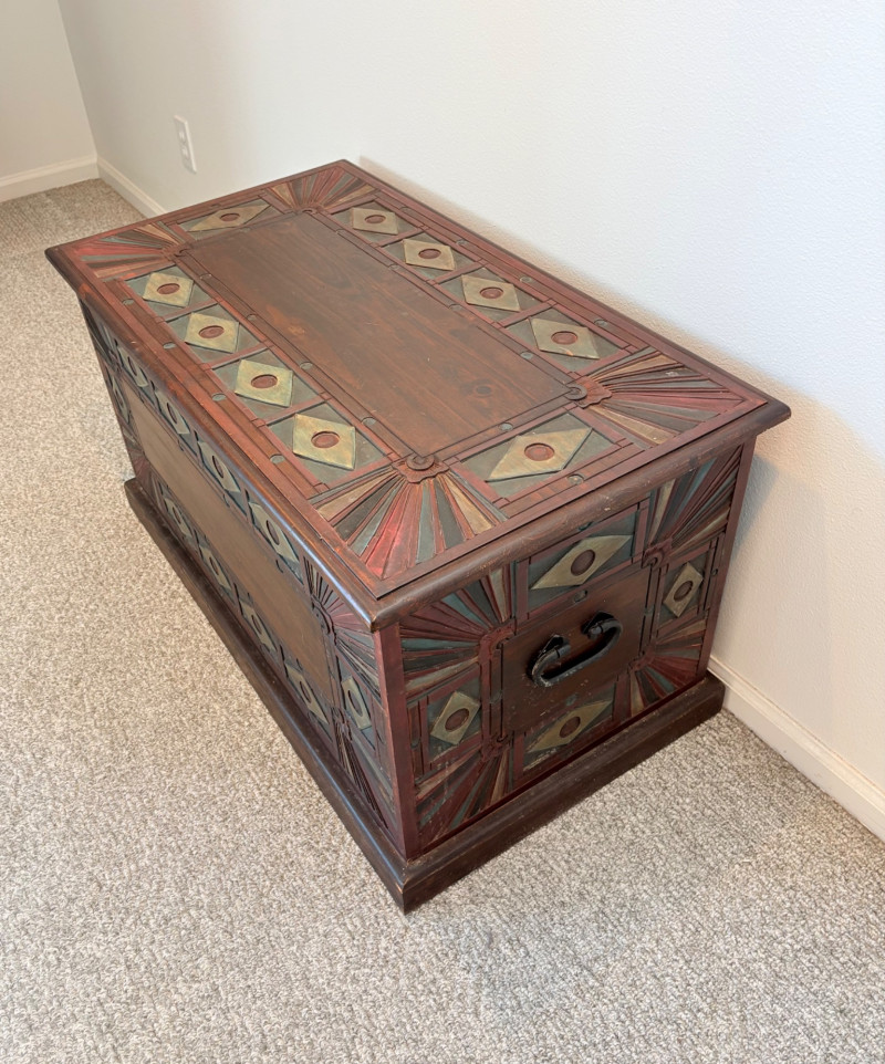 Lovely, dark-toned carved wooden chest - perfect size for linens at the end of the bed!. Chest has colors such as deep teal & pale yellow paired with dark stain. Lots of diamonds/various geometric designs, metal handles on either end, and solid base. Opens with an easy hinge and top is reinforced with metal under the lid. Shows use, but perfect if you like the "antique" look to make it appear you've had it for years. From Pier One circa early 2000s when they had terrific designs. Measures 19.5" H x 36" W x 20" D. Interior is approx. 16.5" in depth.