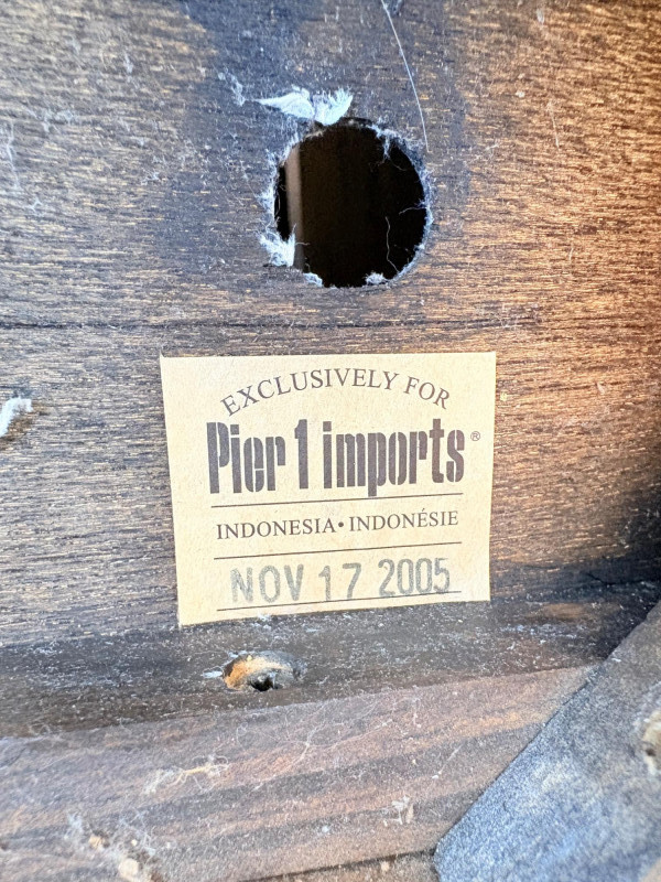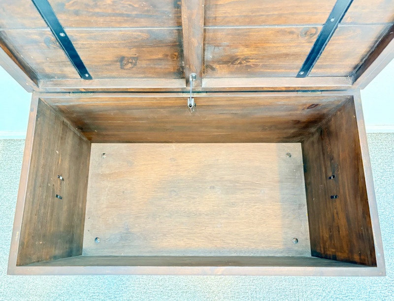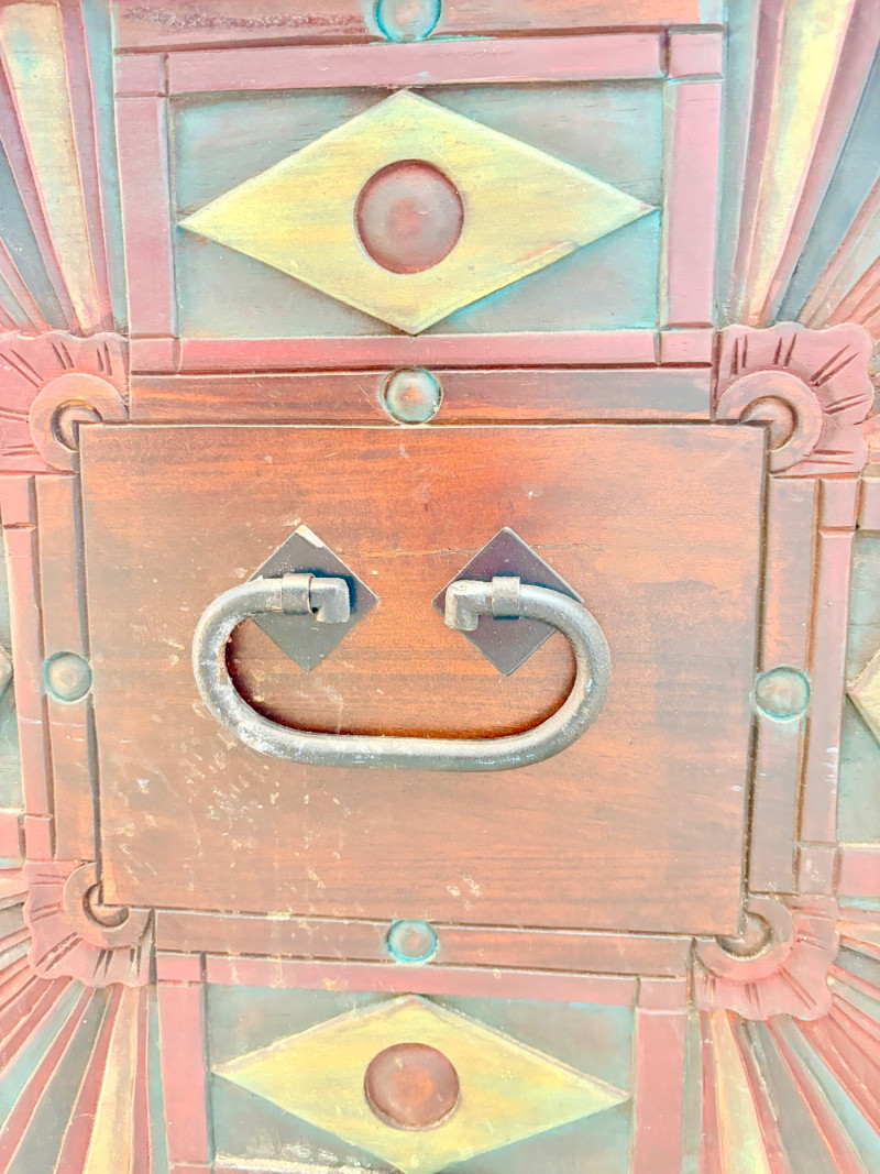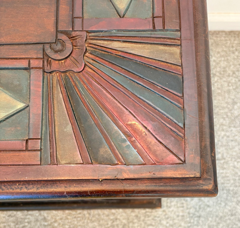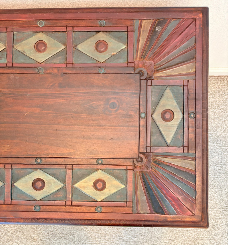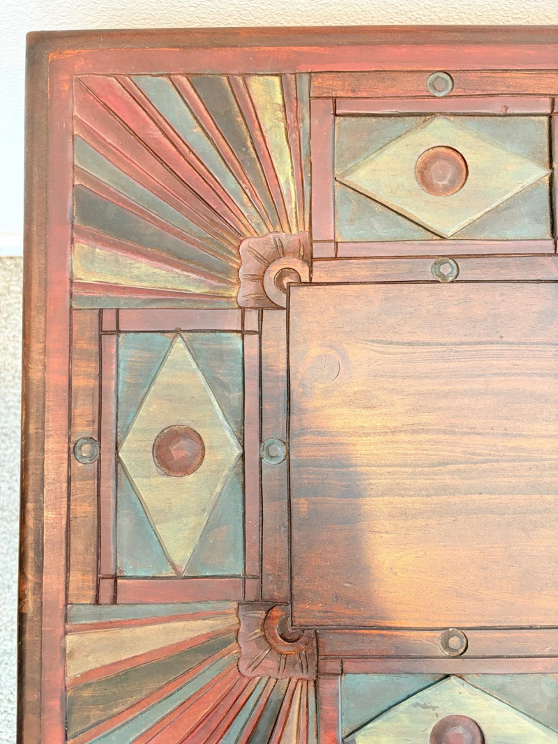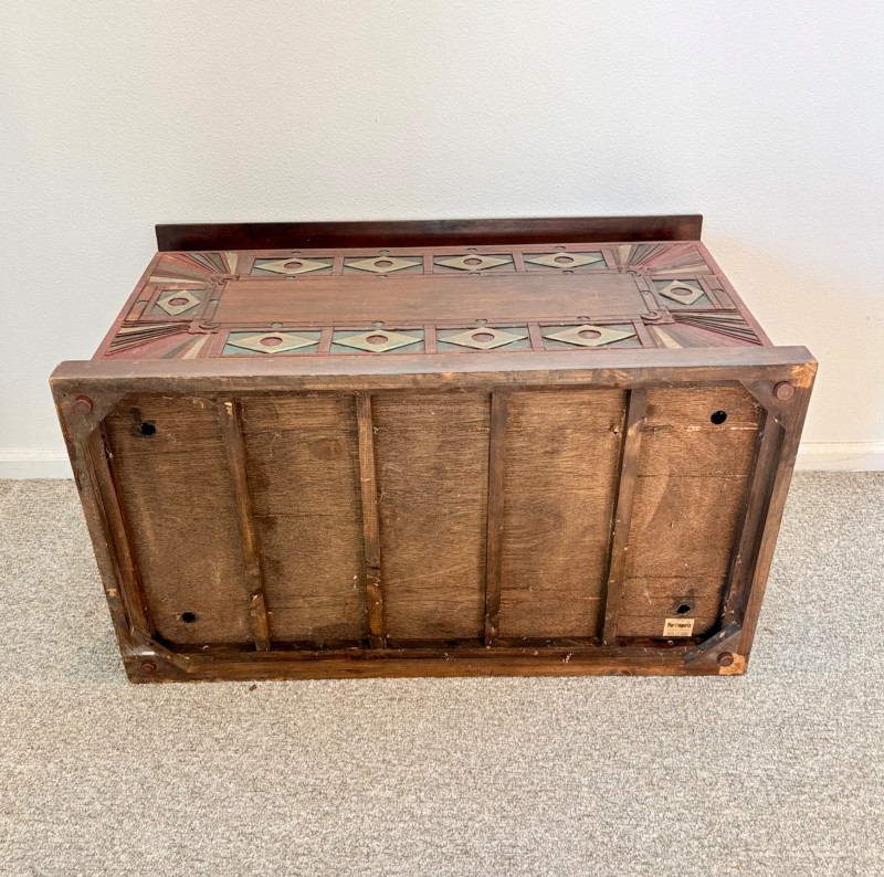 Lovely, dark-toned carved wooden chest - perfect size for linens at the end of the bed!. Chest has colors such as deep teal & pale yellow paired with dark stain. Lots of diamonds/various geometric designs, metal handles on either end, and solid base. Opens with an easy hinge and top is reinforced with metal under the lid. Shows use, but perfect if you like the "antique" look to make it appear you've had it for years. From Pier One circa early 2000s when they had terrific designs. Measures 19.5" H x 36" W x 20" D. Interior is approx. 16.5" in depth.