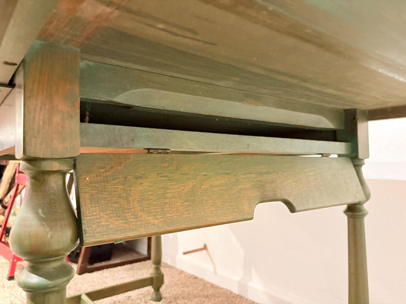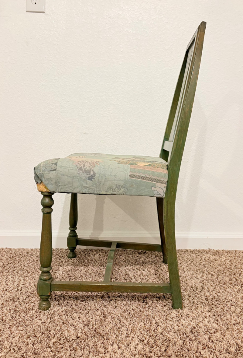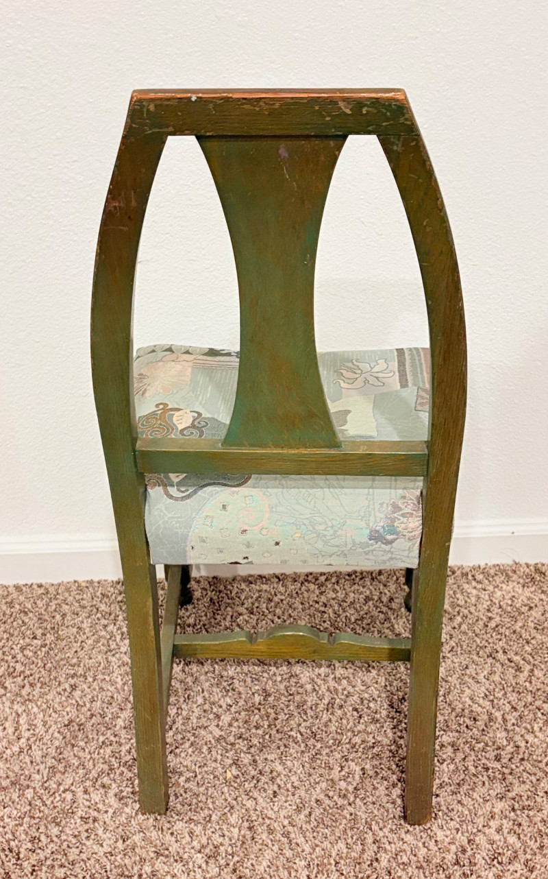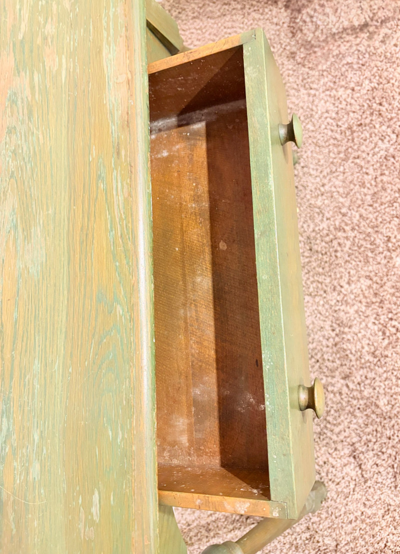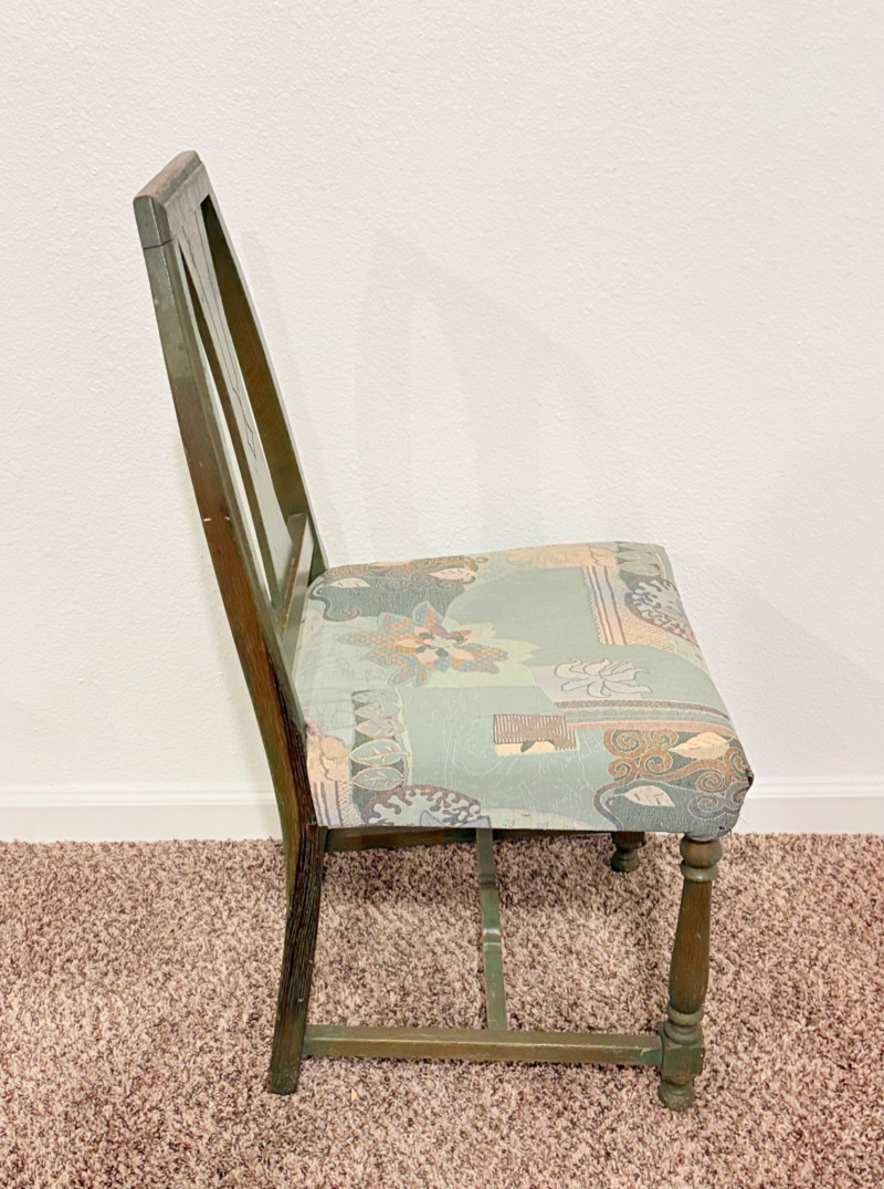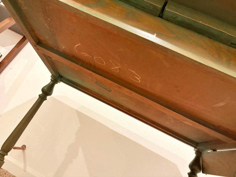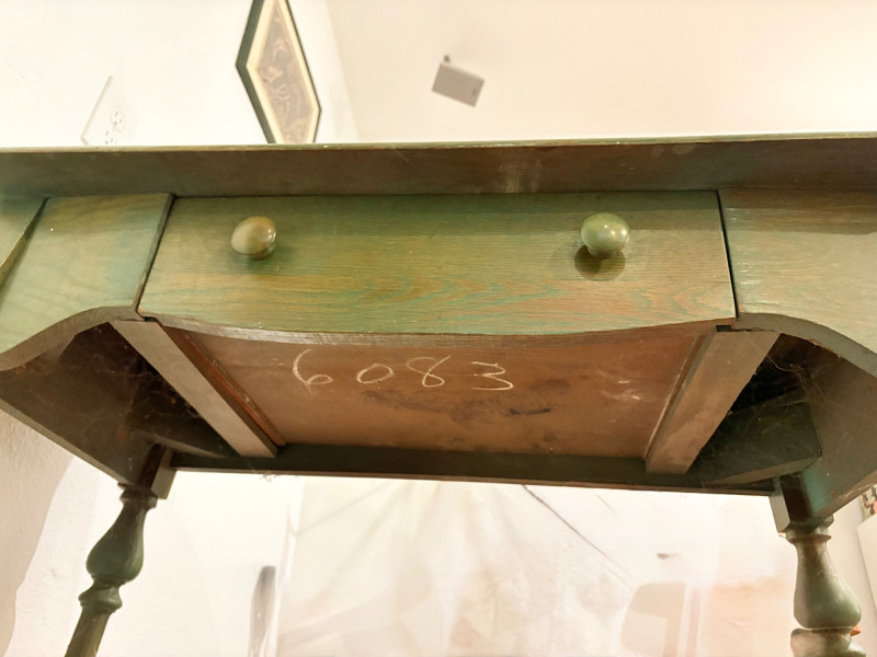 At first glance, this large grouping doesn't look very enticing, but take a closer look and you will be surprised. This is a perfect example of how DIY refinishing/tweaking can be a great return on your investment if the underlying pieces are good quality. Smaller scale than modern dining sets; this group is perfect for a small apartment or for use in an art room (how our client used this set). The dining table, 4 chairs, and spinet desk are all from MCM furniture-maker Haywood-Wakefield of Chicago. All are solid wood and feature spindle legs, solid joinery, and great lines - we believe these are from the 1940s and they have withstood time well despite the green translucent stain now being a bit worse for wear in places. With some wood refinishing (if you don't like the naturally distressed look), upholstery fabric, and a stapler, you could have this set looking new and it could last for another 80 years. Spinet desk with incised decoration has backsplash, splayed legs, and single drawer (note that the drawer sticks a bit right now - soap will probably fix). Measures. 32 " to table surface plus an additional 3.5" H with backsplash x 36" W x 17.5" D. Set of 4 chairs with atrocious upholstery have single flat back column supports with incised decoration, unusual back shape, slight curvature in chair pitch, and flare-front seats. Measure 34" H x 16" W x 15.5" D. 3 of the 4 are currently in the same fabric. The seats are in need of reupholstering; see last 2 photos.** Dining table is expandable - 2 leaves measuring 8.5" each reside in a hidden pocket at one end of the table. The leaves can be used alone or together. Mechanism for insertion works with a terrific gear wheel - see photos. Measures 30" H x 42.5" L x 36" D. Expanded the length increases to 60". *H-W made great solid wood furniture and was a mainstay for almost 150 years before ceasing production in 1980s. It was revived about a decade later and now makes MCM style furniture for the modern home ** Remove the current upholstery to use as a pattern, lay new foam if desired, cut new fabric, tuck edges, staple, and you are done.