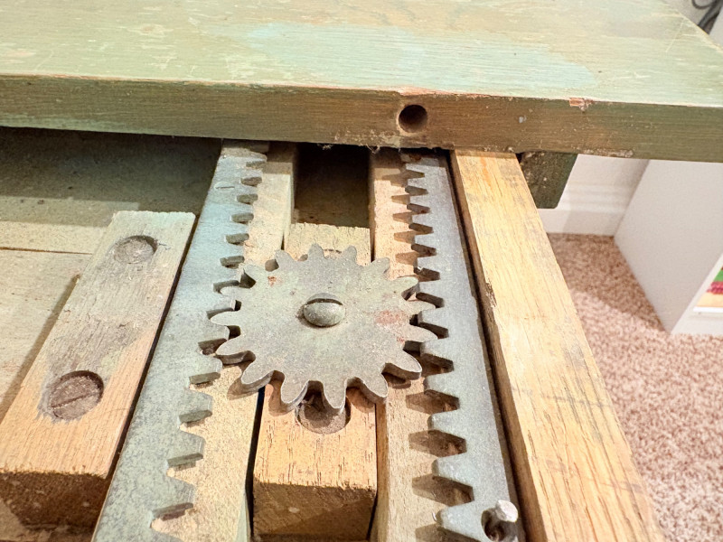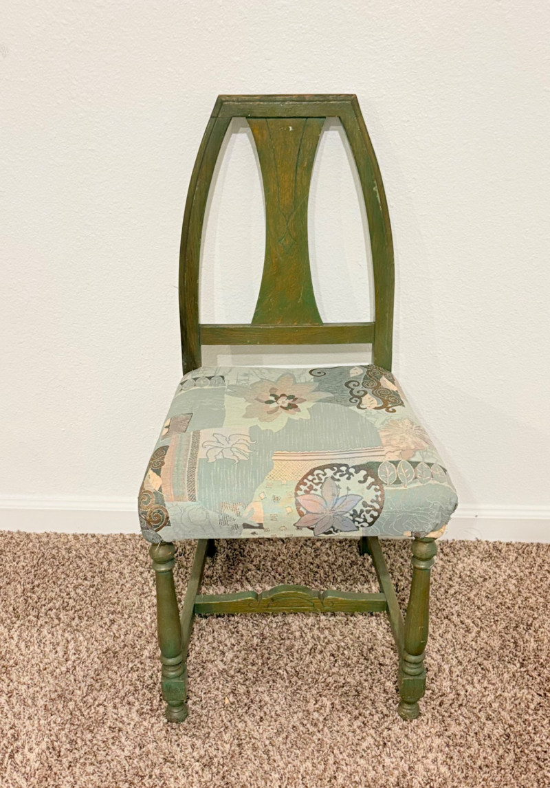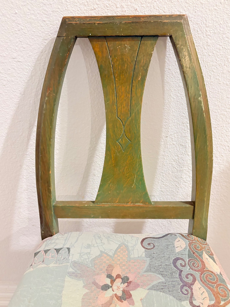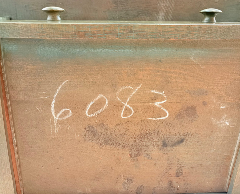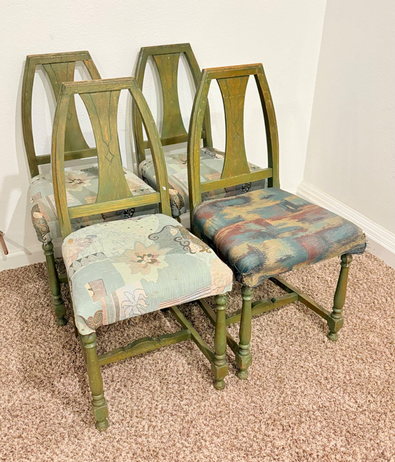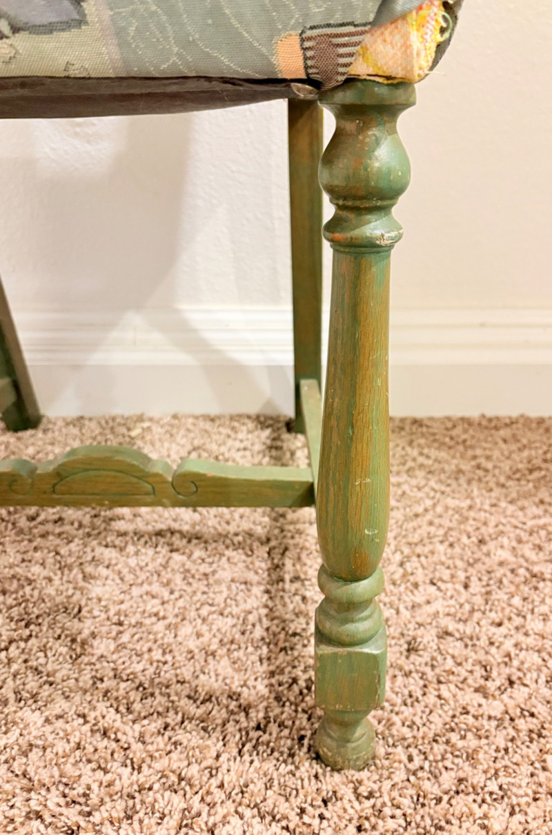 At first glance, this large grouping doesn't look very enticing, but take a closer look and you will be surprised. This is a perfect example of how DIY refinishing/tweaking can be a great return on your investment if the underlying pieces are good quality. Smaller scale than modern dining sets; this group is perfect for a small apartment or for use in an art room (how our client used this set). The dining table, 4 chairs, and spinet desk are all from MCM furniture-maker Haywood-Wakefield of Chicago. All are solid wood and feature spindle legs, solid joinery, and great lines - we believe these are from the 1940s and they have withstood time well despite the green translucent stain now being a bit worse for wear in places. With some wood refinishing (if you don't like the naturally distressed look), upholstery fabric, and a stapler, you could have this set looking new and it could last for another 80 years. Spinet desk with incised decoration has backsplash, splayed legs, and single drawer (note that the drawer sticks a bit right now - soap will probably fix). Measures. 32 " to table surface plus an additional 3.5" H with backsplash x 36" W x 17.5" D. Set of 4 chairs with atrocious upholstery have single flat back column supports with incised decoration, unusual back shape, slight curvature in chair pitch, and flare-front seats. Measure 34" H x 16" W x 15.5" D. 3 of the 4 are currently in the same fabric. The seats are in need of reupholstering; see last 2 photos.** Dining table is expandable - 2 leaves measuring 8.5" each reside in a hidden pocket at one end of the table. The leaves can be used alone or together. Mechanism for insertion works with a terrific gear wheel - see photos. Measures 30" H x 42.5" L x 36" D. Expanded the length increases to 60". *H-W made great solid wood furniture and was a mainstay for almost 150 years before ceasing production in 1980s. It was revived about a decade later and now makes MCM style furniture for the modern home ** Remove the current upholstery to use as a pattern, lay new foam if desired, cut new fabric, tuck edges, staple, and you are done.