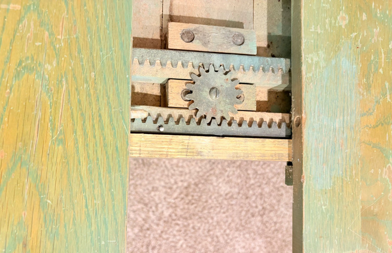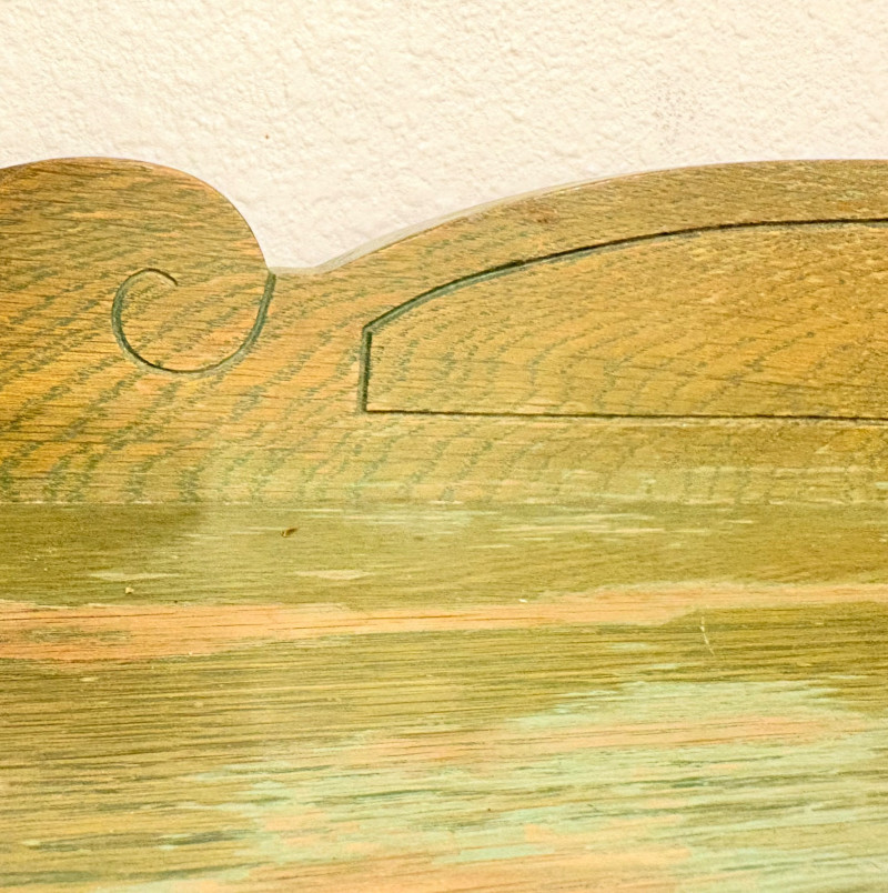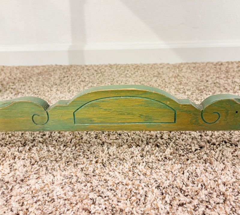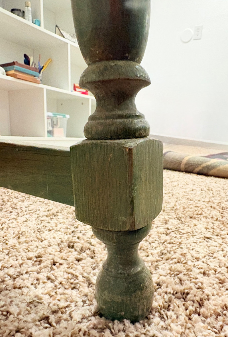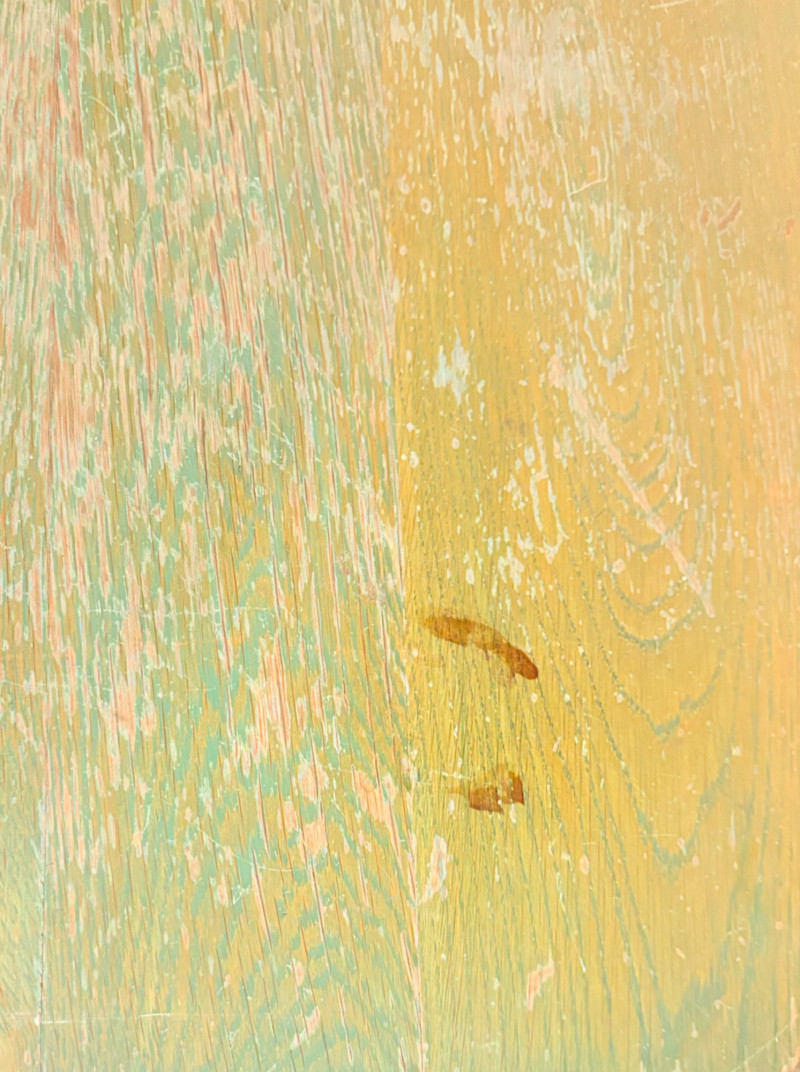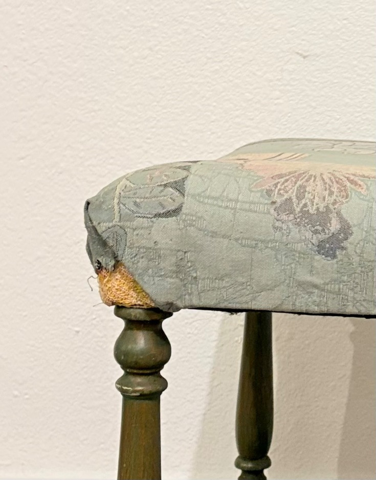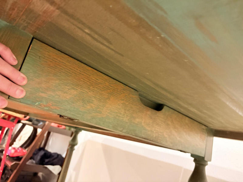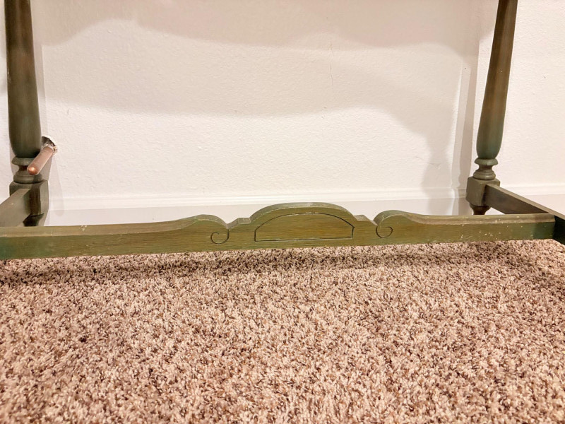 At first glance, this large grouping doesn't look very enticing, but take a closer look and you will be surprised. This is a perfect example of how DIY refinishing/tweaking can be a great return on your investment if the underlying pieces are good quality. Smaller scale than modern dining sets; this group is perfect for a small apartment or for use in an art room (how our client used this set). The dining table, 4 chairs, and spinet desk are all from MCM furniture-maker Haywood-Wakefield of Chicago. All are solid wood and feature spindle legs, solid joinery, and great lines - we believe these are from the 1940s and they have withstood time well despite the green translucent stain now being a bit worse for wear in places. With some wood refinishing (if you don't like the naturally distressed look), upholstery fabric, and a stapler, you could have this set looking new and it could last for another 80 years. Spinet desk with incised decoration has backsplash, splayed legs, and single drawer (note that the drawer sticks a bit right now - soap will probably fix). Measures. 32 " to table surface plus an additional 3.5" H with backsplash x 36" W x 17.5" D. Set of 4 chairs with atrocious upholstery have single flat back column supports with incised decoration, unusual back shape, slight curvature in chair pitch, and flare-front seats. Measure 34" H x 16" W x 15.5" D. 3 of the 4 are currently in the same fabric. The seats are in need of reupholstering; see last 2 photos.** Dining table is expandable - 2 leaves measuring 8.5" each reside in a hidden pocket at one end of the table. The leaves can be used alone or together. Mechanism for insertion works with a terrific gear wheel - see photos. Measures 30" H x 42.5" L x 36" D. Expanded the length increases to 60". *H-W made great solid wood furniture and was a mainstay for almost 150 years before ceasing production in 1980s. It was revived about a decade later and now makes MCM style furniture for the modern home ** Remove the current upholstery to use as a pattern, lay new foam if desired, cut new fabric, tuck edges, staple, and you are done.