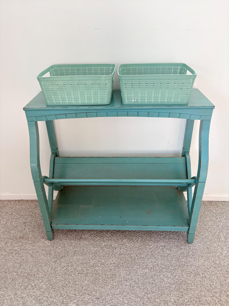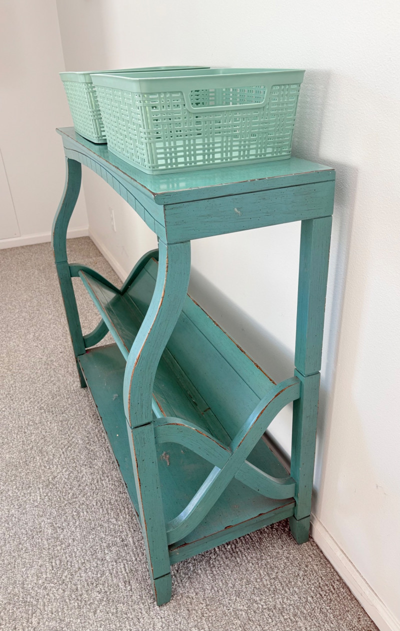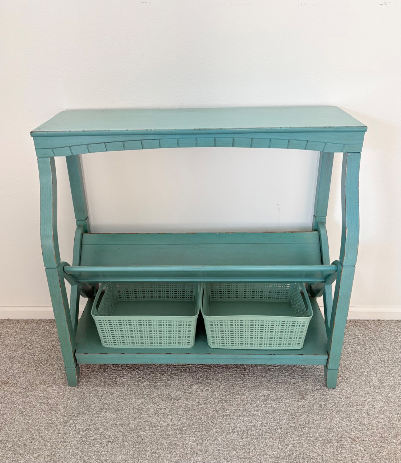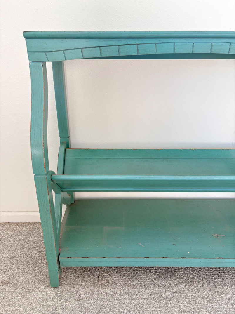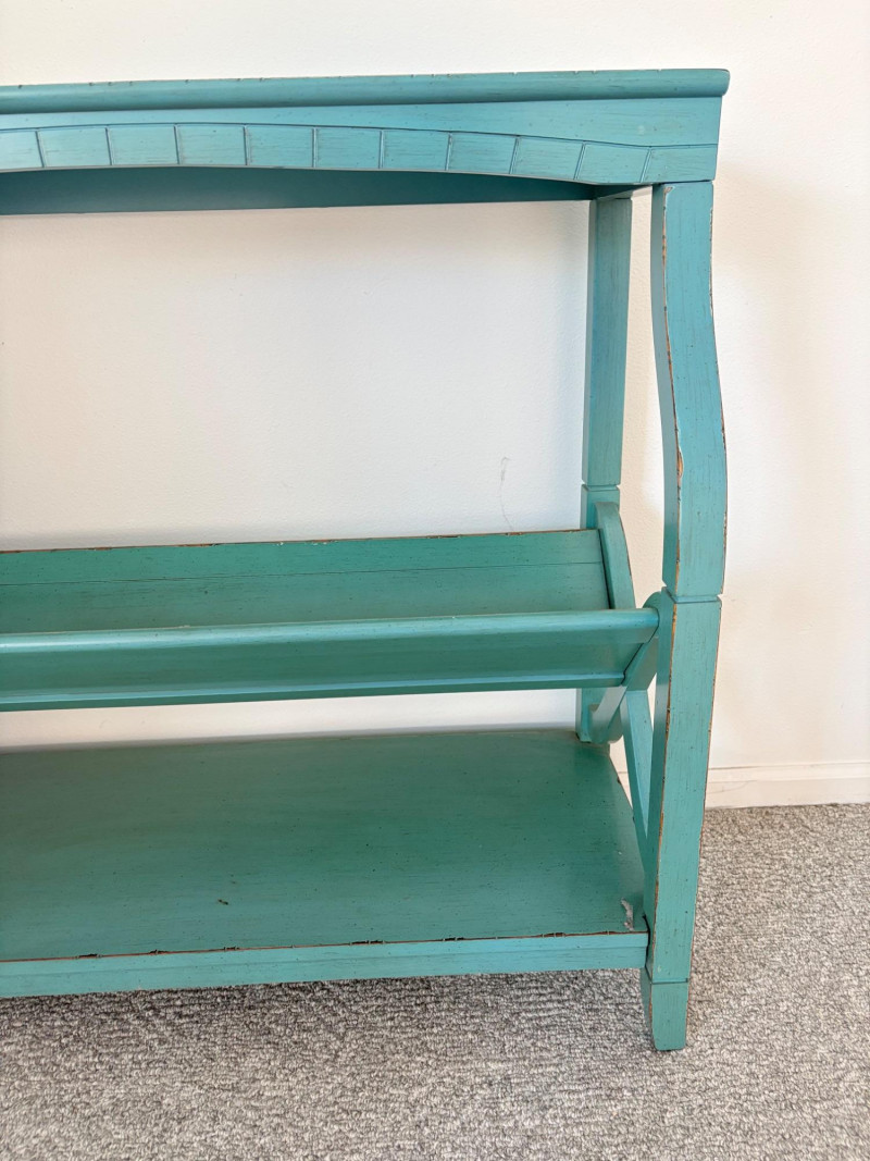 Distressed teal bookshelf has angled middle shelf, flat bottom shelf, and slightly curved front legs. Apron has slight curve with incised vertical lines. From Pier One. Generally in very good shape, but some scratching on the top surface in the right light - see last photo. Measures 34" H x 36" L x 15" D. Also included are 2 plastic storage baskets that measure approx. 11" x 14". .