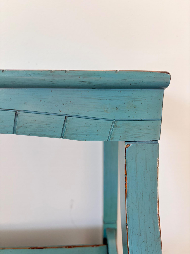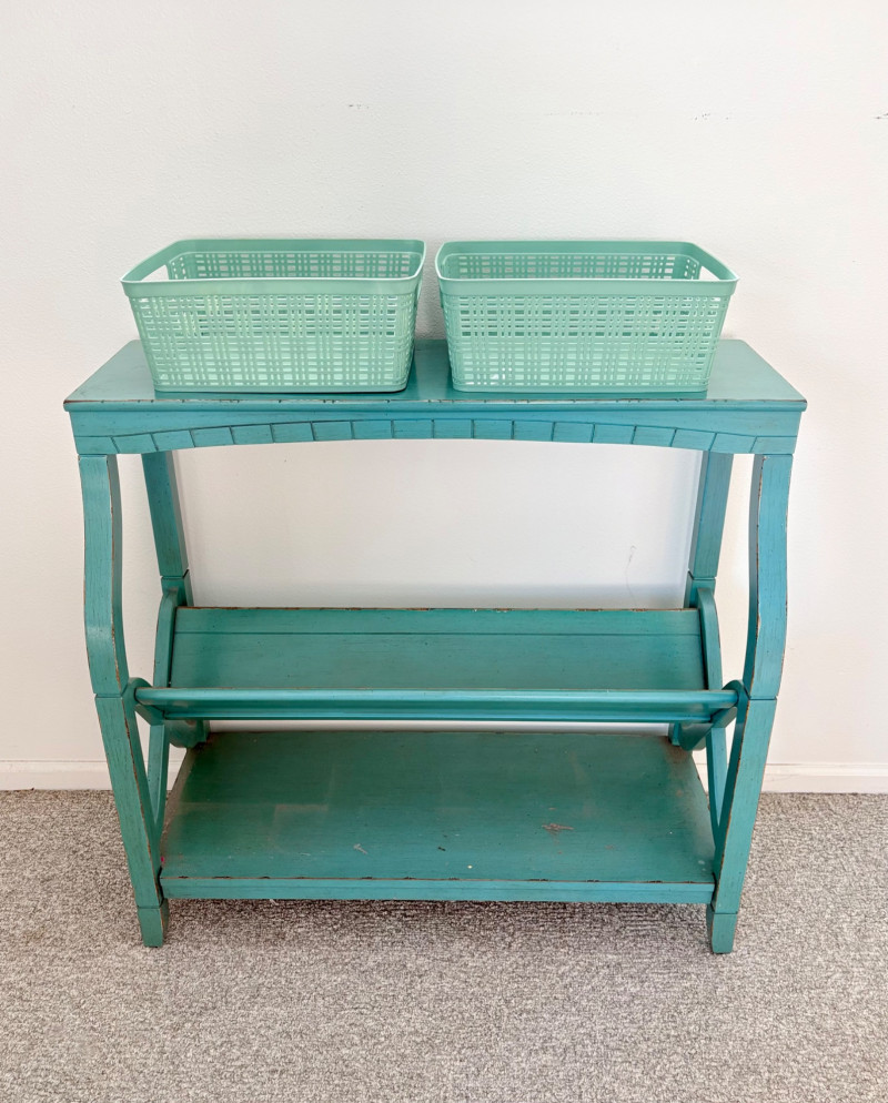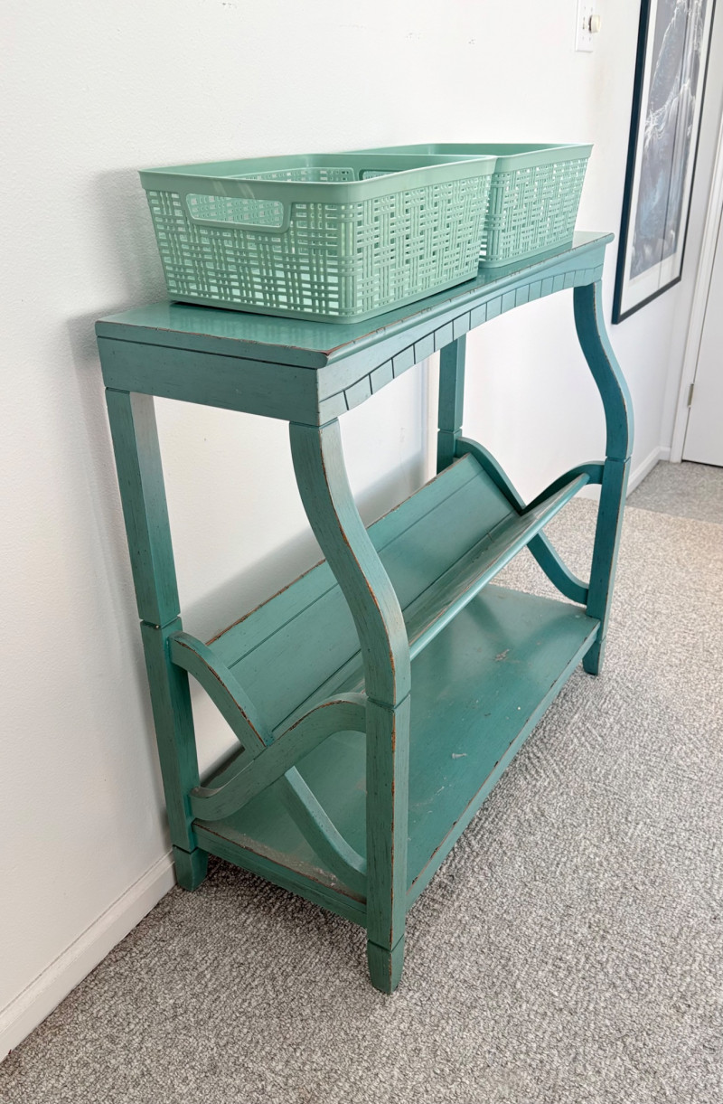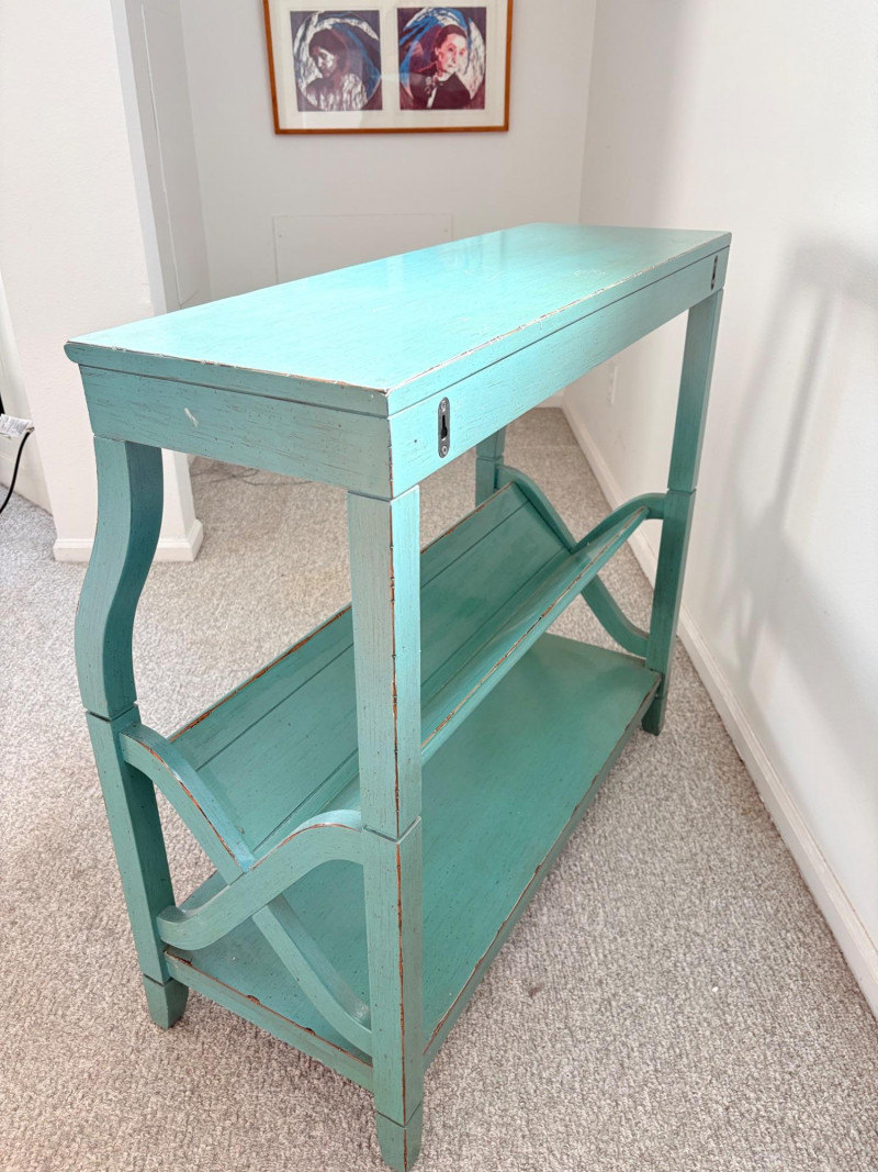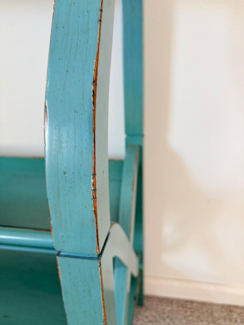 Distressed teal bookshelf has angled middle shelf, flat bottom shelf, and slightly curved front legs. Apron has slight curve with incised vertical lines. From Pier One. Generally in very good shape, but some scratching on the top surface in the right light - see last photo. Measures 34" H x 36" L x 15" D. Also included are 2 plastic storage baskets that measure approx. 11" x 14". .