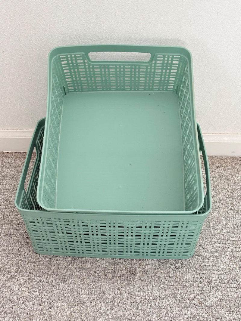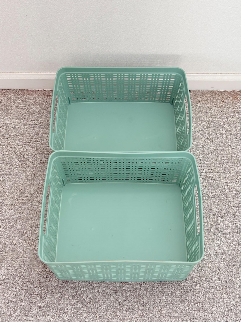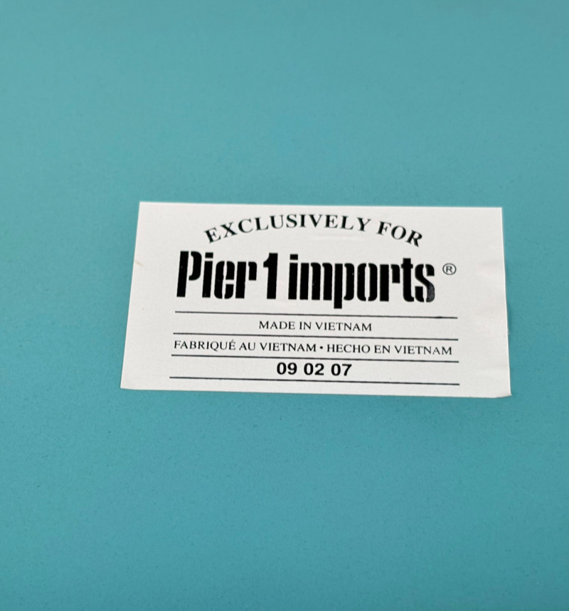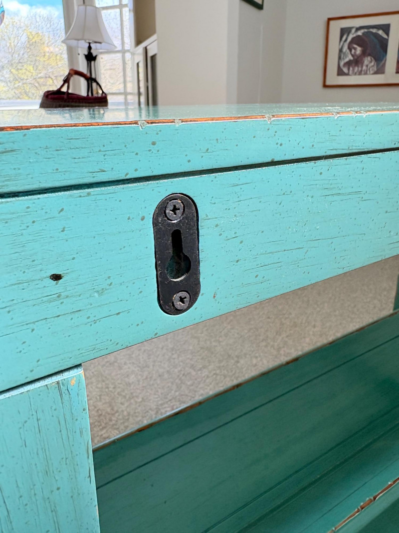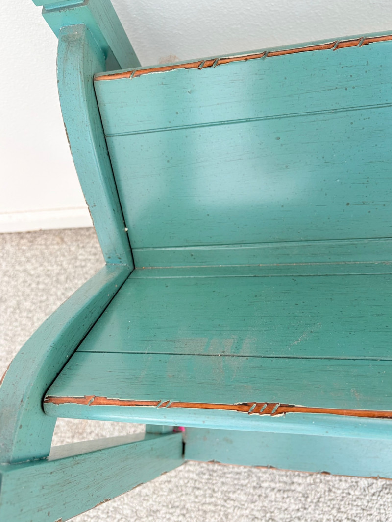 Distressed teal bookshelf has angled middle shelf, flat bottom shelf, and slightly curved front legs. Apron has slight curve with incised vertical lines. From Pier One. Generally in very good shape, but some scratching on the top surface in the right light - see last photo. Measures 34" H x 36" L x 15" D. Also included are 2 plastic storage baskets that measure approx. 11" x 14". .