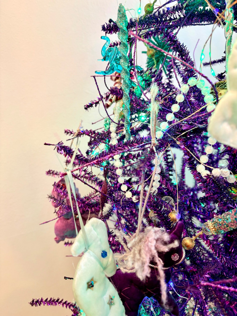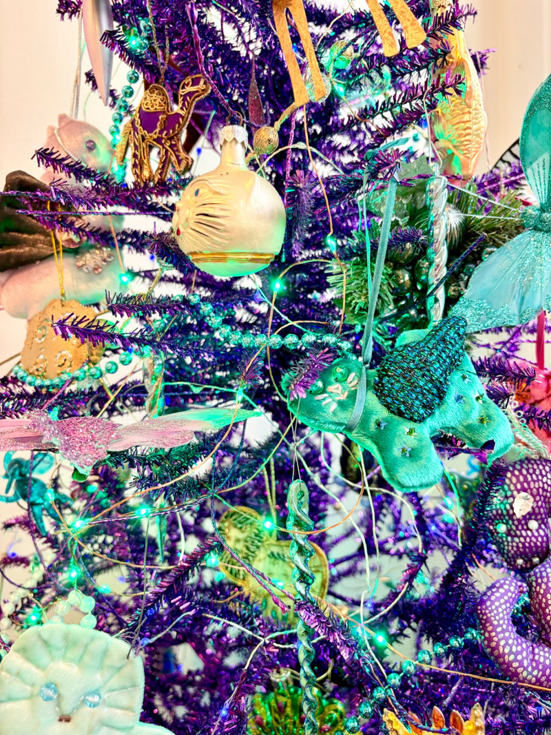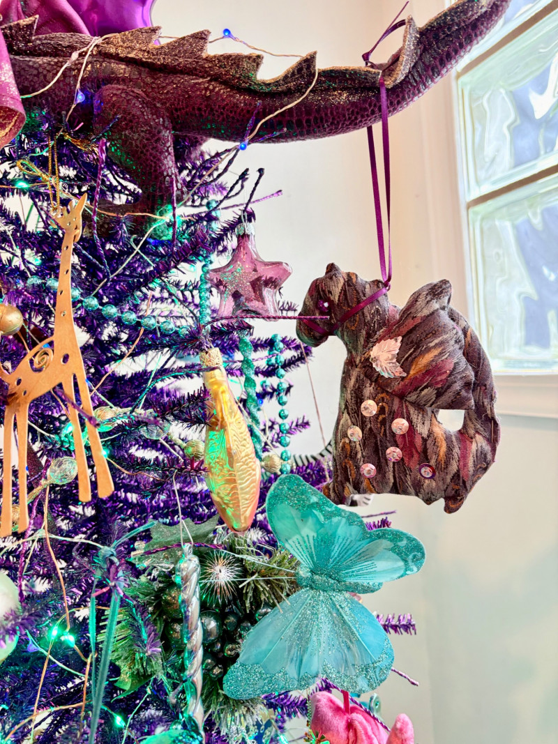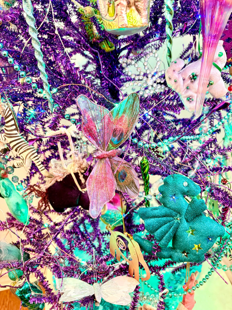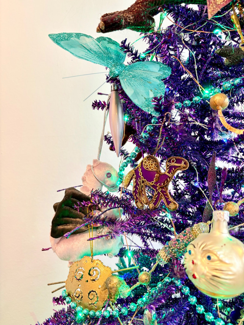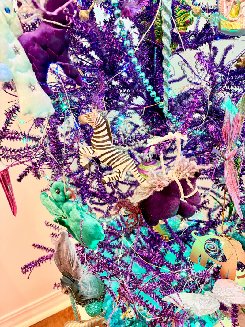 If you like sparkles, LED lights, and saturated color along with animal ornaments, this is the decorative tree for you. Appropriate for year-round display because of its lack of "Christmas" theme! Purple tree with green, purple, and blue lights. Loaded down with animals of all kinds in terms of ornaments: cats-birds, insects, and all sorts of other things including a dragon just below the star tree topper. Ornaments are puffy, glitter, and glass ornaments - a real feast for the eyes. Includes sequined blue table skirt and white table. Measures 55" H from stand to treetop with an additional 16" for the table. BONUS: We found a bunch more ornaments and are adding them to this lot!