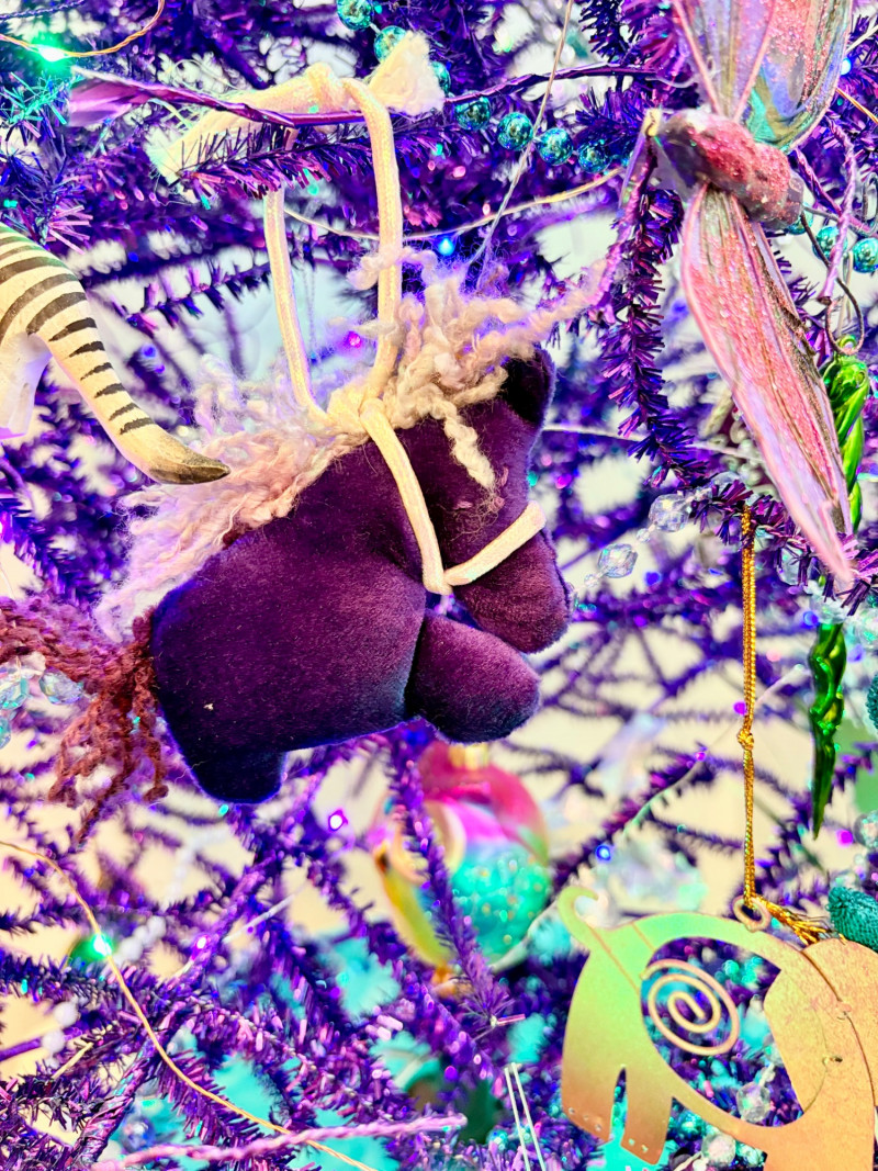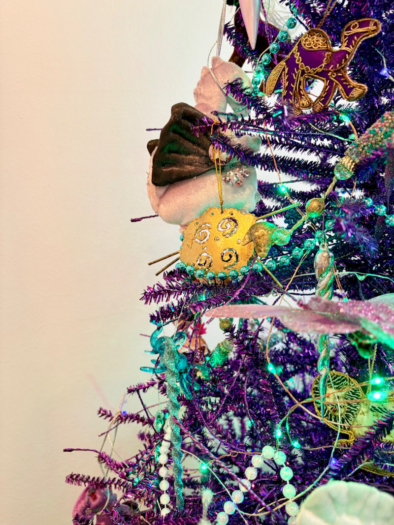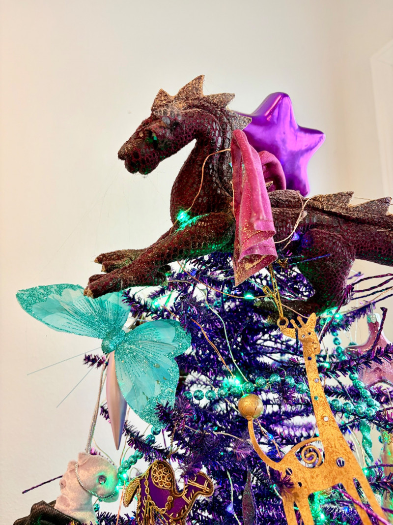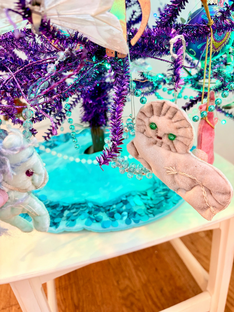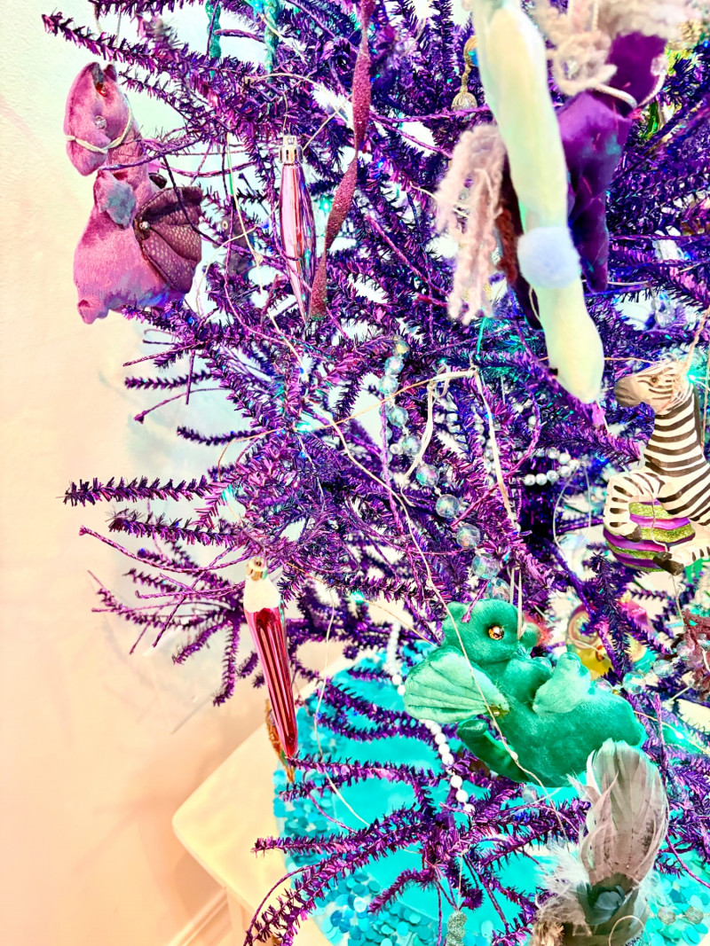 If you like sparkles, LED lights, and saturated color along with animal ornaments, this is the decorative tree for you. Appropriate for year-round display because of its lack of "Christmas" theme! Purple tree with green, purple, and blue lights. Loaded down with animals of all kinds in terms of ornaments: cats-birds, insects, and all sorts of other things including a dragon just below the star tree topper. Ornaments are puffy, glitter, and glass ornaments - a real feast for the eyes. Includes sequined blue table skirt and white table. Measures 55" H from stand to treetop with an additional 16" for the table. BONUS: We found a bunch more ornaments and are adding them to this lot!