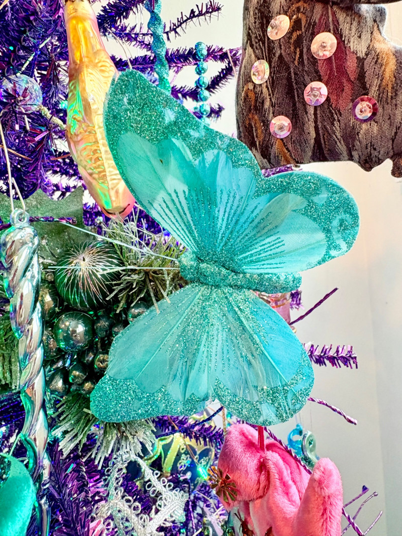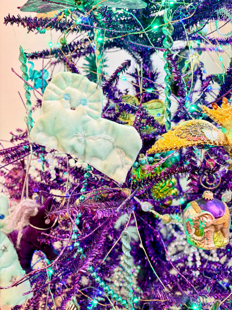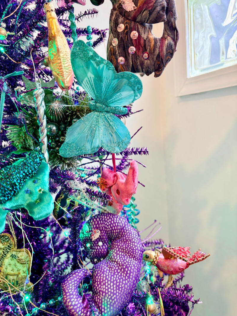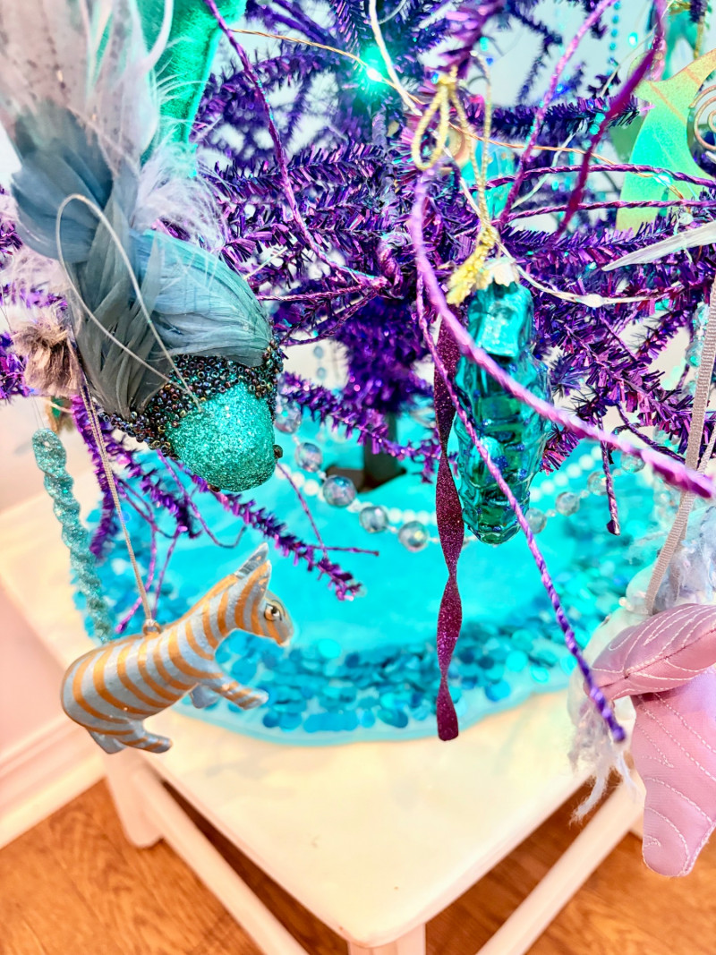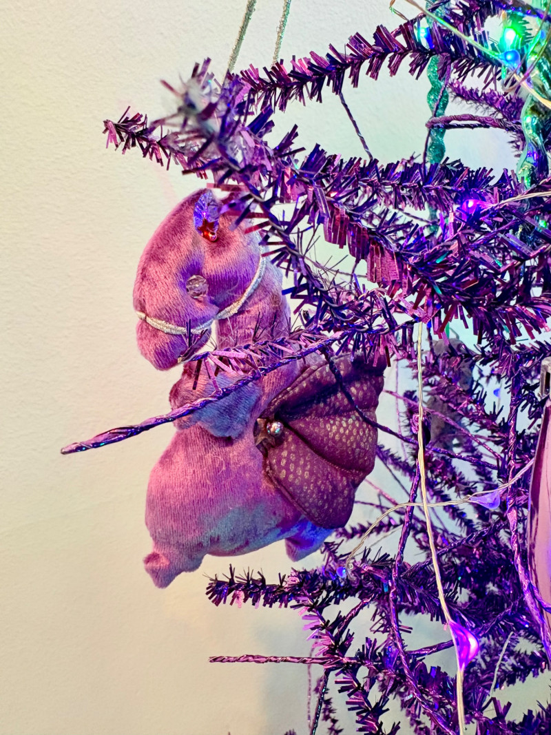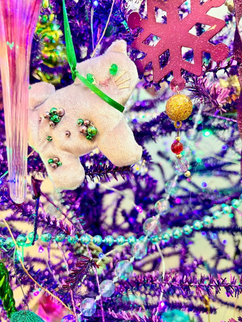 If you like sparkles, LED lights, and saturated color along with animal ornaments, this is the decorative tree for you. Appropriate for year-round display because of its lack of "Christmas" theme! Purple tree with green, purple, and blue lights. Loaded down with animals of all kinds in terms of ornaments: cats-birds, insects, and all sorts of other things including a dragon just below the star tree topper. Ornaments are puffy, glitter, and glass ornaments - a real feast for the eyes. Includes sequined blue table skirt and white table. Measures 55" H from stand to treetop with an additional 16" for the table. BONUS: We found a bunch more ornaments and are adding them to this lot!