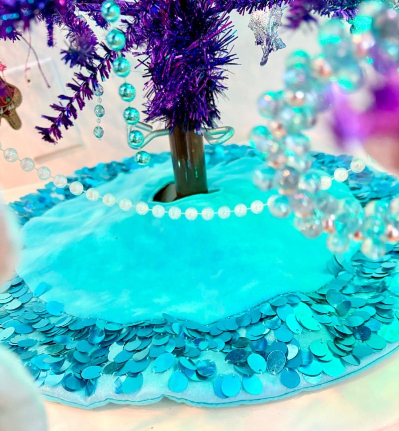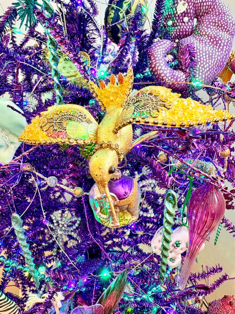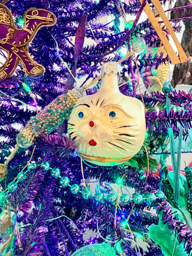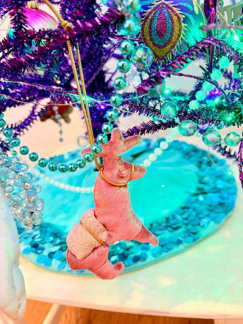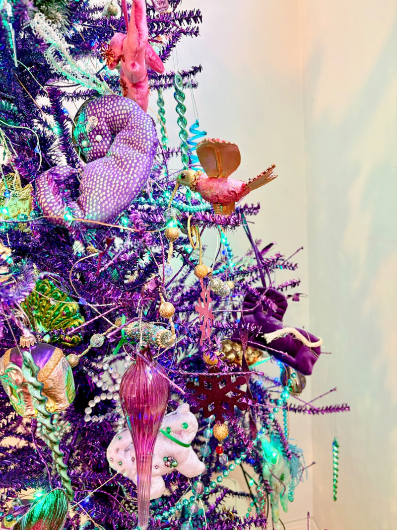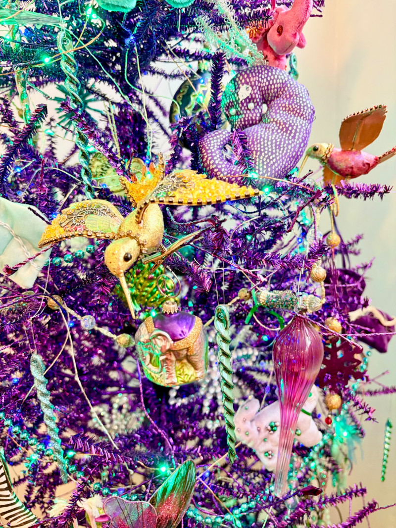 If you like sparkles, LED lights, and saturated color along with animal ornaments, this is the decorative tree for you. Appropriate for year-round display because of its lack of "Christmas" theme! Purple tree with green, purple, and blue lights. Loaded down with animals of all kinds in terms of ornaments: cats-birds, insects, and all sorts of other things including a dragon just below the star tree topper. Ornaments are puffy, glitter, and glass ornaments - a real feast for the eyes. Includes sequined blue table skirt and white table. Measures 55" H from stand to treetop with an additional 16" for the table. BONUS: We found a bunch more ornaments and are adding them to this lot!