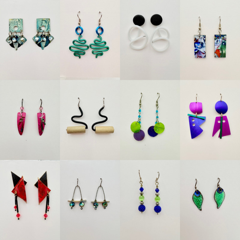 12 pairs of earrings in various styles, sizes, and shapes; all are for pierced ears and in good condition upon cursory inspection. Please see photos for details - what you see is what you get!