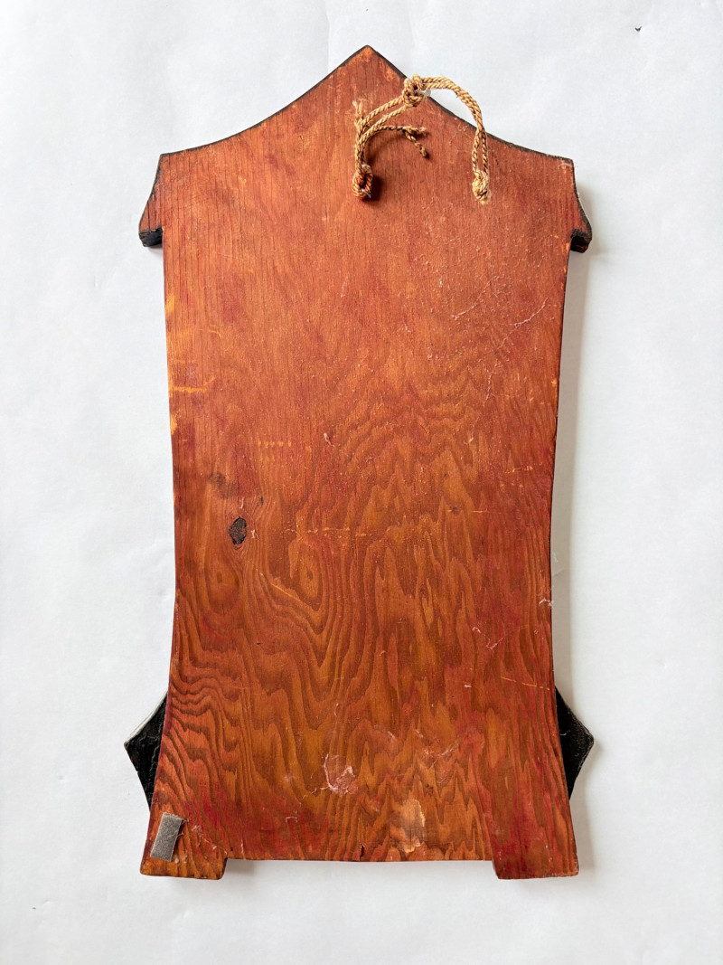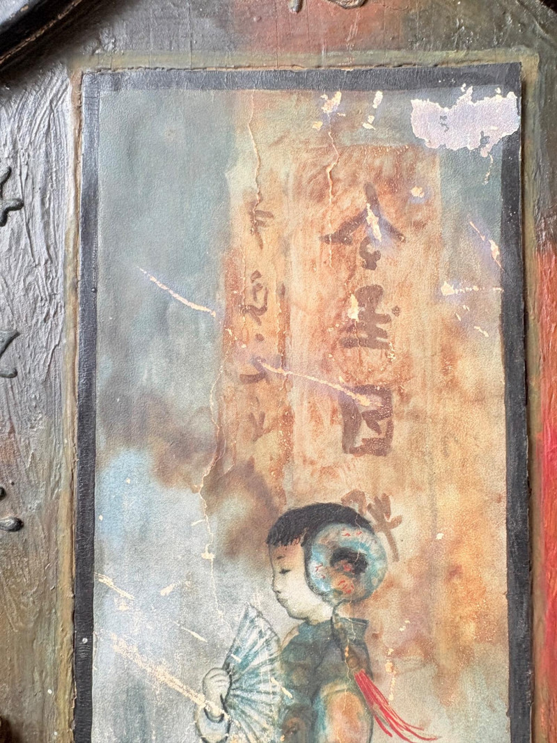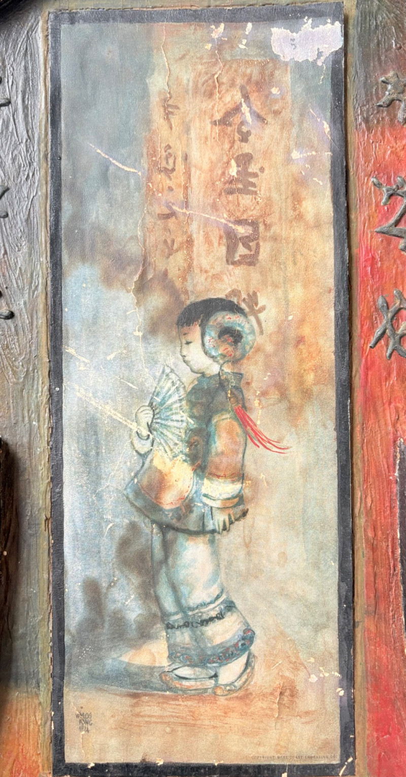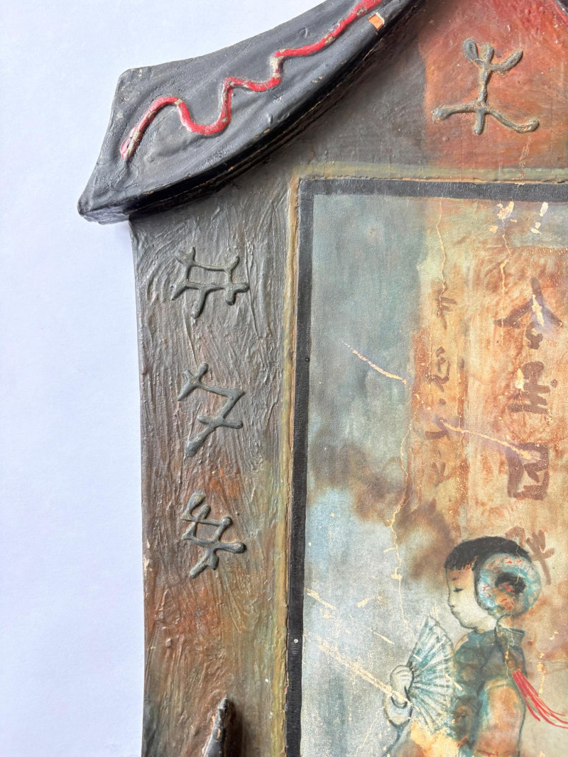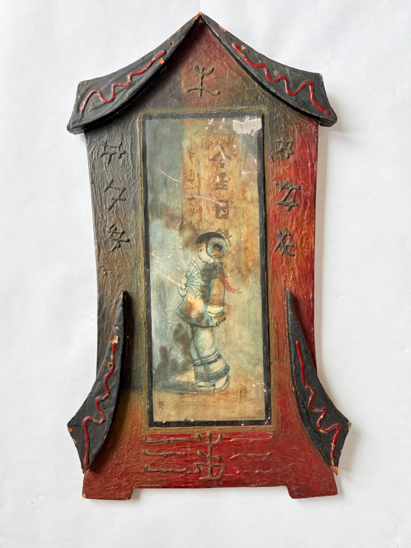 Unfortunately, we can't tell you anything about the history of this piece, but whatever its history, it is fabulous! We think this is a home-made piece of art incorporating an Asian figure print (circa 1924) mounted on a plywood backing with flourishes of pseudo-Asian-style wood pieces resembling architecture. 3-D paint has been applied for effect. The original print was done for West Coast Engraving Company as seen on the lower right of the print. This is truly a unique piece that speaks of loving creation as opposed to slick manufacture. Measures 19.5" H x 11" W and is approx. 1" D.