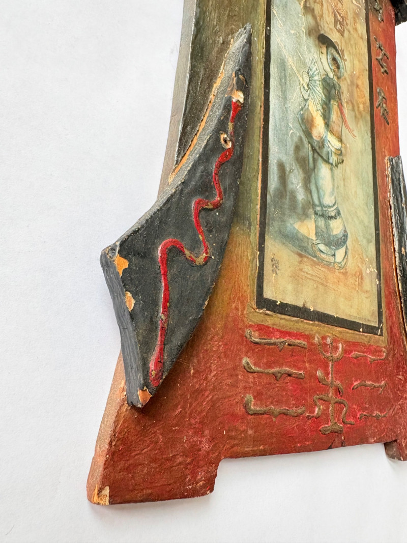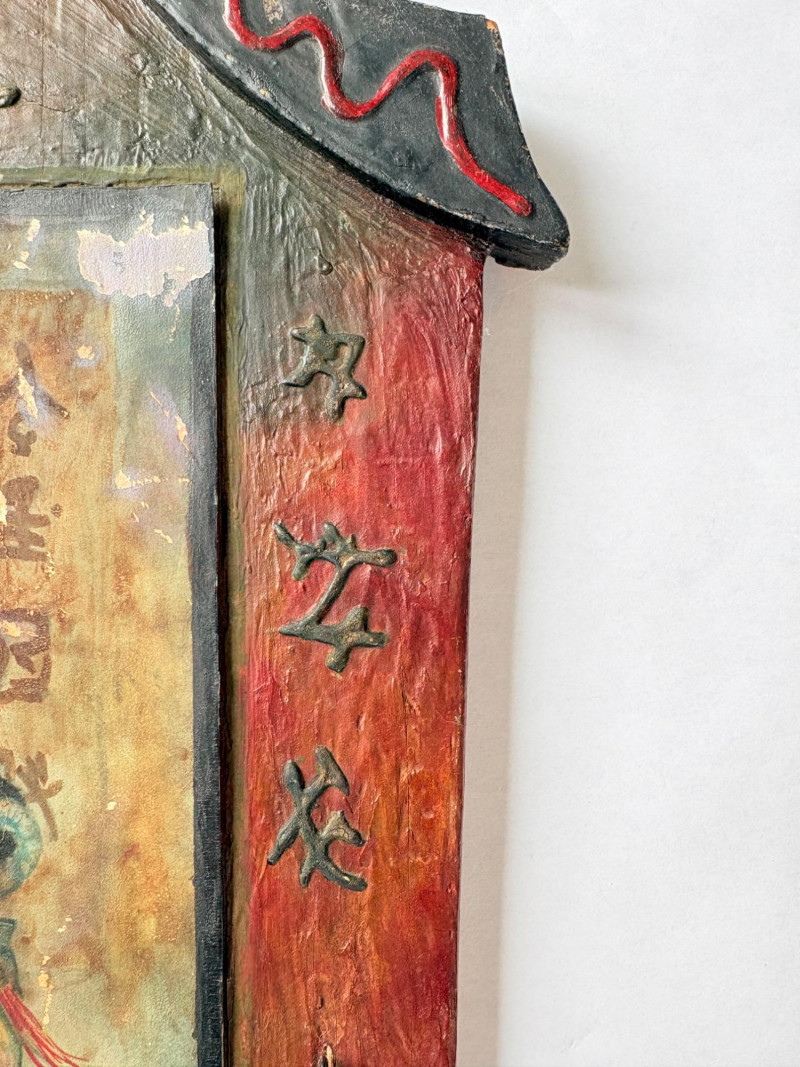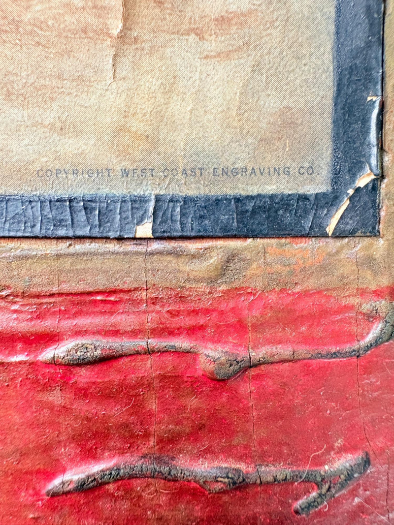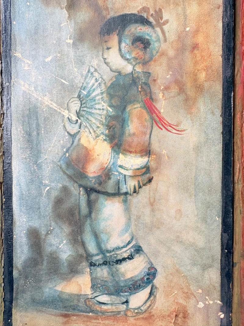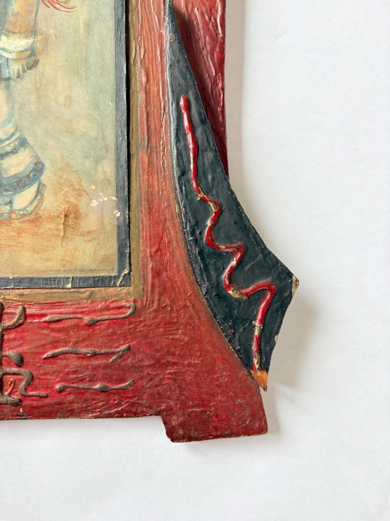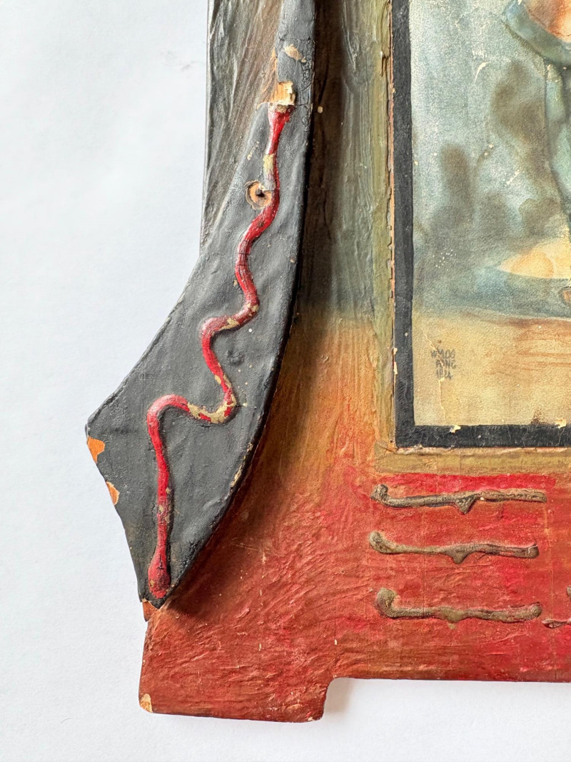 Unfortunately, we can't tell you anything about the history of this piece, but whatever its history, it is fabulous! We think this is a home-made piece of art incorporating an Asian figure print (circa 1924) mounted on a plywood backing with flourishes of pseudo-Asian-style wood pieces resembling architecture. 3-D paint has been applied for effect. The original print was done for West Coast Engraving Company as seen on the lower right of the print. This is truly a unique piece that speaks of loving creation as opposed to slick manufacture. Measures 19.5" H x 11" W and is approx. 1" D.
