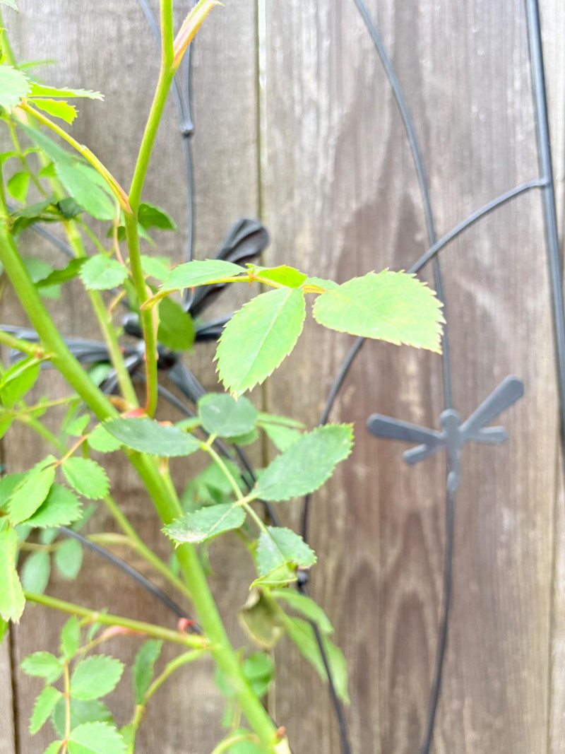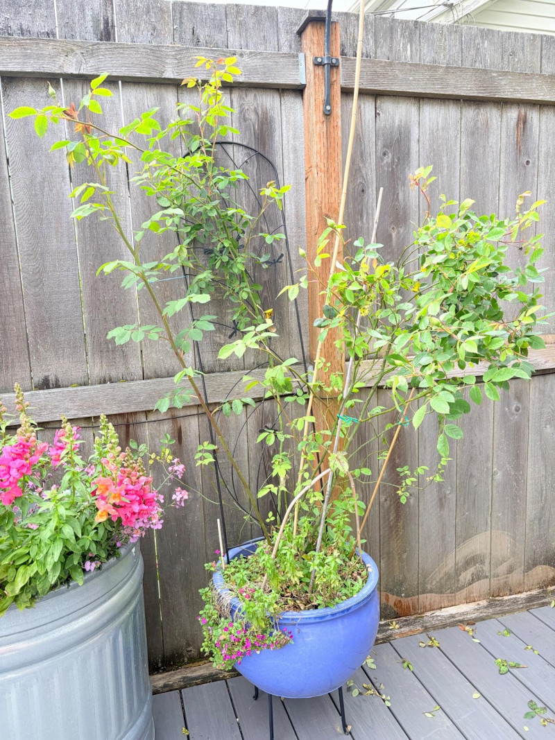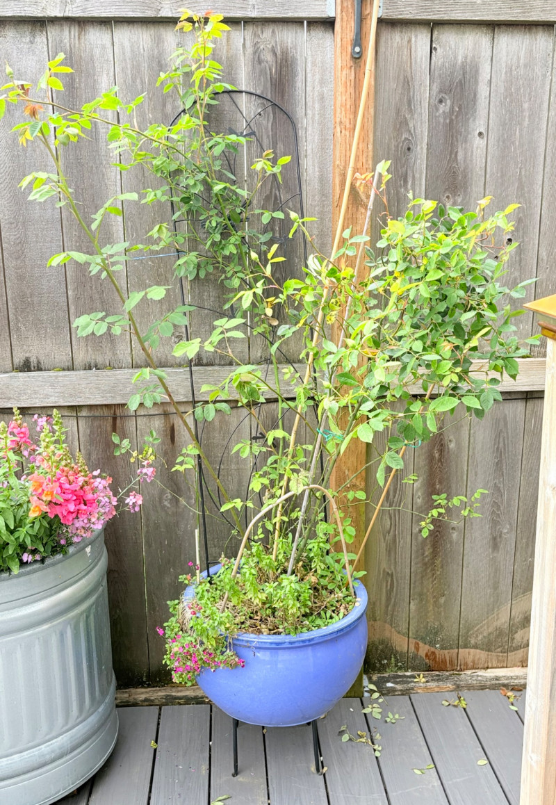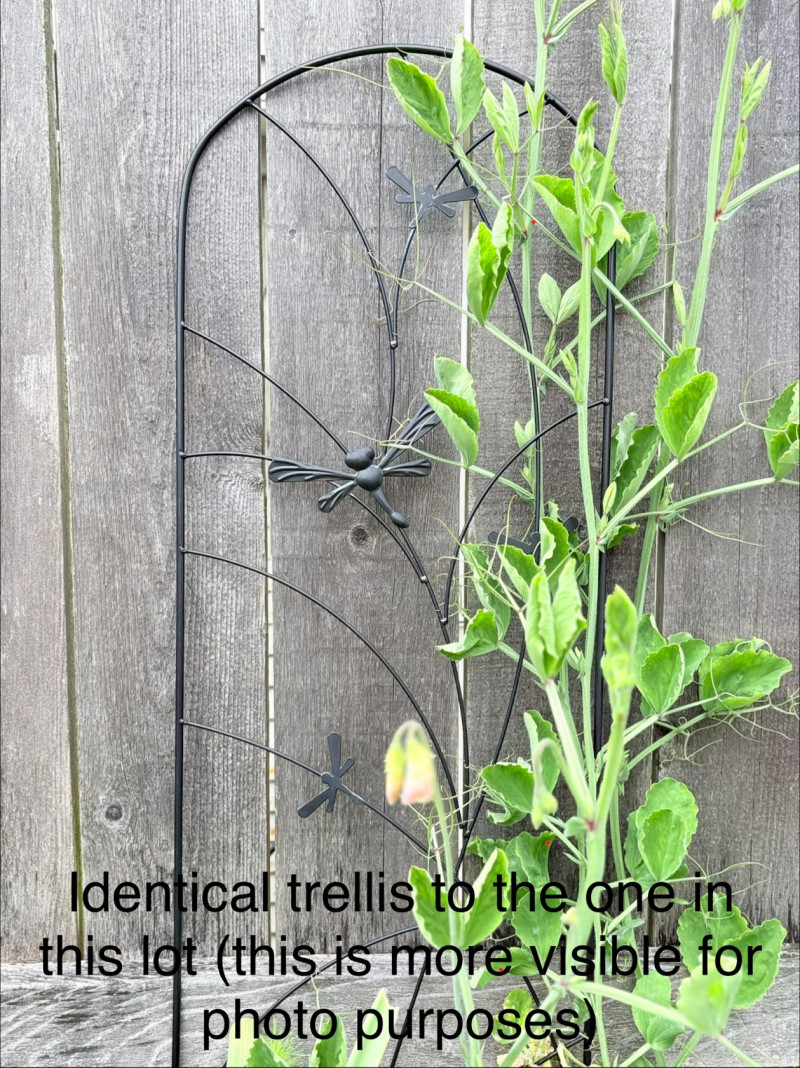 Large purple ceramic pot with climbing rose & black metal trellis. This rose is currently very healthy after taking a beating with the snow last month. It is growing great guns and has a lovely black dragonfly trellis to support it. The pot & stand are sizeable (18" H) and the trellis is approx. 48" H from the soil level. This plant is ready to grace anther back yard and climb!