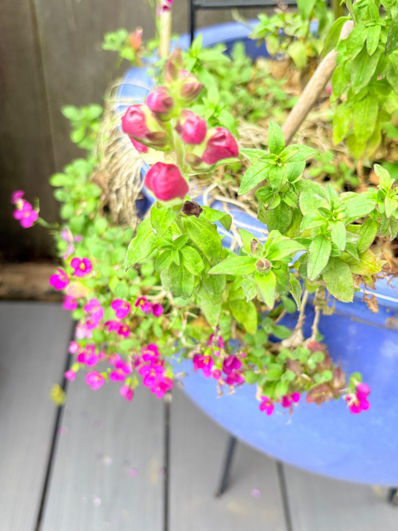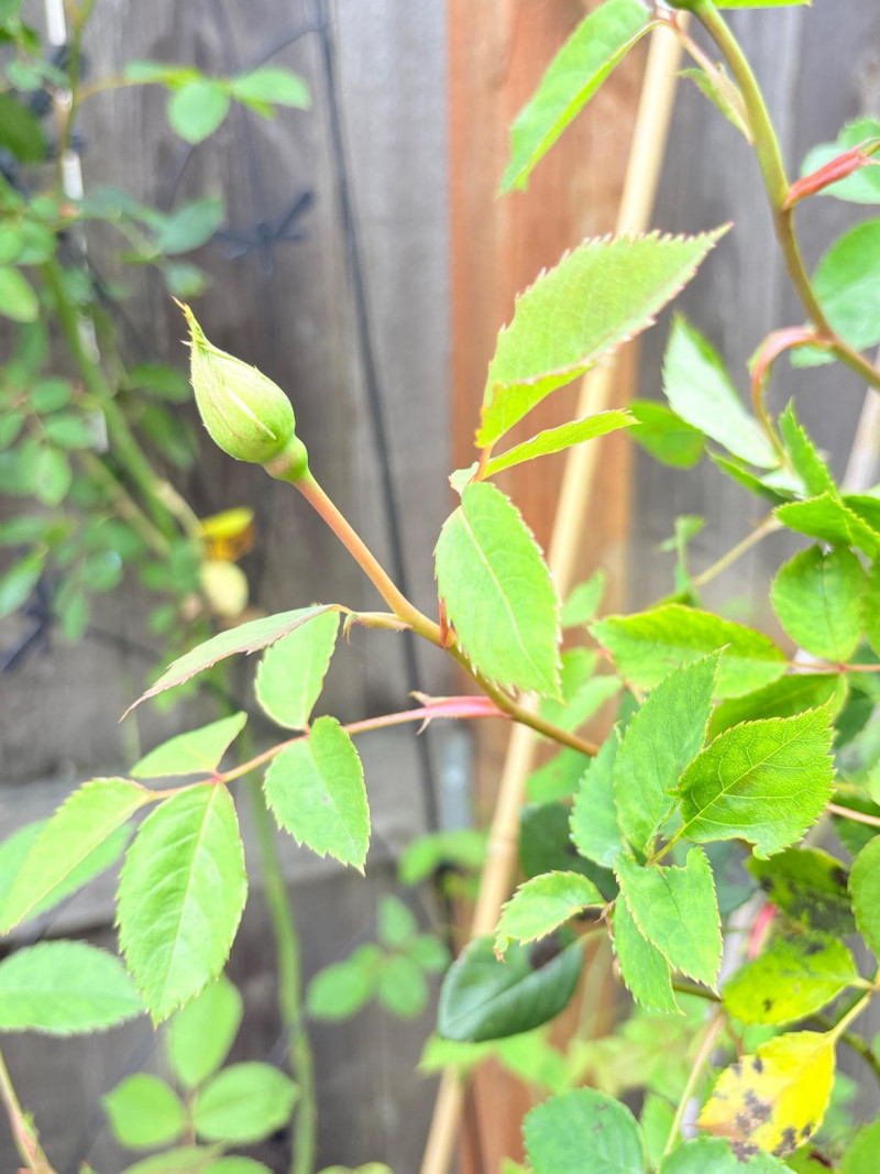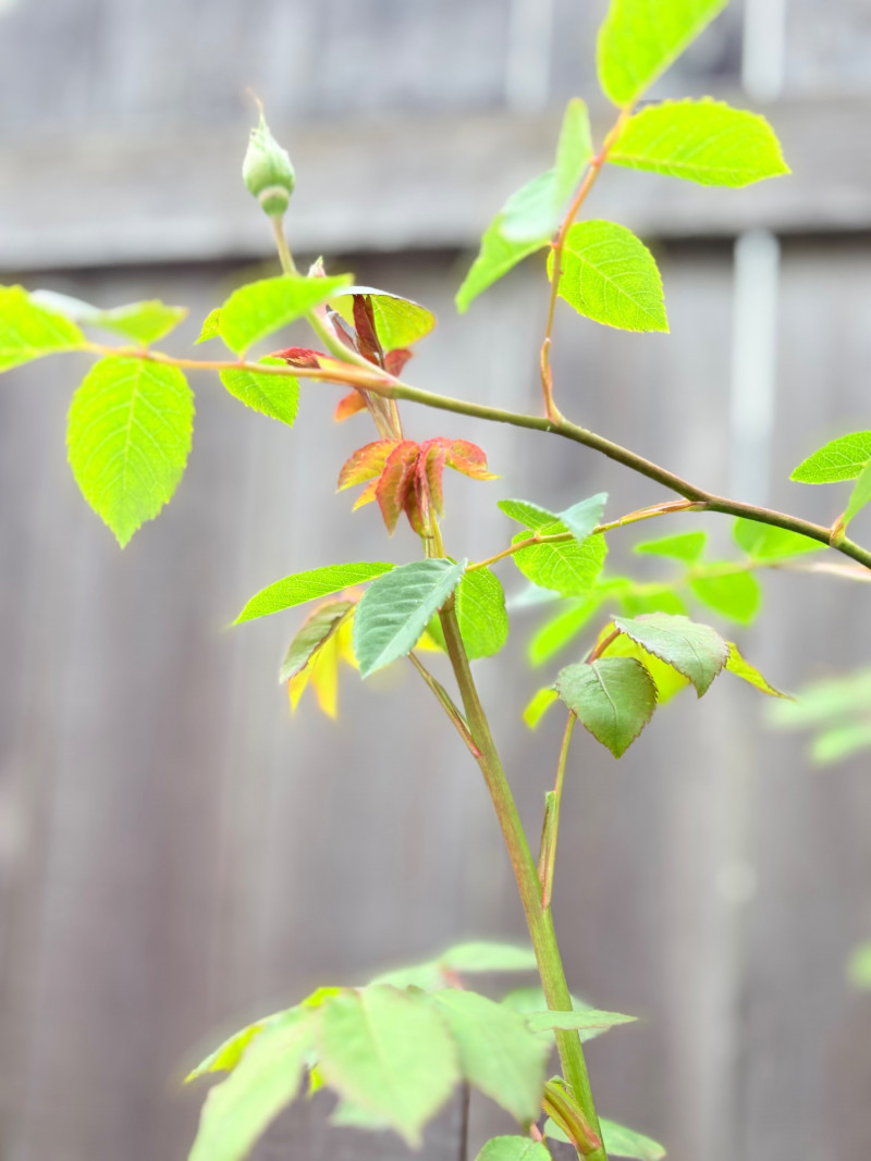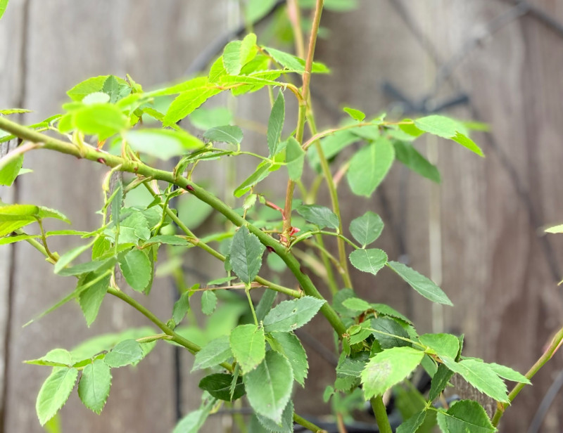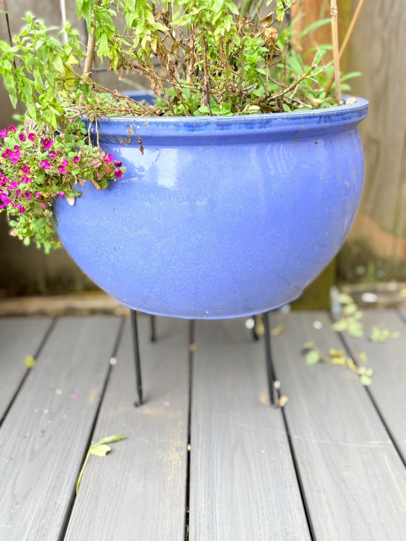 Large purple ceramic pot with climbing rose & black metal trellis. This rose is currently very healthy after taking a beating with the snow last month. It is growing great guns and has a lovely black dragonfly trellis to support it. The pot & stand are sizeable (18" H) and the trellis is approx. 48" H from the soil level. This plant is ready to grace anther back yard and climb!