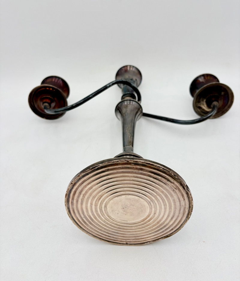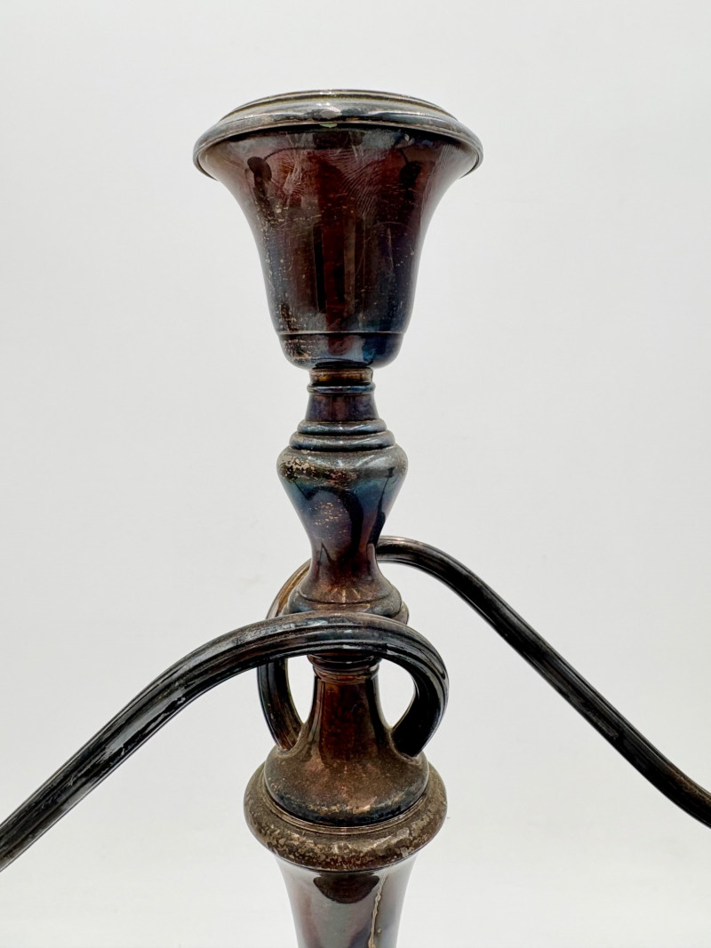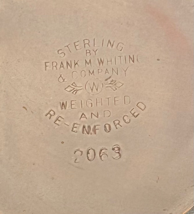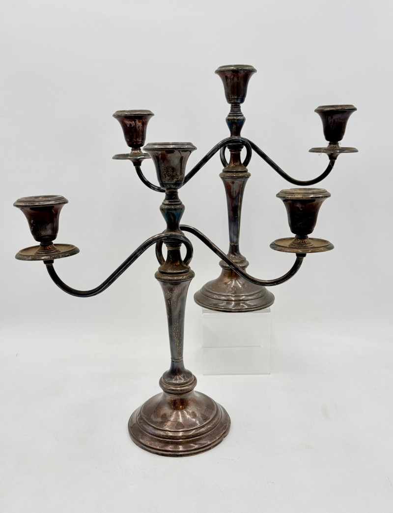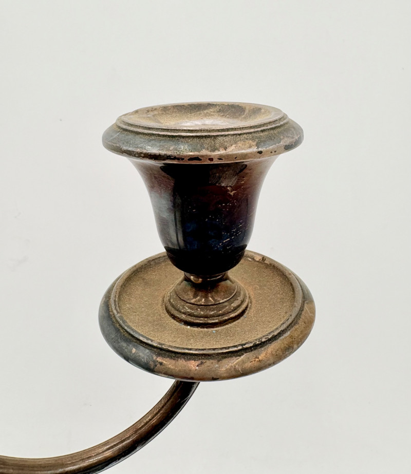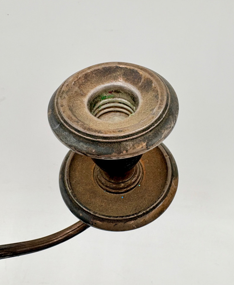 This pair of antique swooping elegant candlesticks are from Frank M. Whiting. Model # 2063. They are sterling weighted and re-enforced (they are not solid sterling). The elegant curve to the arms are very reminiscent of Art Nouveau styles of the early 20th C. Very sturdy with the only noticeable flaw being a single dent in the base edge of one stick - see last photo. In dire need of a good polish, these would make an elegant addition to any table. Candlesticks measure 13.5" H x 14" W from arm end to arm end.