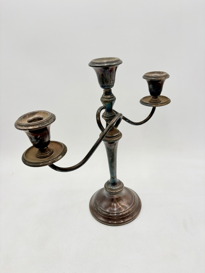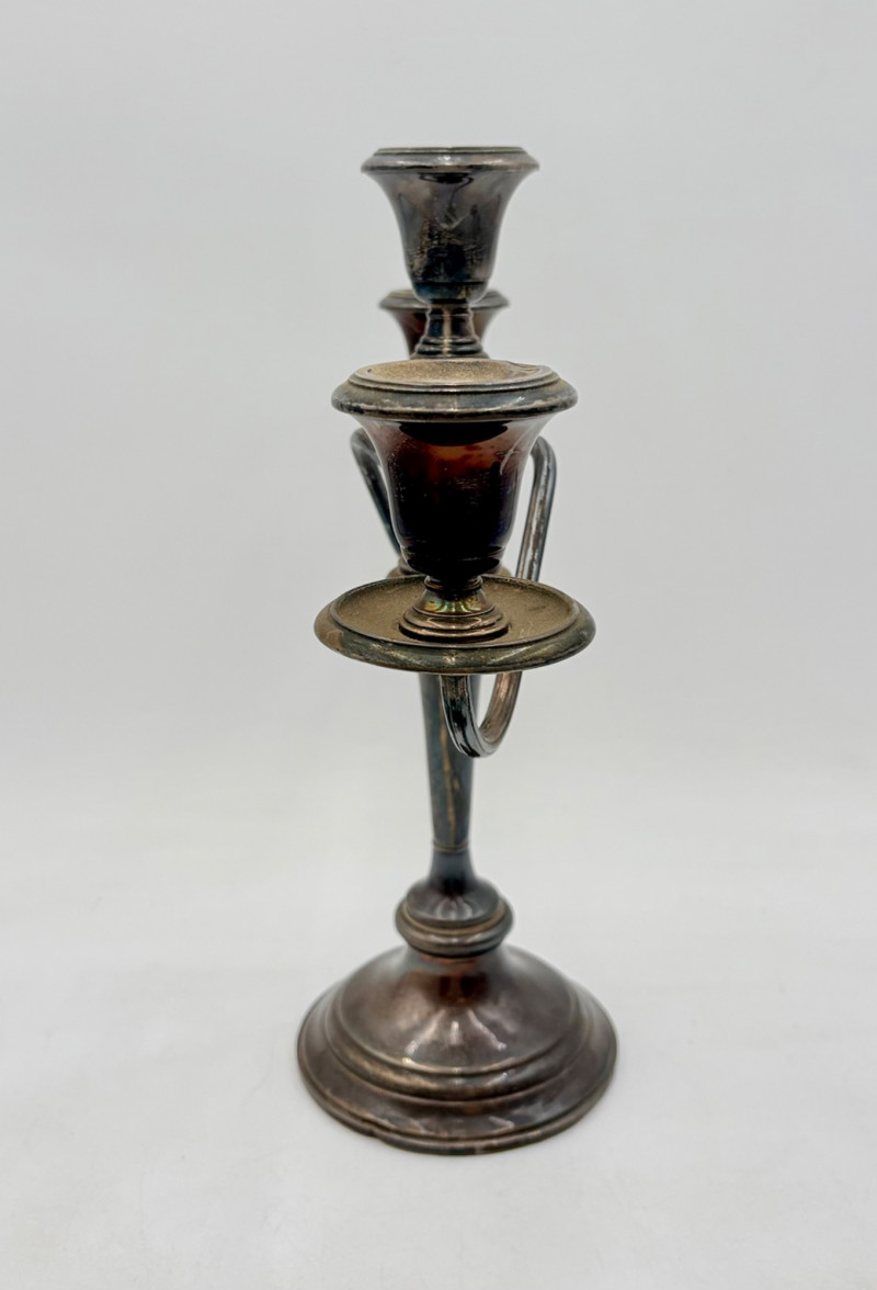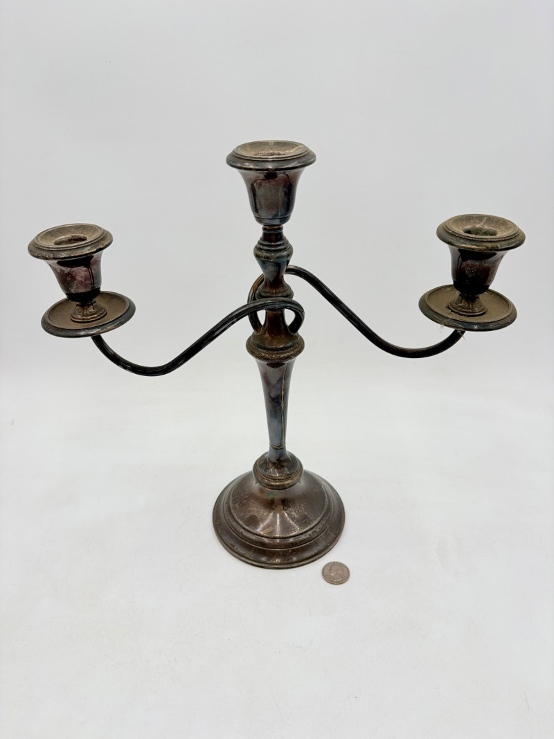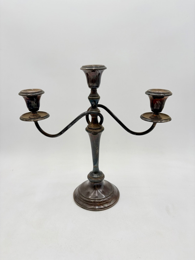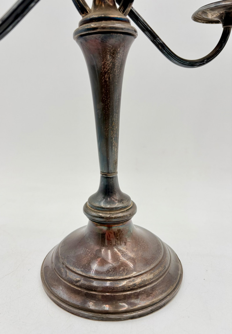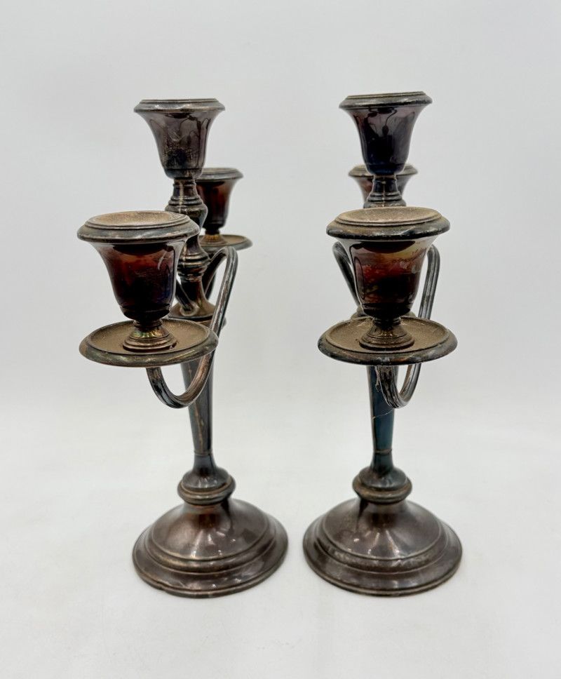 This pair of antique swooping elegant candlesticks are from Frank M. Whiting. Model # 2063. They are sterling weighted and re-enforced (they are not solid sterling). The elegant curve to the arms are very reminiscent of Art Nouveau styles of the early 20th C. Very sturdy with the only noticeable flaw being a single dent in the base edge of one stick - see last photo. In dire need of a good polish, these would make an elegant addition to any table. Candlesticks measure 13.5" H x 14" W from arm end to arm end.